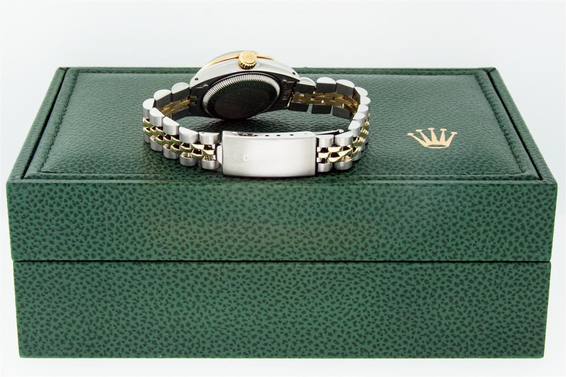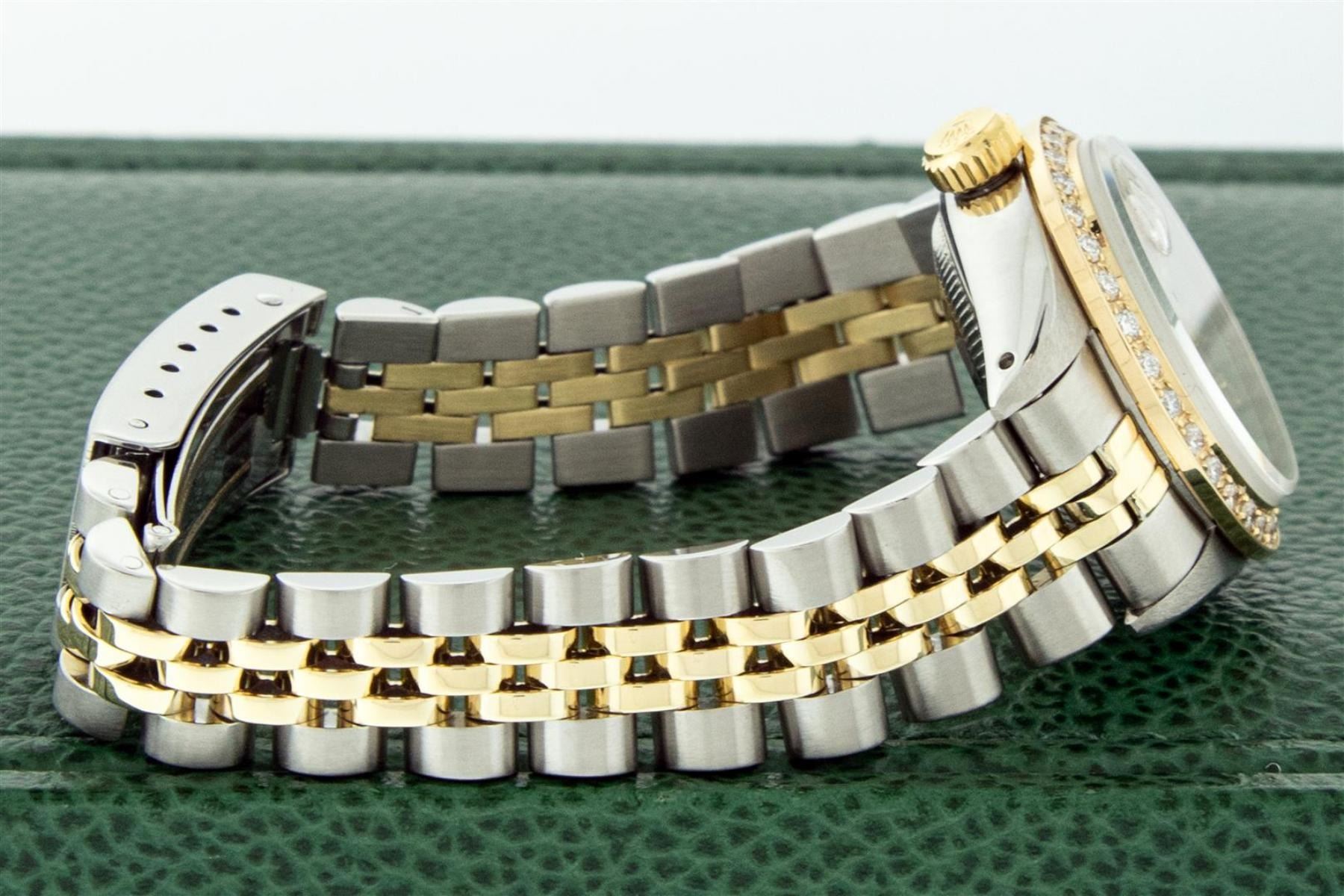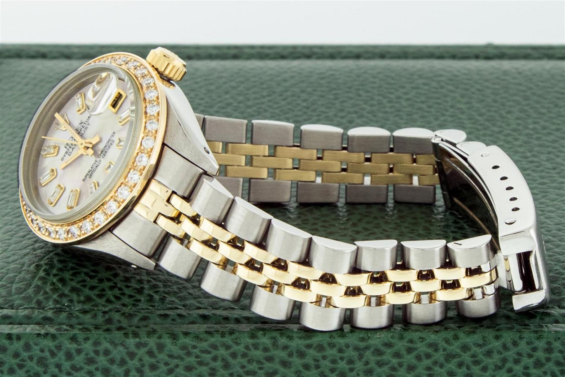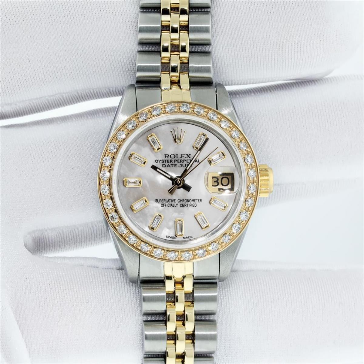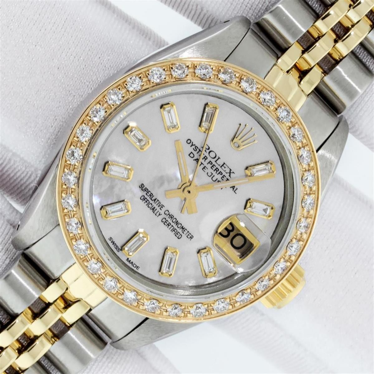 One Ladies Two Tone Yellow Gold And Stainless Steel Rolex Datejust Polished, Serviced & Electronically Tested, Yellow Gold & Stainless Steel Case: 26mm, Yellow Gold Crown, Custom Bezel: New 18K Yellow Gold Beadset Diamond Bezel, Diamond Count: 32 Diamonds On Bezel, Total Weight .70 Carat, Clarity: SI-VS, Color: G to H. Custom Crystal: New Scratch Resistant Synthetic Sapphire Cyclops Lens. Custom Hands: New Luminescent Hands. Movement: Automatic Winding Movement. Custom Dial: MOP Baguatte Diamond Dial, Diamond Count: 10 Baguette Diamonds On Dial, G To H In Color, SI-VS Clarity. Date Window: 3 O'Clock Position Date Display, Model: Datejust, Condition: G-6 Extra Fine. Bracelet: Two Tone Yellow Gold & Stainless Steel Jubilee Band. Bright Polish. 6.0 Inch Length, Adjustable. Standard Clasp, With Rolex Logo. This Watch Has Been Serviced Time Tested And Is In Excellent Condition It Is Free Of All Scratches And Dents.