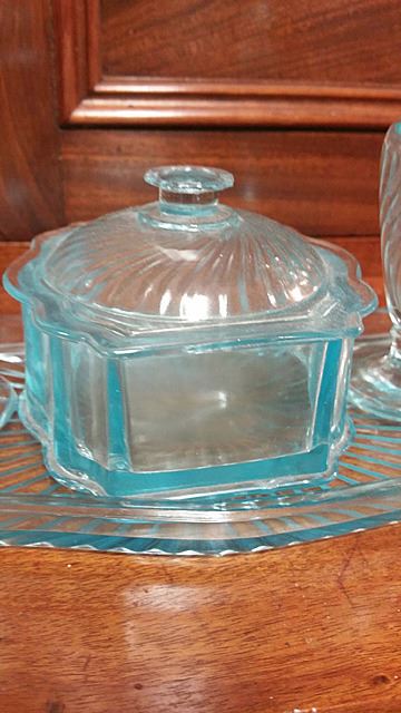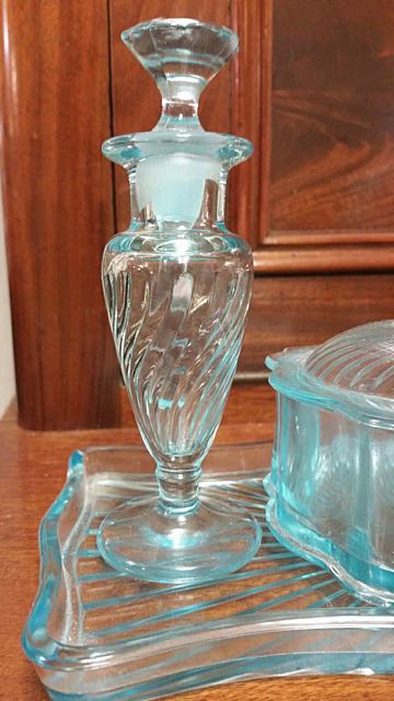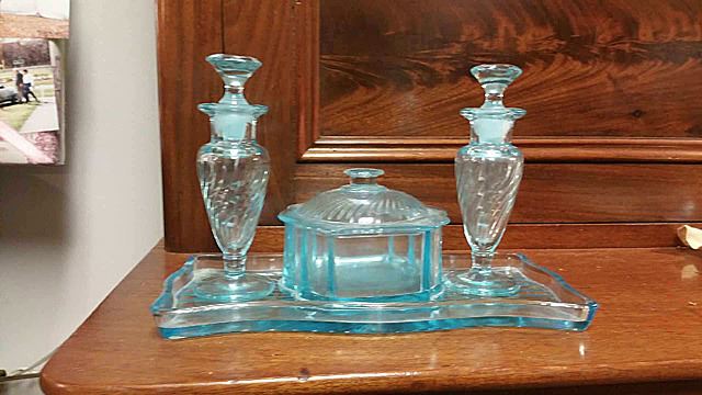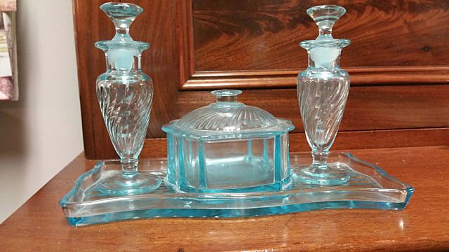 Ladies Depression Glass Dresser Set in Ice Blue color, includes 2 perfume bottles with stoppers, covered jewelry box, and matching tray. Possibly from the Cambridge Glass family.