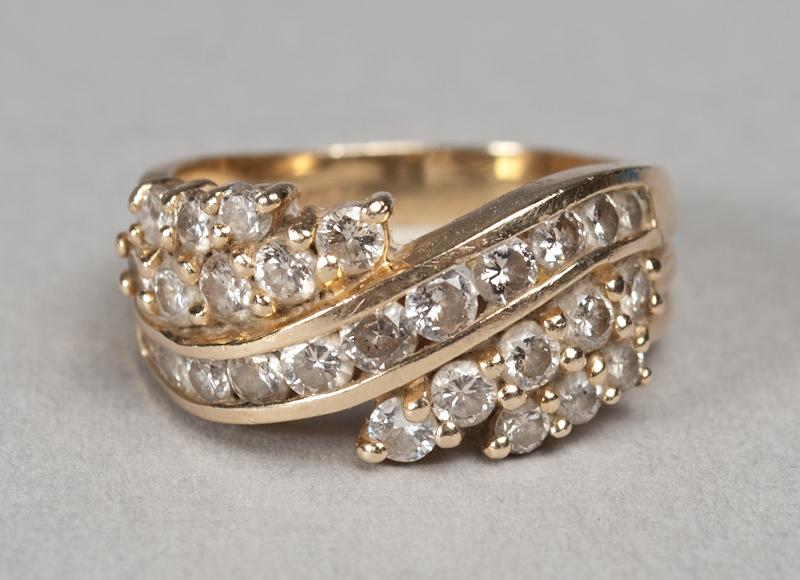 Size 7.5. Set with 27 round full cut diamonds, 1.25 cts total weight. Clarity grade: VS-2 to Imp-1, color range J & K. 6.6 grams total weight. Replacement value $1825, appraisal on file.