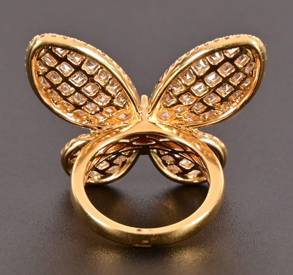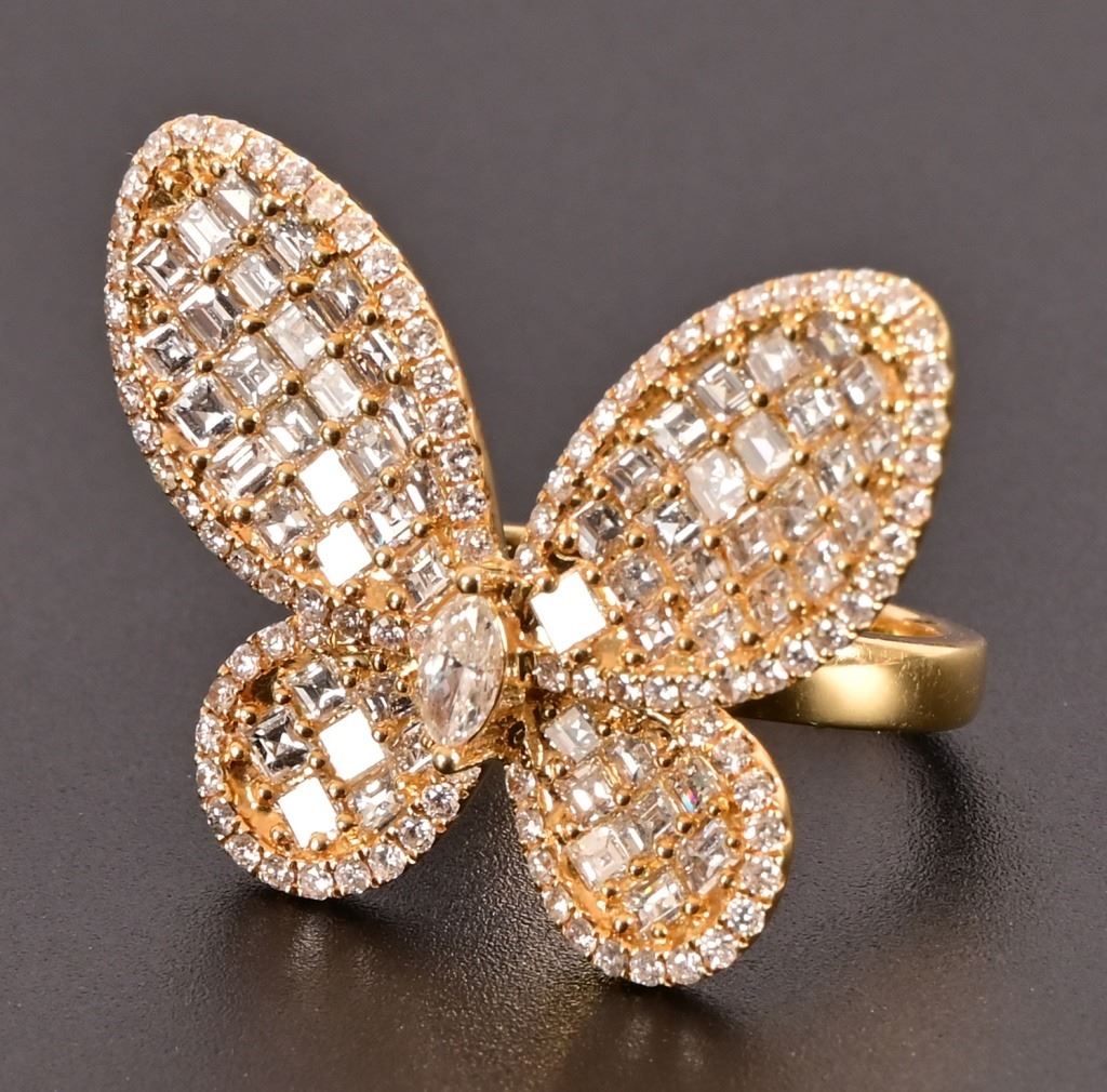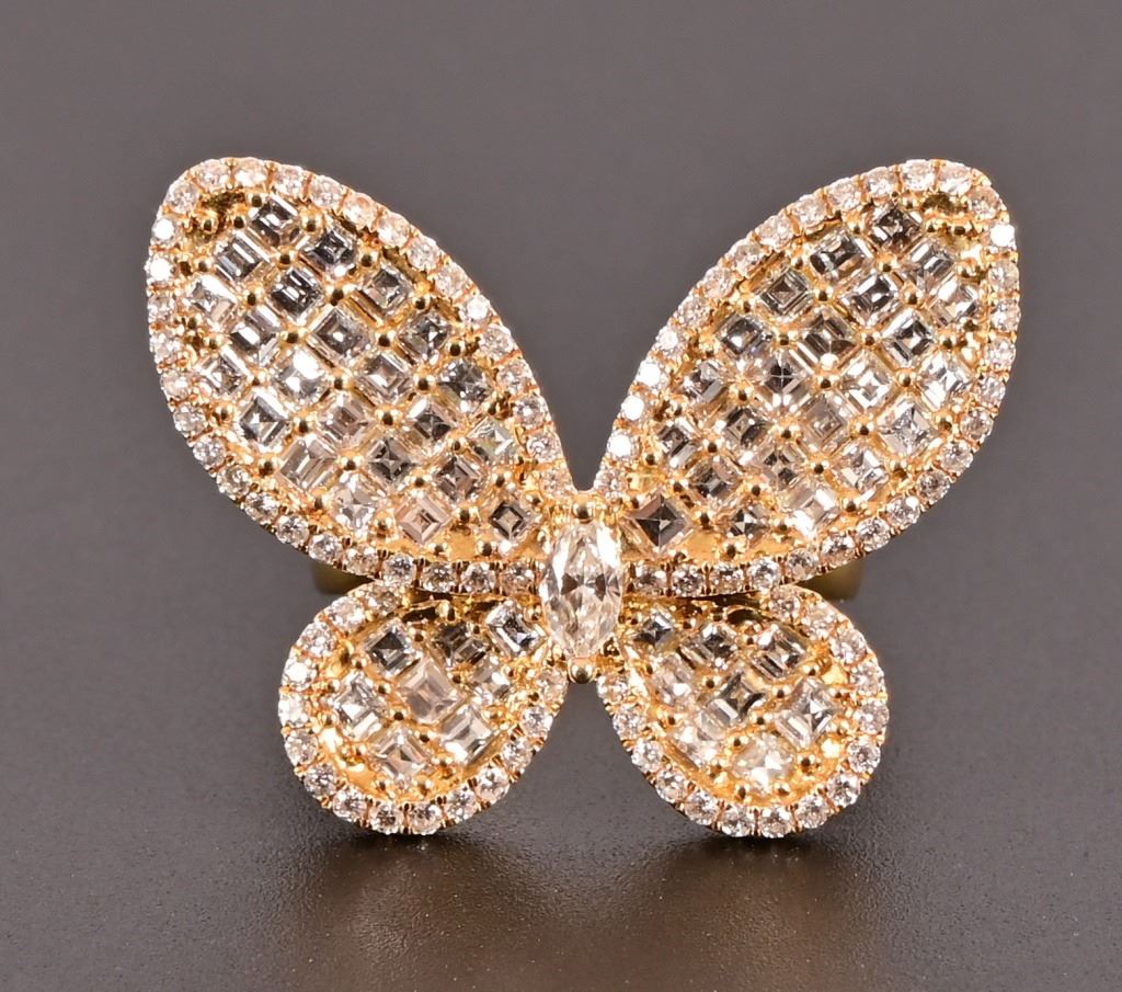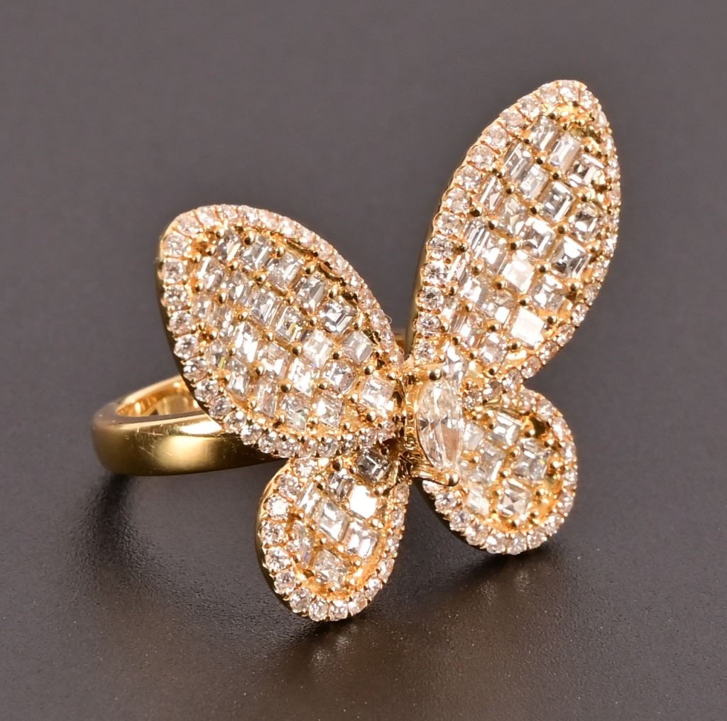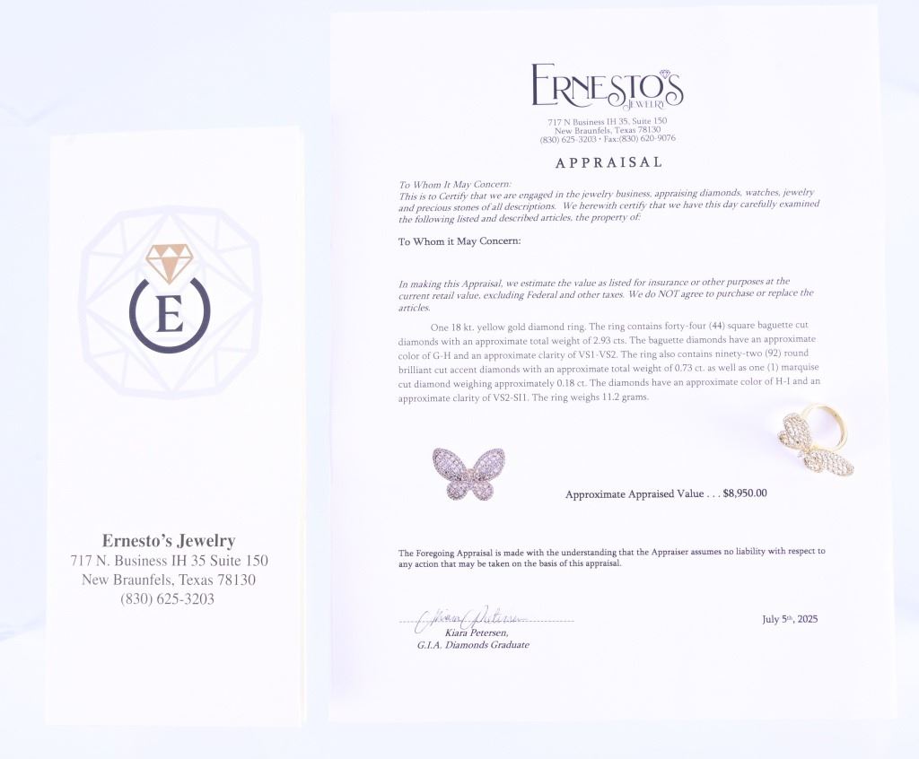 With Appraisal: "One 18 kt. yellow gold diamond ring. The ring contains forty-four (44) square baguette cut diamonds with an approximate total weight of 2.93 cts. The baguette diamonds have an approximate color of G-H and an approximate clarity of VS1-VS2. The ring also contains ninety-two (92) round brilliant cut accent diamonds with an approximate total weight of 0.73 ct. as well as one (1) marquise cut diamond weighing approximately 0.18 cts. The diamonds have an approximate color of H-I and an approximate clarity of VS2-SI1. The ring weighs 11.2 grams." Approximate Appraised Value..$8,950.00