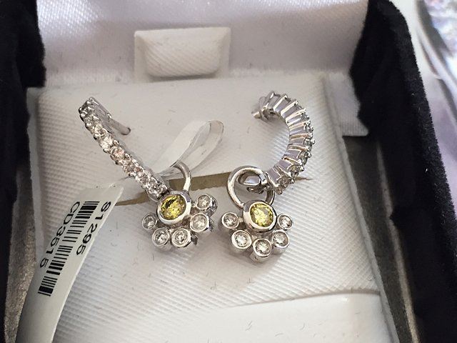 Ladies 14kt white gold diamond earrings, each with canary yellow diamond and accent diamonds. The 2 round Yellow (enhanced) diamonds have a total weight of .15ct (estimated) and clarity of VS2. 28 accent diamonds are round cut with a total weight of .31ctw (estimate) with a clarity of VS2/SI2 and color of GHI. Appraised with an estimated retail replacement cost of $2,000.00. New with original tags, owner purchased to collect.