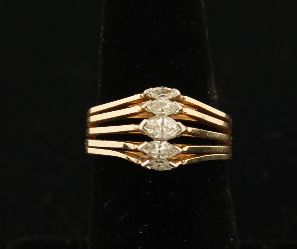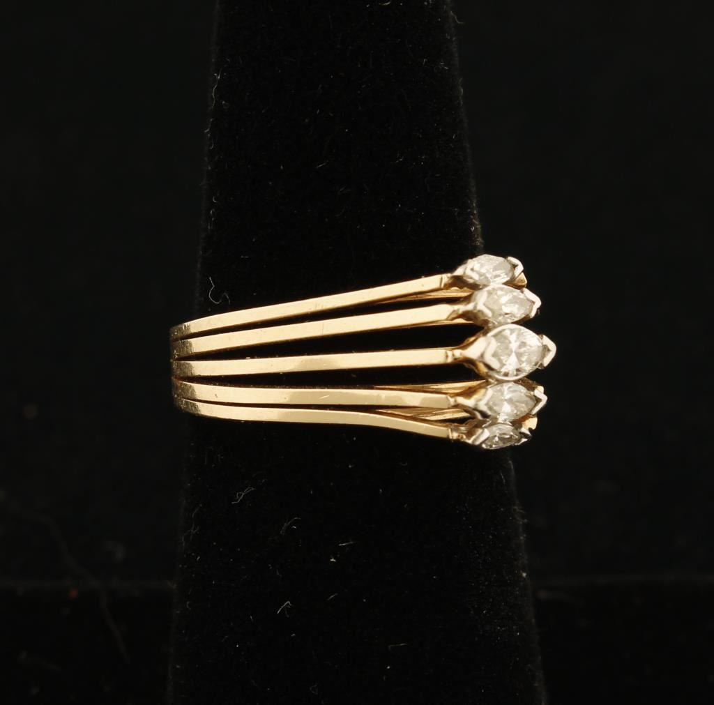 with 5 Marquise cut diamonds set in sparkling 14Kt yellow gold, Size 5, From a New Mexico Estate.