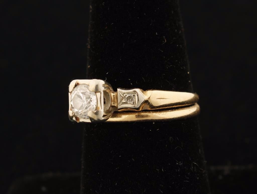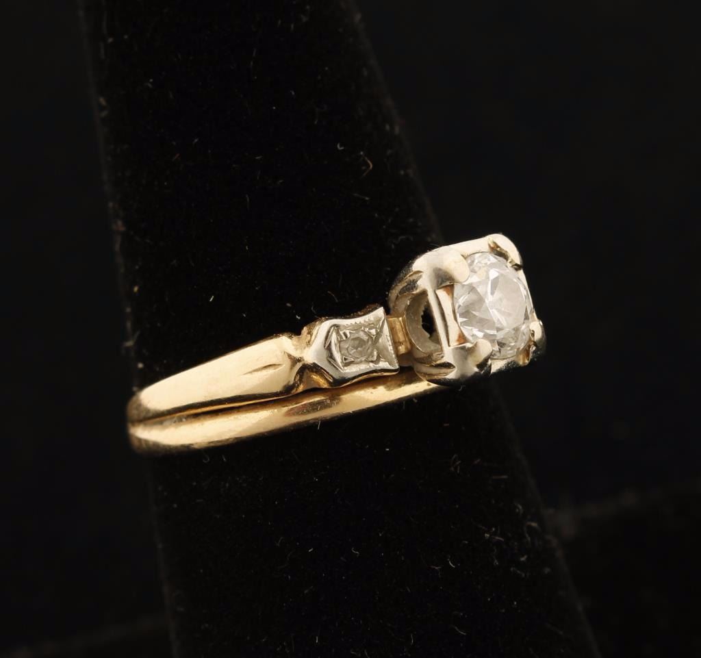 Center round cut stone is under 1/2 carat total with two small side Diamonds set in 14KT yellow gold with attached band.
