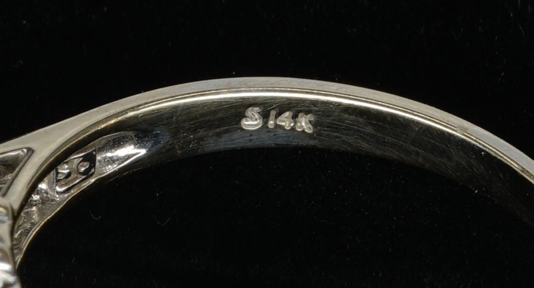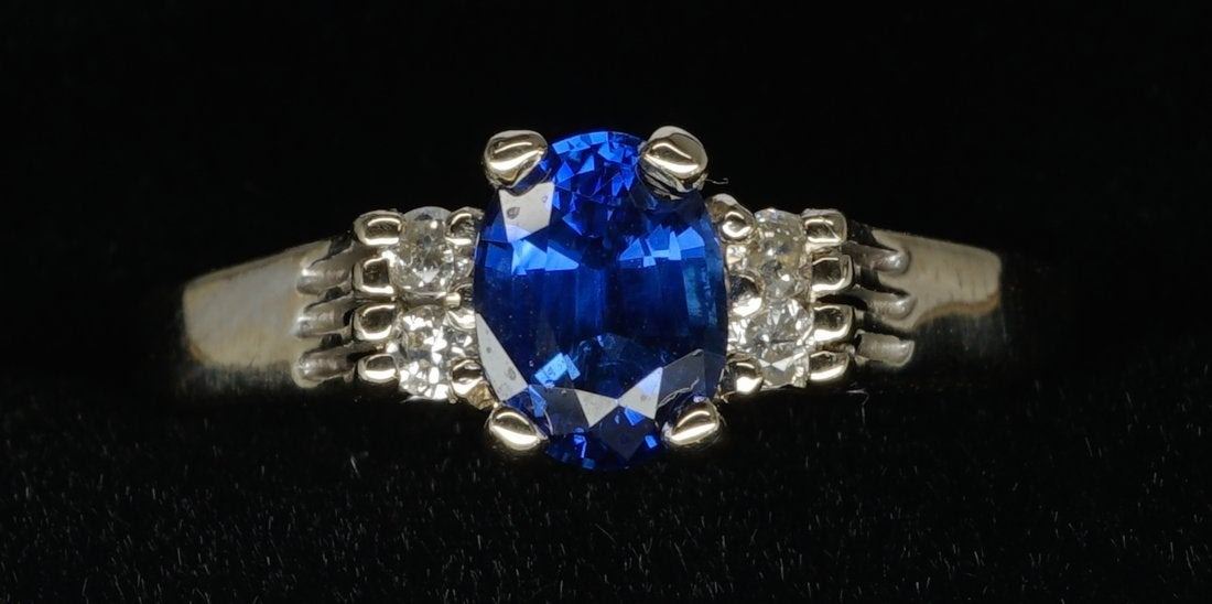 14 carat white gold .64 carat Sapphire, .08 carat diamonds. Ring size 6.75.