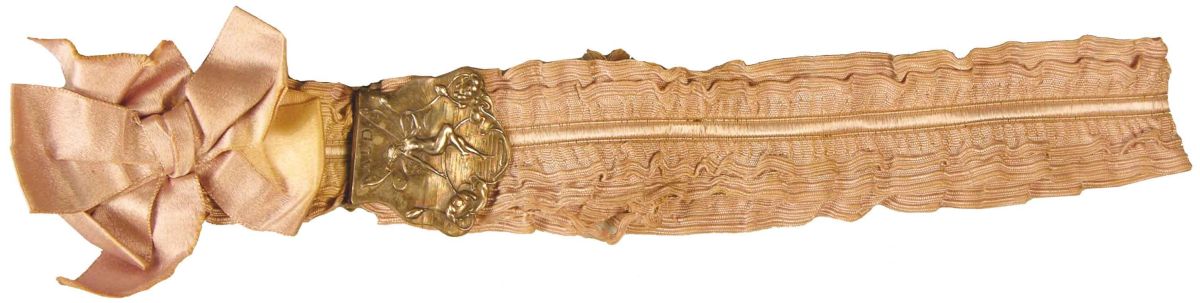 Ladies Garter with silver plated clip repose nude angel, initials A.L.D. Good condition. 10 inches long.