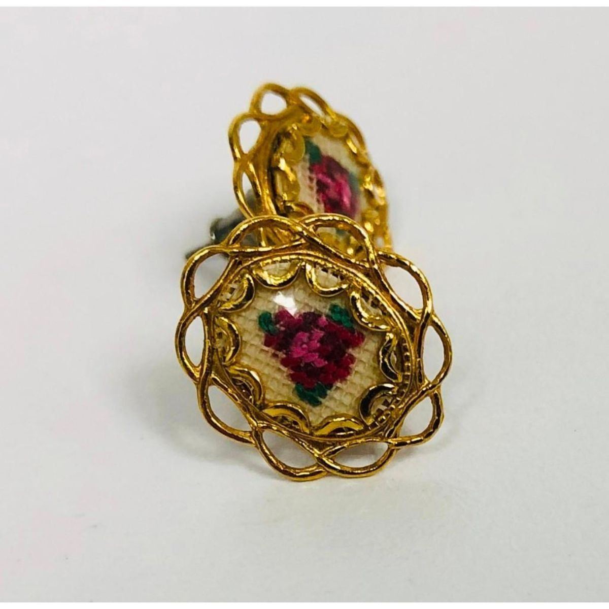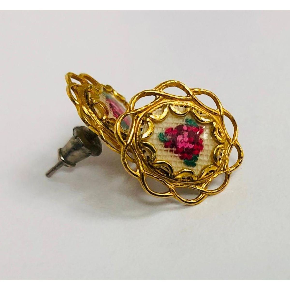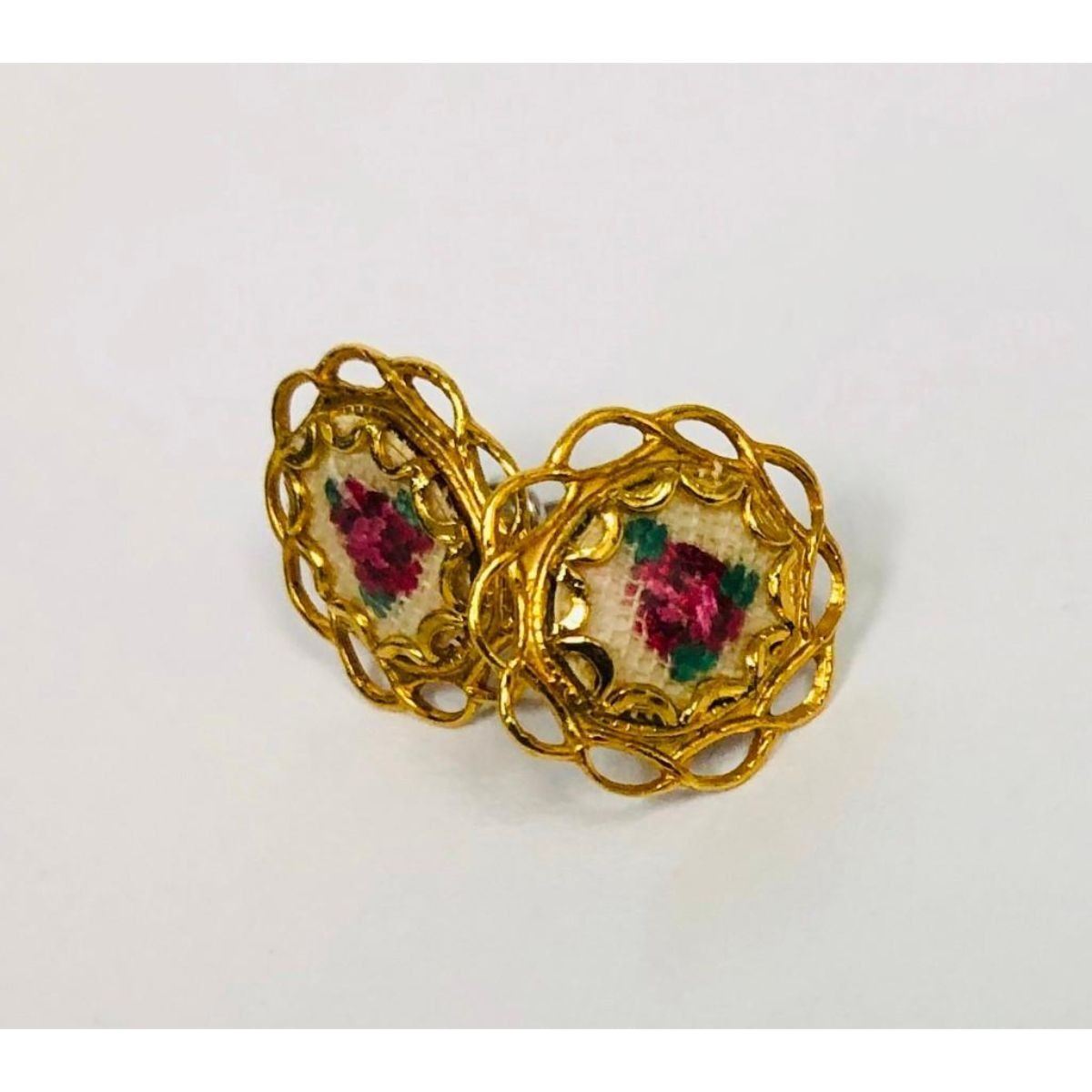 Ladies Hand Embroidered Floral Earrings Mounted In An 18K Gold Plated Encasement. These Unique Hand Embroidered Floral Earrings Are A Rare Find! A Lot Of Time Was Obviously Put Into Making This Beautiful Pair.Â