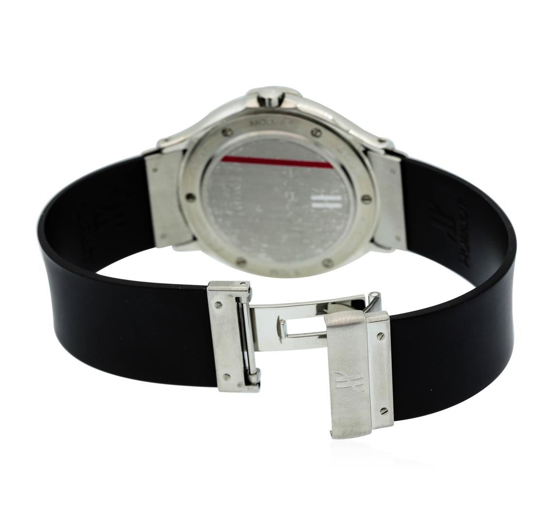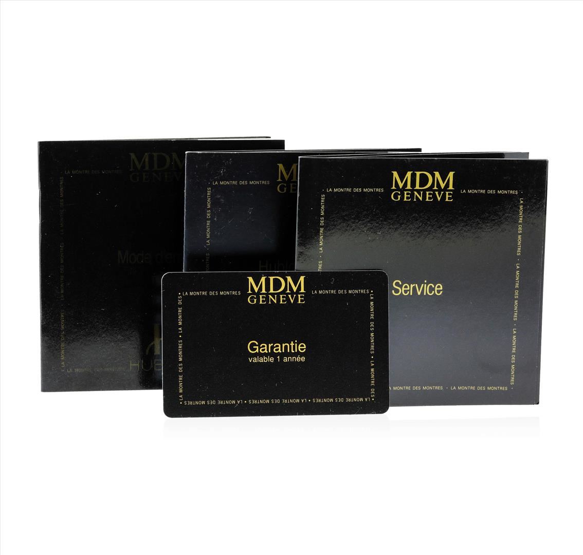 Ladies Hublot Classic MDM Quartz Watch with Midnight Blue Dial. This watch is in very good working condition, and this watch has the following attributes: Case: Stainless Steel approximately 35mm wide, Dial: Midnight Blue, DateWheel: White with Black Numbers, Bracelet: Black Rubber Band with Double deployment stainless steel clasp. The watch comes with warranty book and papers.