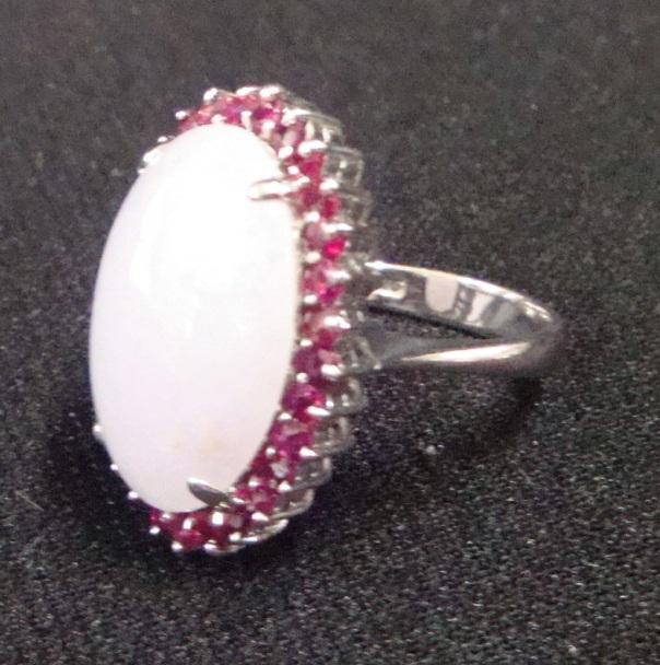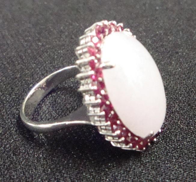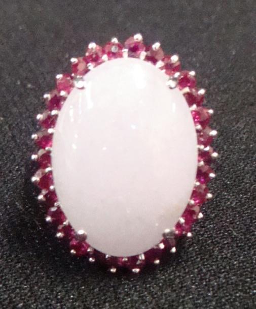 Magnificent ring set in 14k white gold. Large lavender jade oval center that measures 22x16mm. Then surrounded by 30 2.25mm round rubies. Lovely ring with a replacement value of $1295