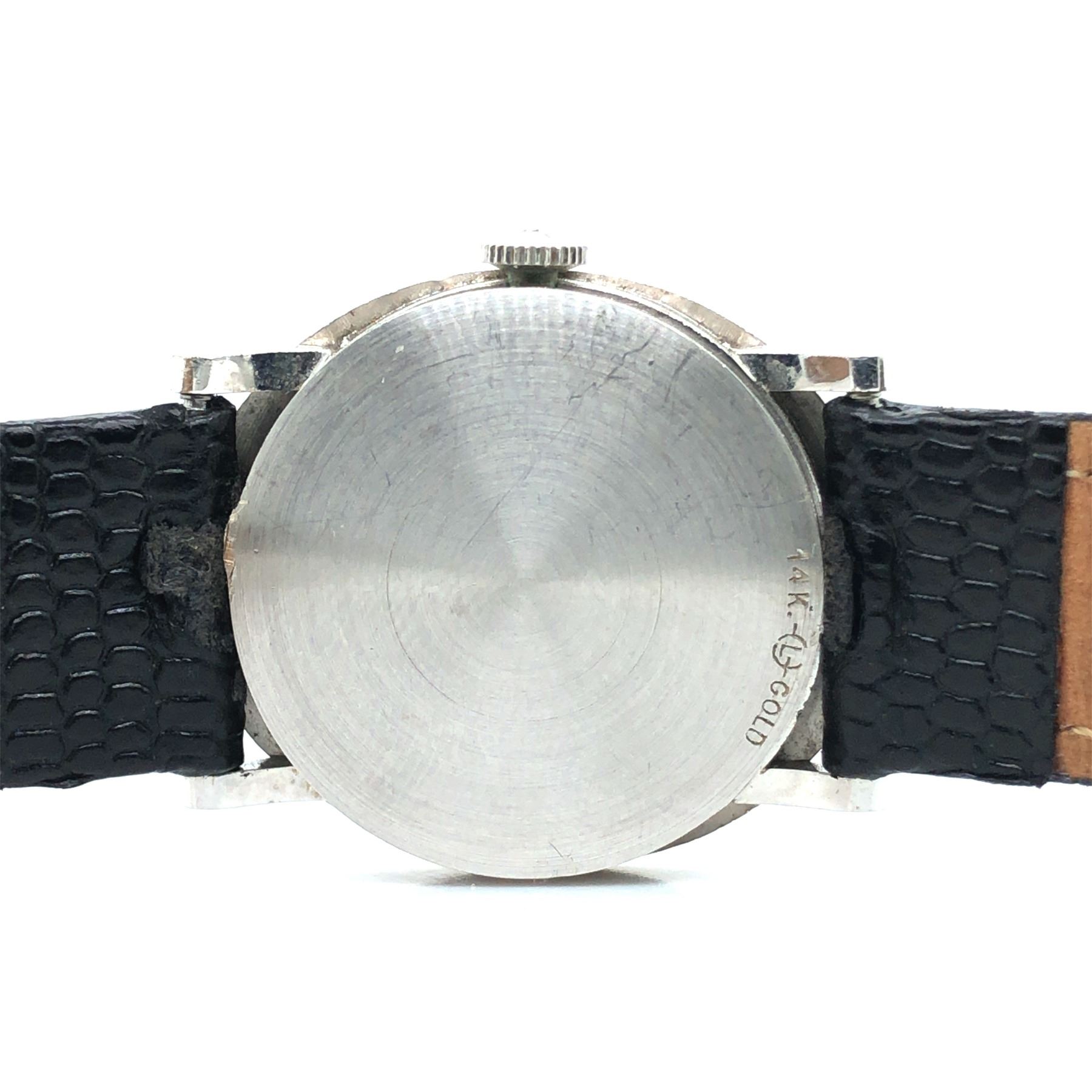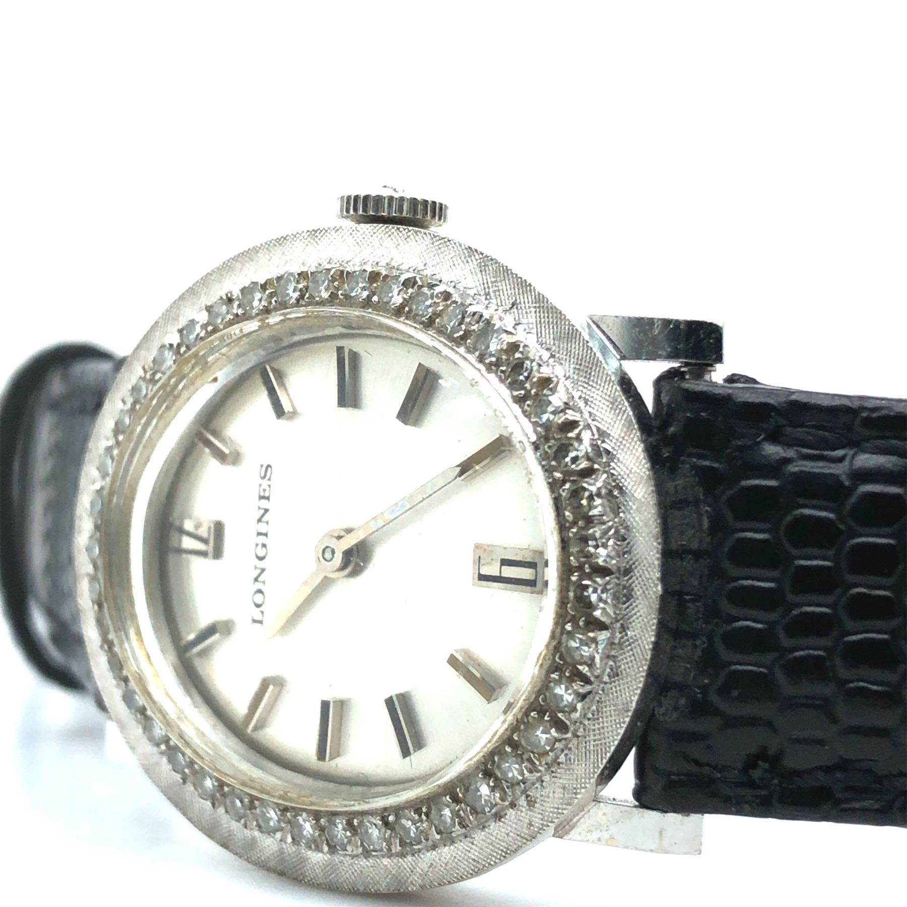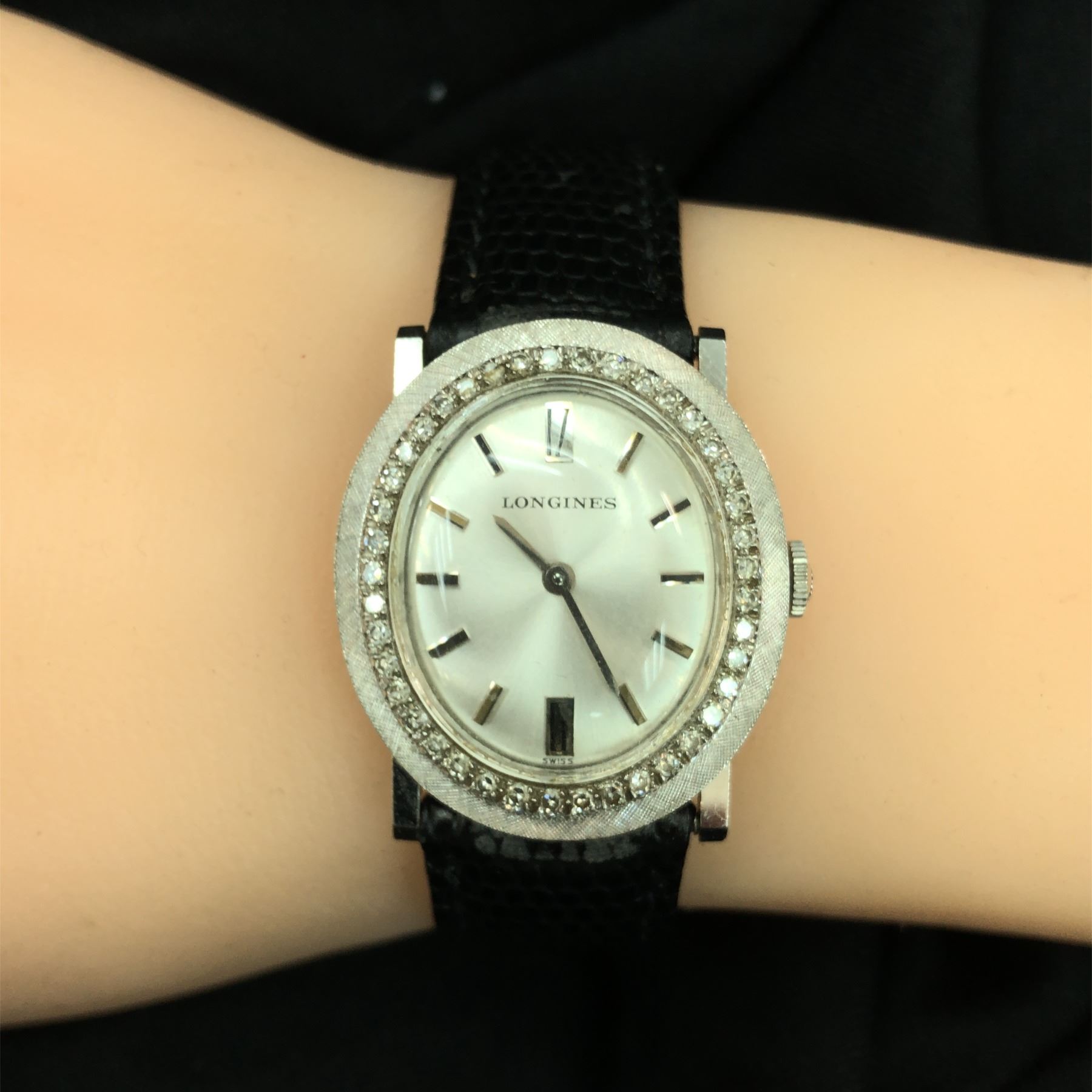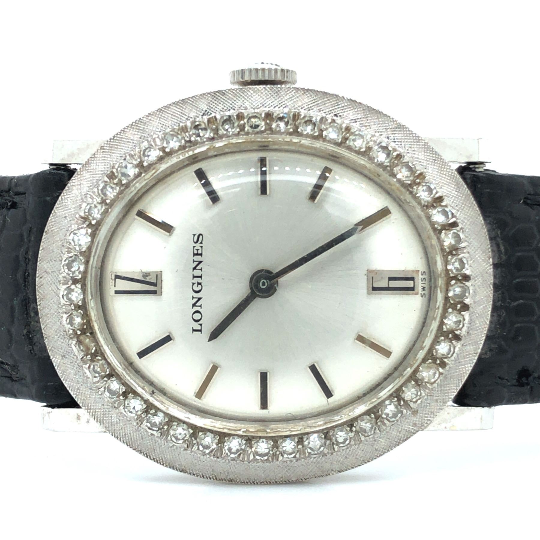 Longines Watch. This vintage 14 karat white gold and diamond Swiss Longines Wittnaur watch is fabulous! It has a 17 jewel, manual wind Swiss movement and the watch runs when wound. The case features a silver dial with baton markers on the hours, except for the ultra-artsy & quot;12& quot; and & quot;6& quot; hour. The crystal is in excellent condition and has a genuine diamond bezel. The crown bears the Longines logo. The watch is approximately 30 mm x 25 mm and is slim at 6.5 mm. The strap is a replacement black leather band with a silver tone buckle. This is a preowned, estate item in excellent condition. There is no box or papers with this watch.
