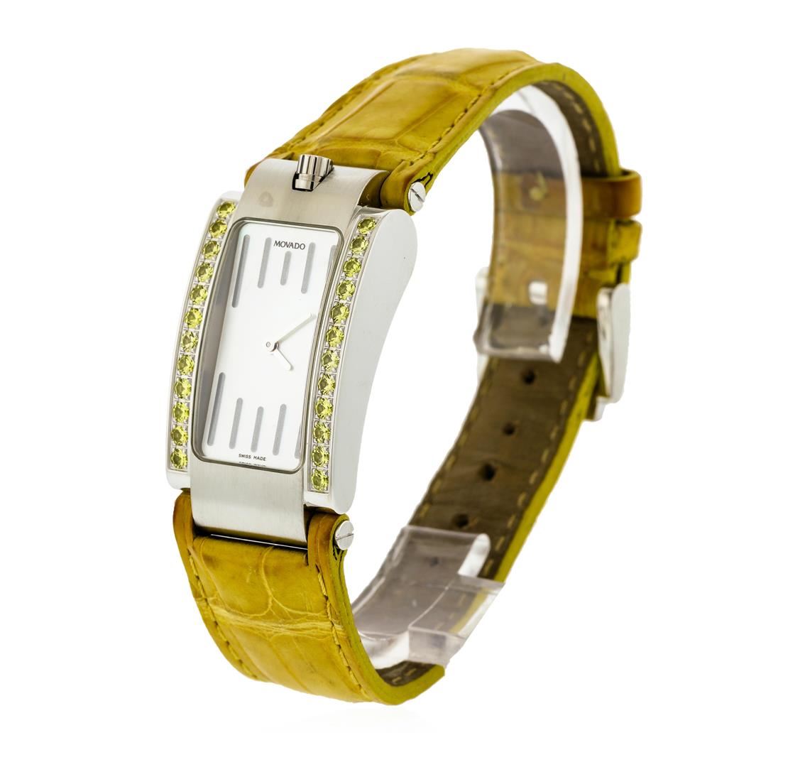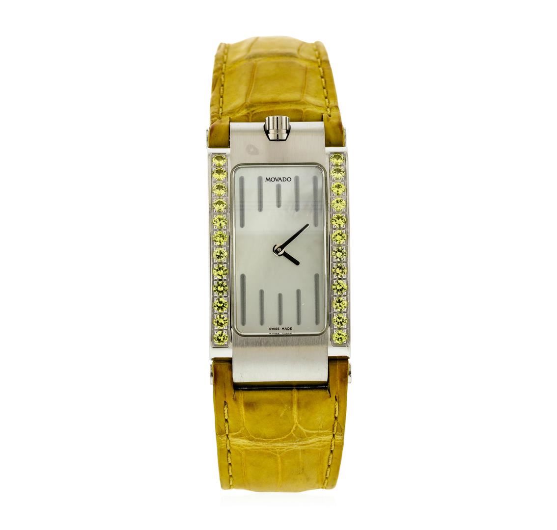 One Ladies Movado Elliptica Wristwatch with Yellow Gemstone Dial. The watch is in good used condition and has the following features: Movement: Swiss Quartz, Case Size: 20mm x 38mm, Case Material: Stainless Steel, Bracelet Material: Original Genuine Alligator Leather Strap, Gender: Ladies, Crystal Material: Sapphire, Dial: Mother of Pearl with Silver Markers, Bezel: Yellow Gemstones on each side. This watch does not come with a box or papers however we do guarantee it to be authentic.