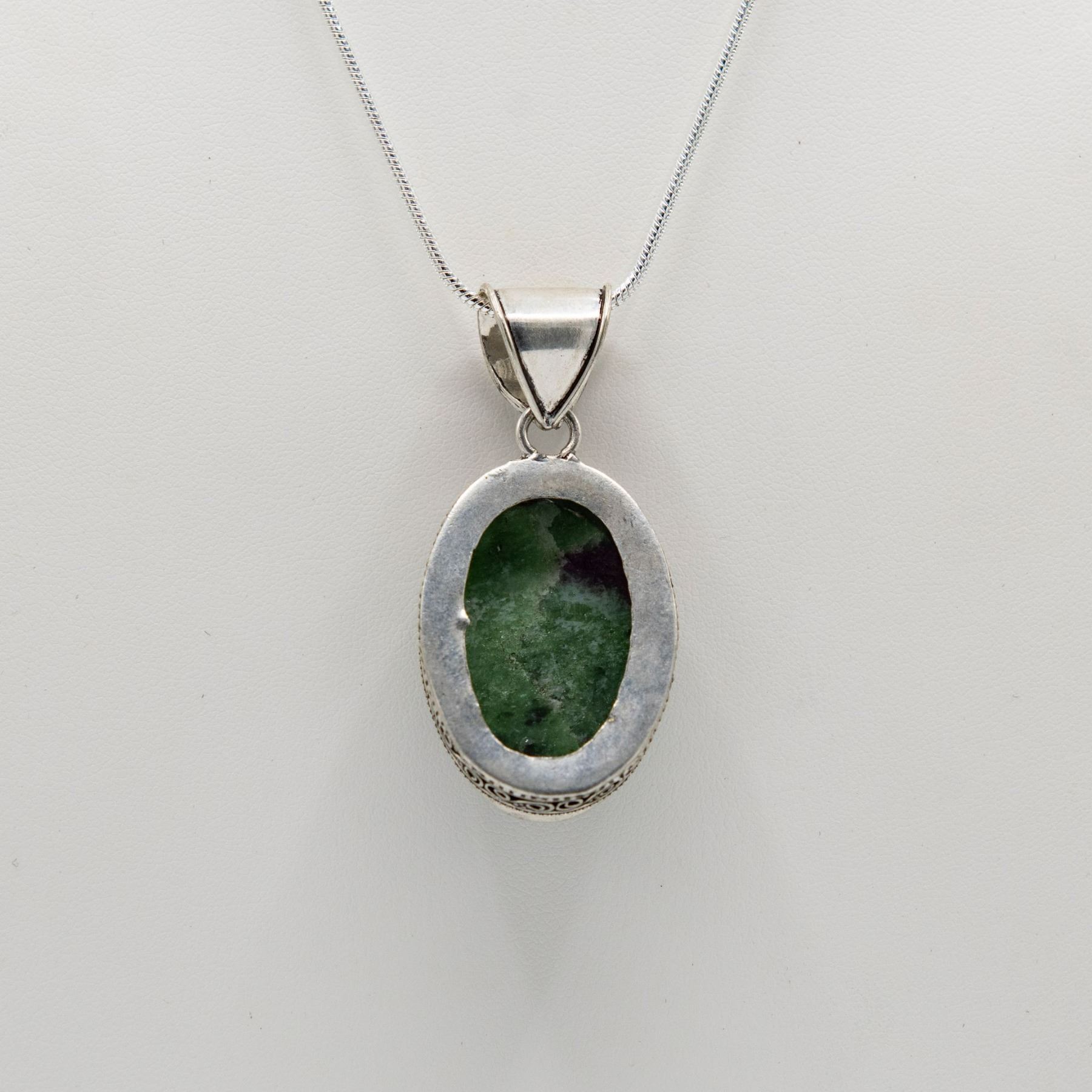 Ladies Natural 39.5 Ct Ruby Zoisite Pendant. This Natural Ruby Zoisite Is A Highly Polished Oval Cabochon Cut. Mounted In Elabataly Designed Stamped .925 Sterling Silver. This Pendant Includes 20" Chain. The Total Gram Weight Is 27.1 Grams Or 135.5 Cttw. Treatment : None