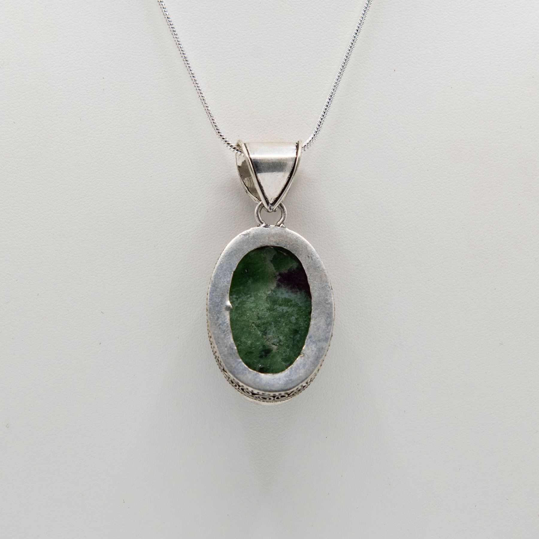 Ladies Natural 39.5 Ct Ruby Zoisite Pendant. This Natural Ruby Zoisite Is A Highly Polished Oval Cabochon Cut. Mounted In Elabataly Designed Stamped .925 Sterling Silver. This Pendant Includes 20" Chain. The Total Gram Weight Is 27.1 Grams Or 135.5 Cttw. Treatment : None