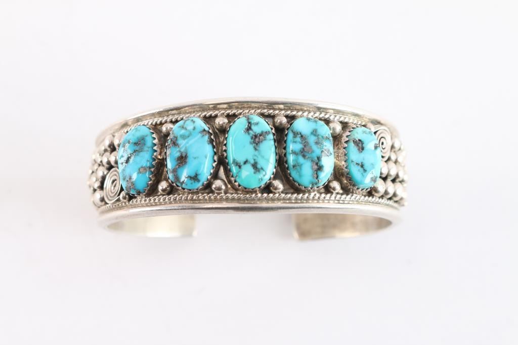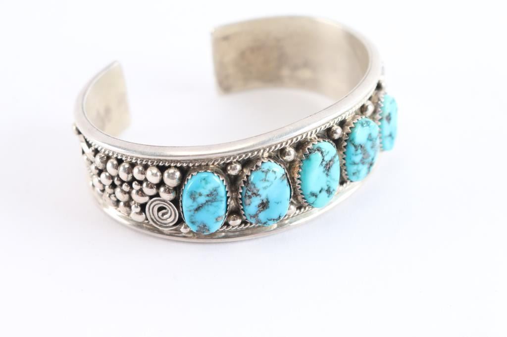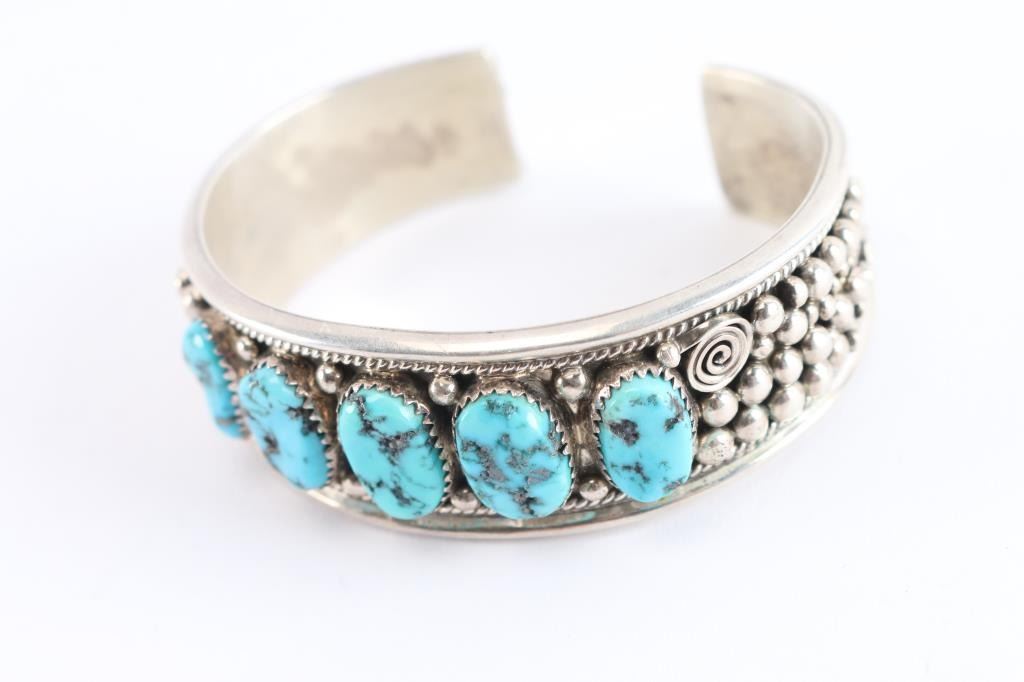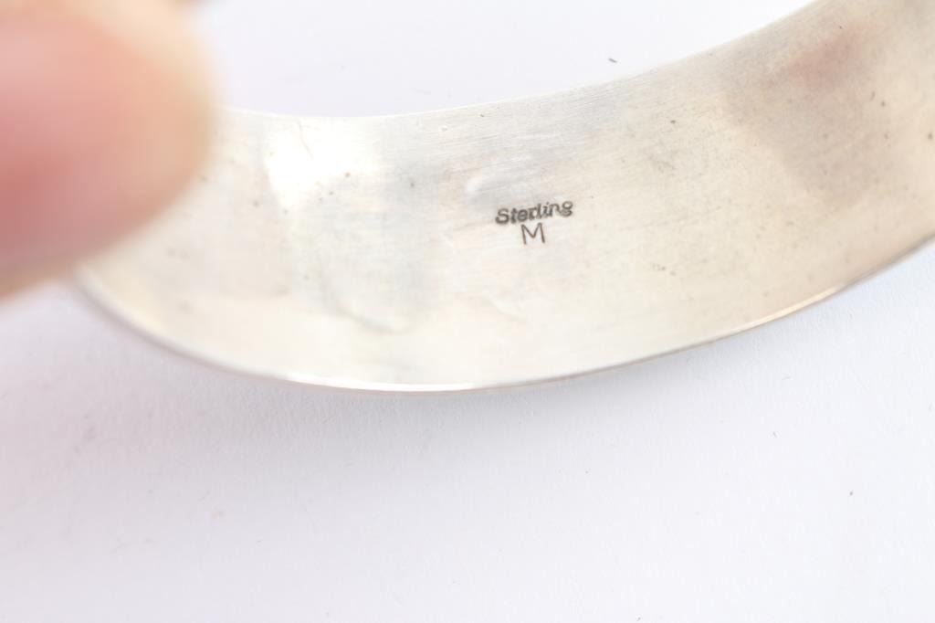 Set in sterling silver, maker marked M. Measures 8.5" including gap.