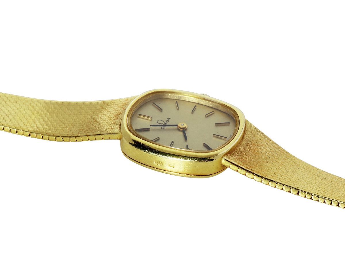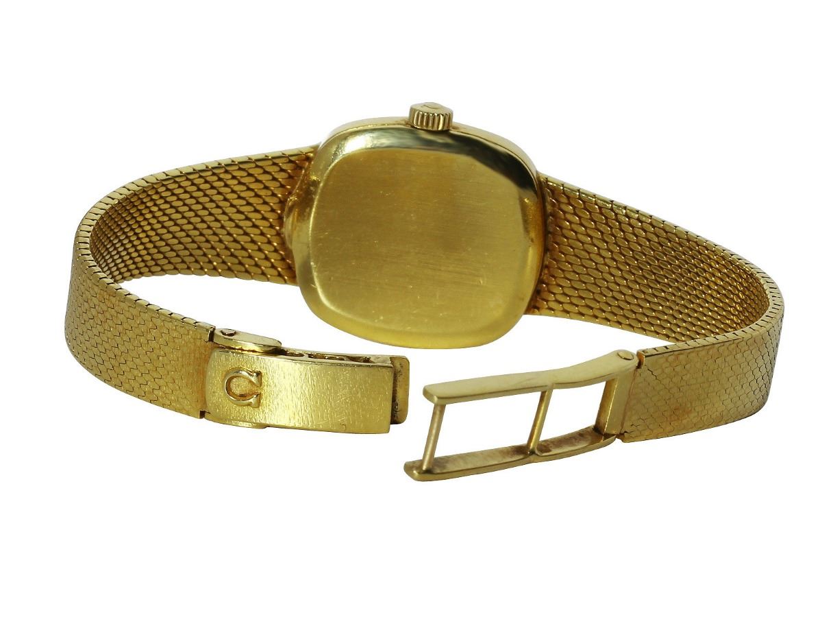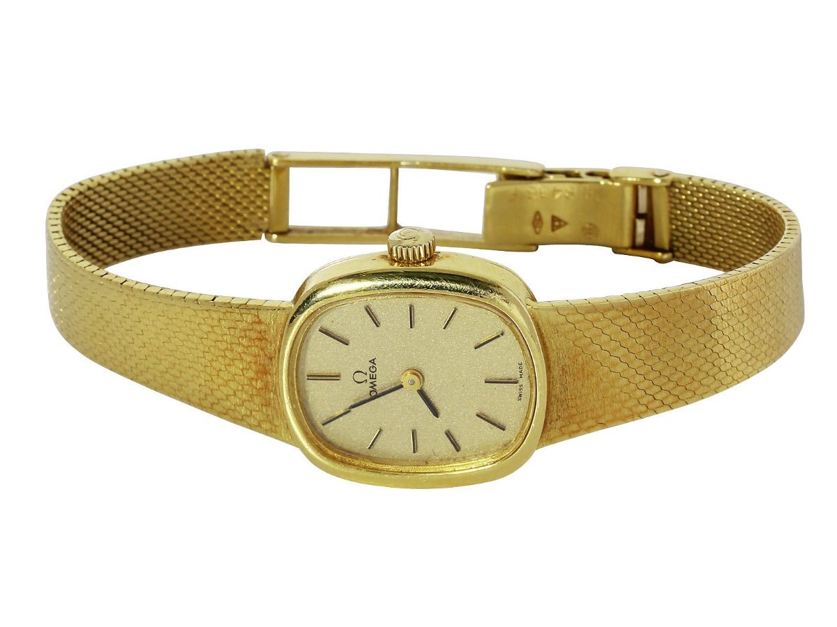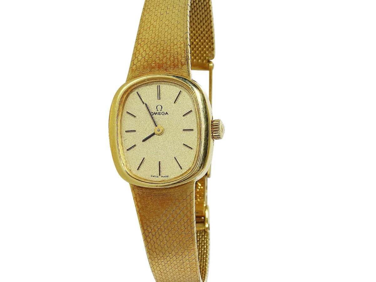 One Omega 18KT Yellow Gold Ladies Watch Case: Rectangular, 18KT yellow gold, measures 22mm x 20mm, 5mm thick. Movement: Manual wind, 17 jewels, caliber 625. Dial: Gold with Florentine finish, gold baton markers and baton hands. Bracelet: Integrated 18K yellow gold with fold over clasp, 6 inches in length., clasp stamped "750, 711.8436 F". Signed: Omega on dial, case and clasp. Condition: Movement is very good and running. Case is very good with small dents on the back, dial is excellent, and bracelet is very good. Total Weight: 37grams.