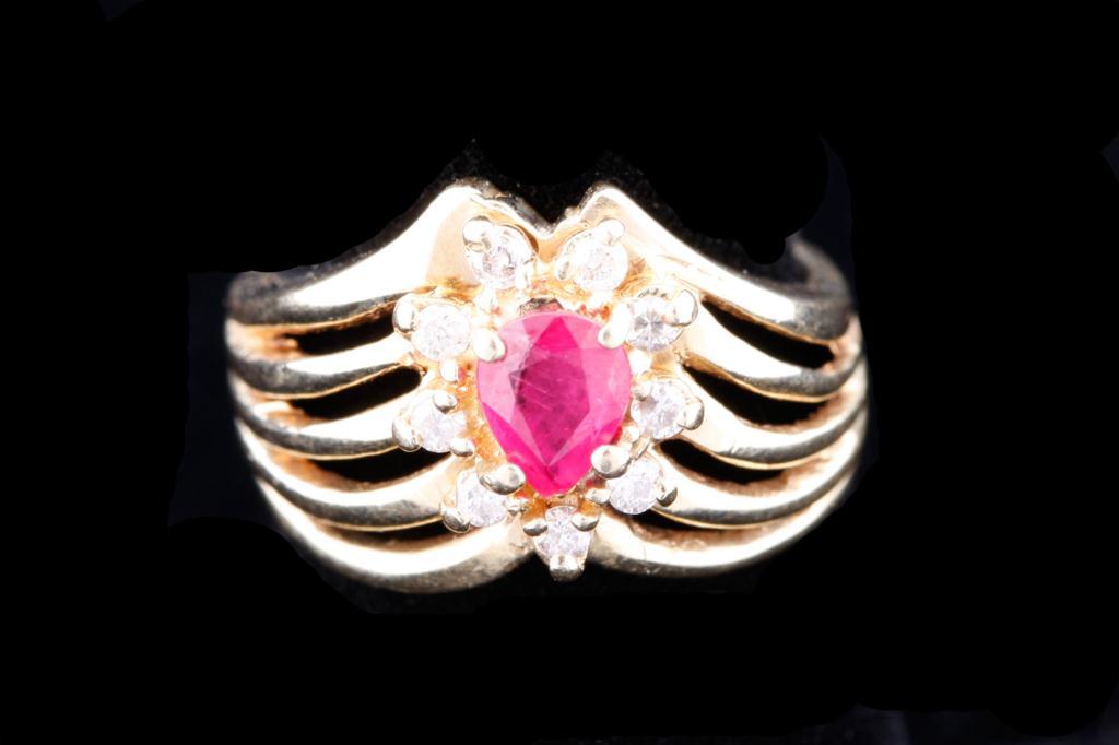 Ladies Pair Shaped Ruby Ring with nine side diamonds, set in 14K yellow gold, 5.8gr of gold, size 4.