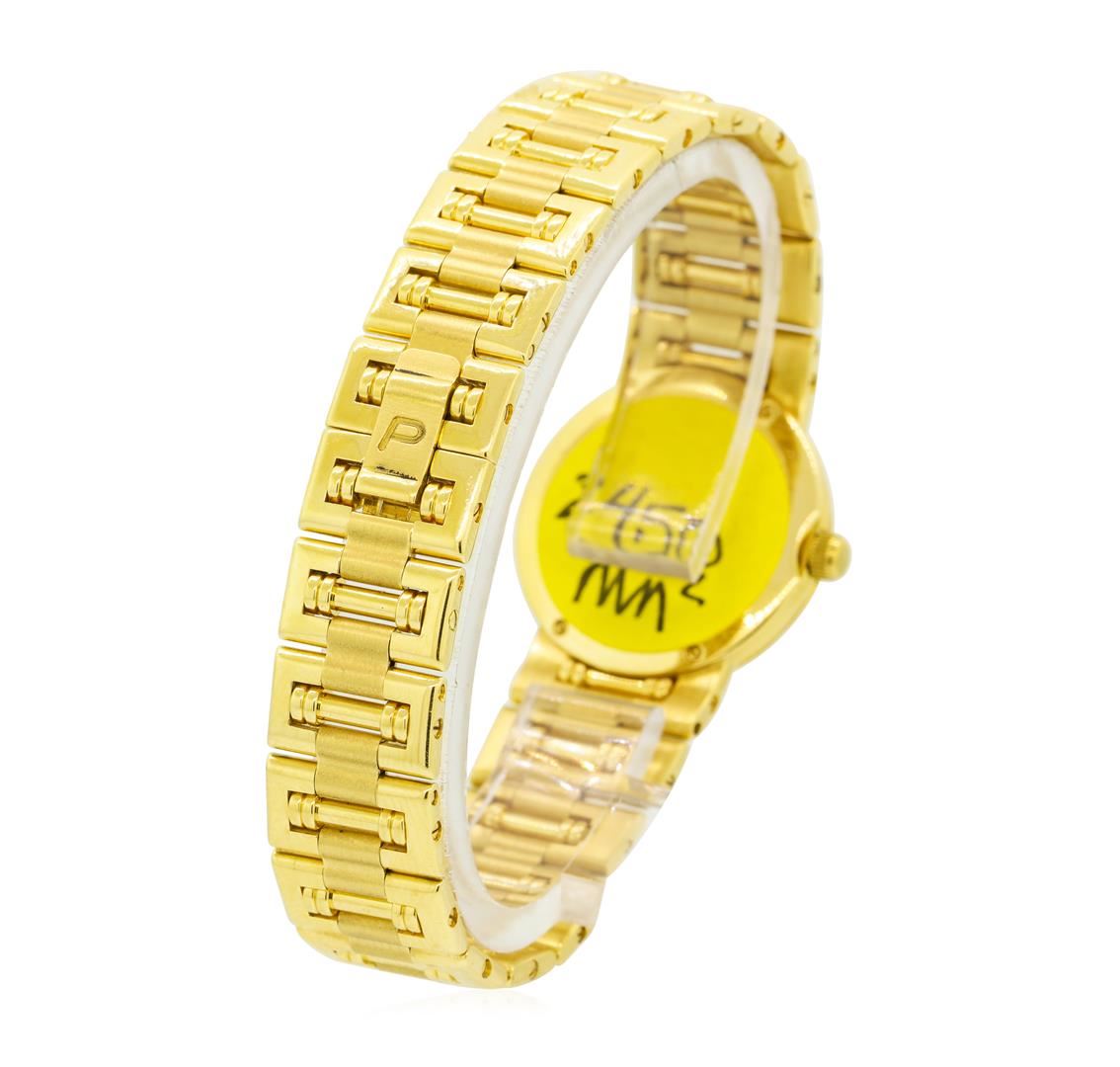 One ladies, Piaget Dancer 18KT yellow gold wristwatch electro-chemically tested.Case: 23mm diameter, Crown: scalloped, low profile, Bezel: pattern continuation, Crystal: acrylic lens.Movement: quartz, Piaget signed Dial: Champagne color, with pointed hands and indices, Piaget Integral tapering 18KT Yellow gold Bracelet: bright finish links, Condition: G-6 Extra Fine. Six and one half inch length. Piaget Hallmarked 18KT Yellow gold overlocking clasp, with logo. Total Weight of Watch 58.17gm. AIG Appraised at $13,000.00.
