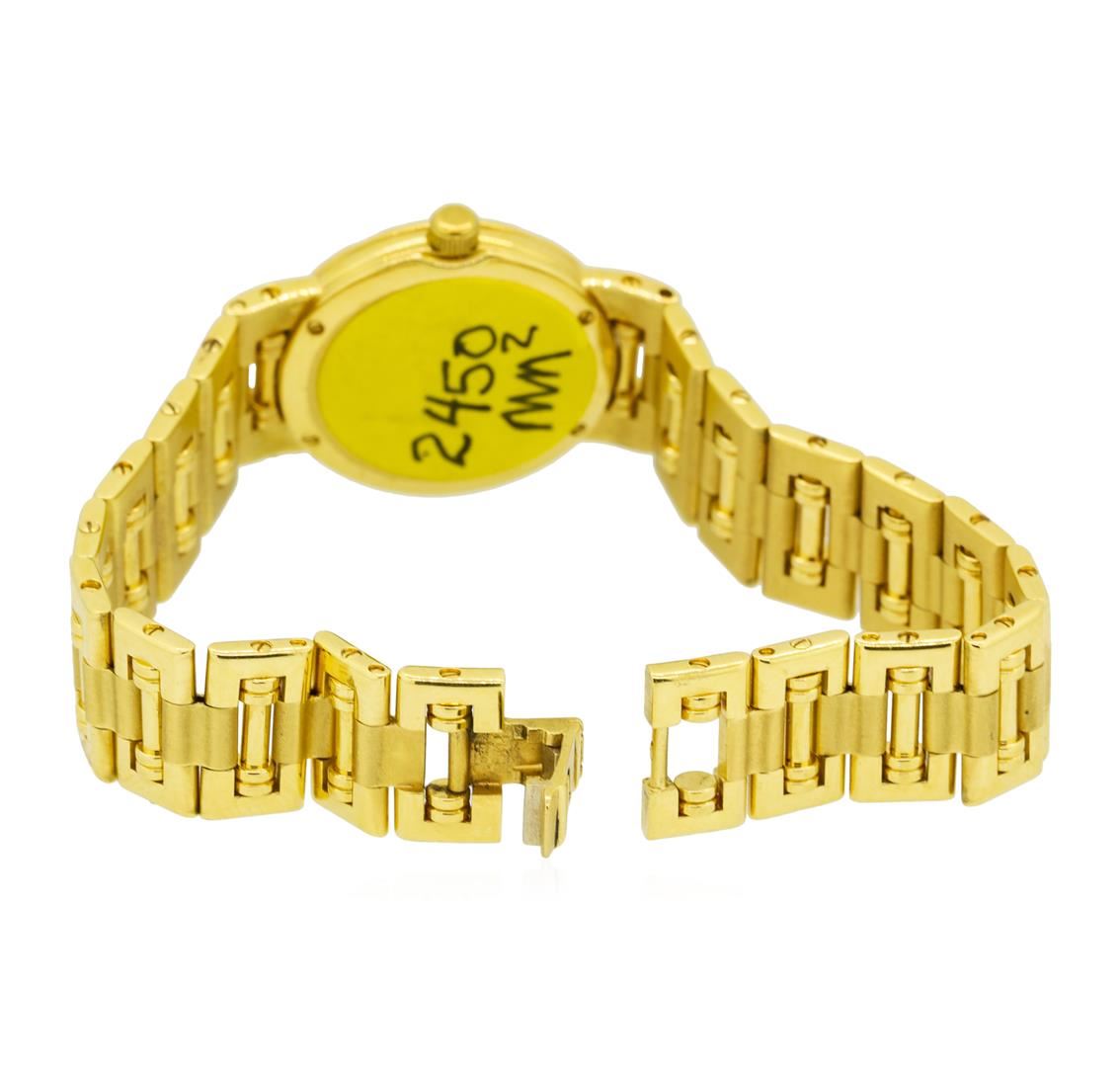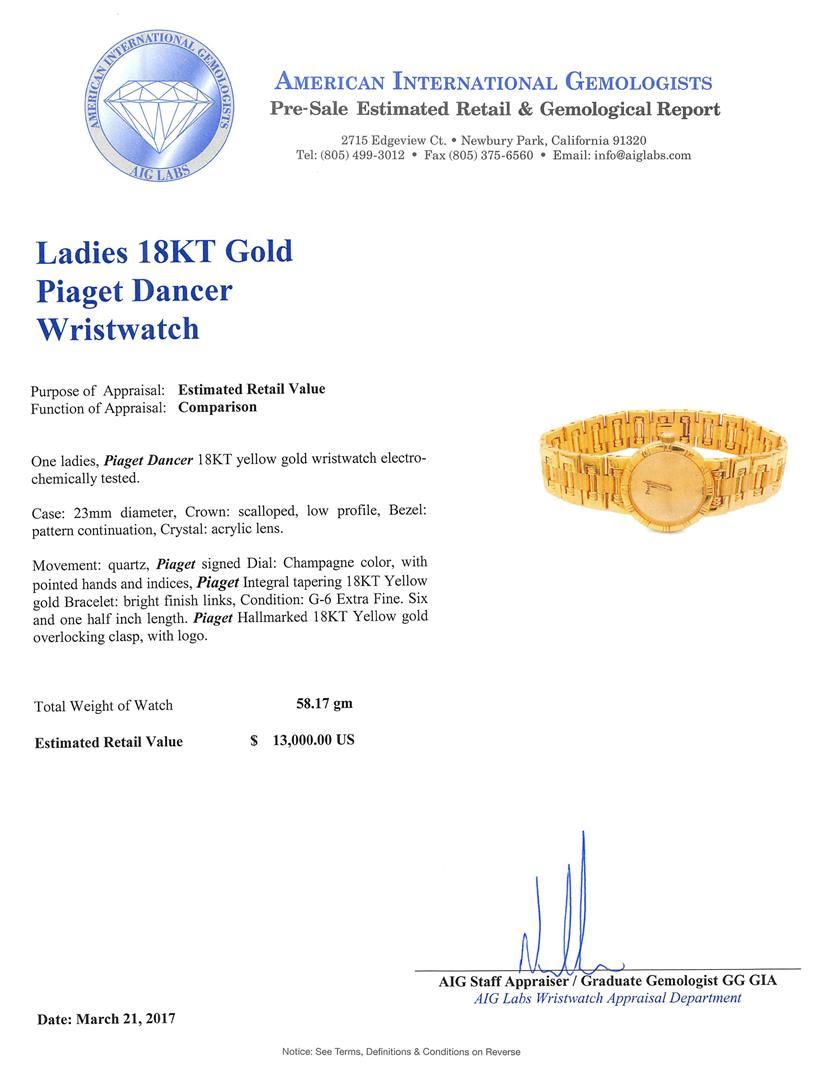 One ladies, Piaget Dancer 18KT yellow gold wristwatch electro-chemically tested.Case: 23mm diameter, Crown: scalloped, low profile, Bezel: pattern continuation, Crystal: acrylic lens.Movement: quartz, Piaget signed Dial: Champagne color, with pointed hands and indices, Piaget Integral tapering 18KT Yellow gold Bracelet: bright finish links, Condition: G-6 Extra Fine. Six and one half inch length. Piaget Hallmarked 18KT Yellow gold overlocking clasp, with logo. Total Weight of Watch 58.17gm. AIG Appraised at $13,000.00.