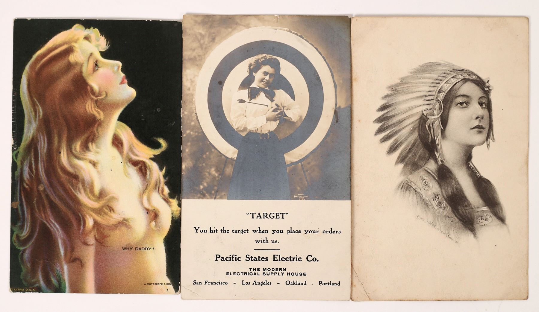 3 nice ladies postcards, c. 1913. 1 in Indian headdress, a silhouette and arrow in the heart!