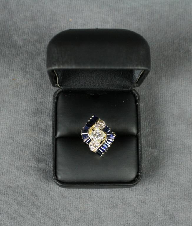 Ladies Princess cut Diamond & Sapphire Ring.  Approx. 1.22 carat center Diamond with  approx. .50 carat side Diamonds and approx.  2.20 carat high quality Sapphires set in  14kt. yellow gold. Est. $2,500-$5,000.