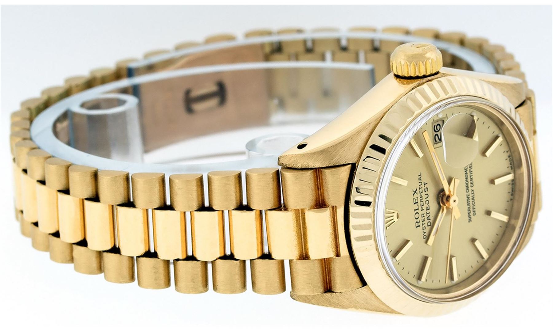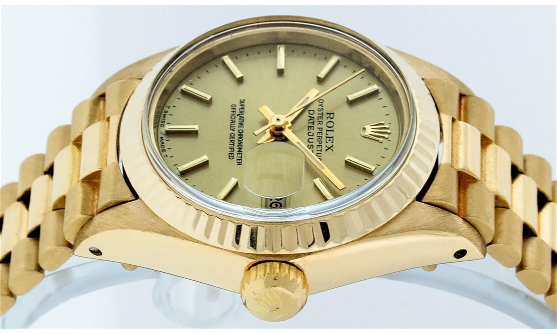 One Ladies 18K Rolex President Polished, Serviced & Electronically Tested, 18K Yellow Gold Case: 26mm, Yellow Gold Crown, Bezel: 18K Yellow Gold Fluted Bezel, Custom Crystal: New Acrylic Cyclops Lens. Movement: Automatic Winding Movement Caliber 2030. Dial: Champagne Index Dial With Line Track And Lumi Dots. Date Window: 3 O'Clock Position, Model: Datejust, Condition: G-6 Extra Fine. Bracelet: 18K Yellow Gold President With Hidden Clasp, Bright & Satin Polish. 6.0 Inch Length, Standard President Clasp (Hidden Clasp), With Rolex Logo.
