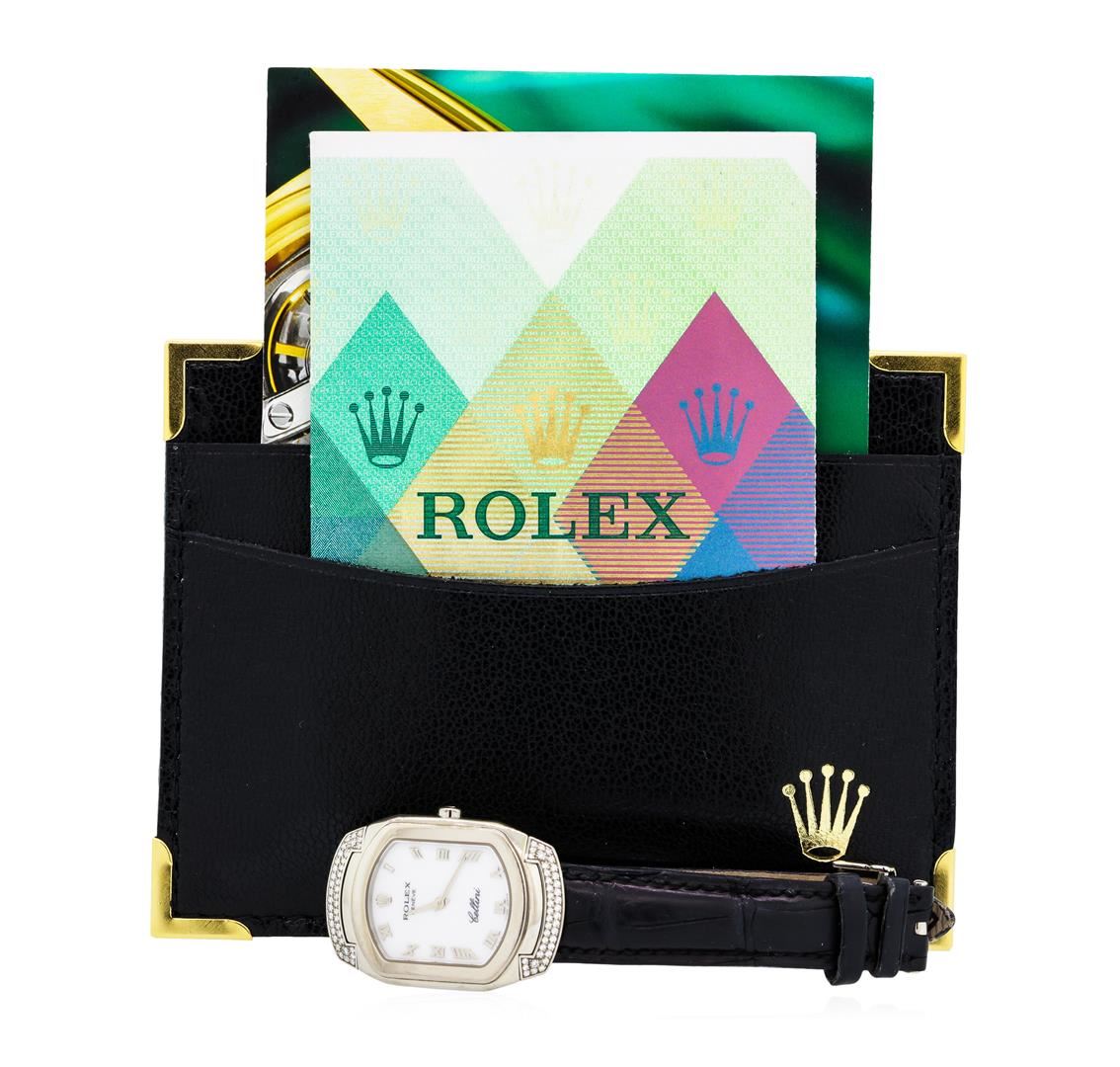 One ladies, Rolex Cellini Cellissma Model wristwatch electronically tested, 18KT White gold, Swiss and Rolex Hallmarked Case: 35mm x 24mm, Crown: high relief logo, Case Lugs: diamond set, Bezel: high polish finish, Crystal: synthetic sapphire cyclops lens. Swiss Movement: quartz, Rolex Cellini signed Dial: Porcelain White color, pointed hands & raised Roman numerals, Condition: G-7 Near Mint, Ulysse Nardin Bracelet: saddle stitched leather strap, Six and one half inch length. Swiss & Rolex Hallmarked 18KT White gold concealed clasp, with high relief logo. Containing: Seventy Eight prong set single cut diamonds, measuring 1.20mm - 0.80mm in diameter, approximate total weight of 78 stones equals 0.26ct. Set & graded in the bezel. Clarity: VVS-1 to VS-1 Color E - G. Total Weight of Diamonds 0.26ct. Total Weight of Watch 46.47gm. AIG Appraised at $9,880.00.