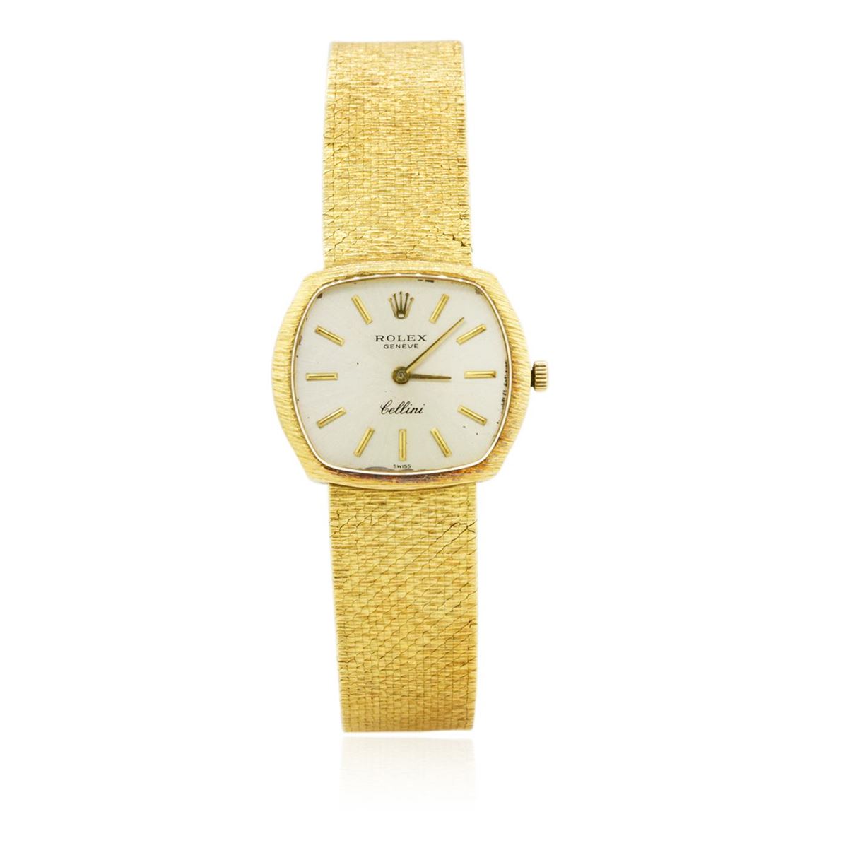 One ladies, Rolex Cellini wristwatch, electronically tested 18KT yellow gold, Case: 22 x 26mm, Crown: logo'd, Bezel pattern continuation, Crystal: synthetic sapphire. Movement: Swiss nineteen jewel unadjusted mechanical, Dial: Silvered, with baton hands and indices, Bracelet: 18KT yellow gold Cellini yellow gold mesh, Condition: G-4 Average. Seven inch length. Total Weight of Watch 58.98 grams. AIG Appraised at $10,990.00.
