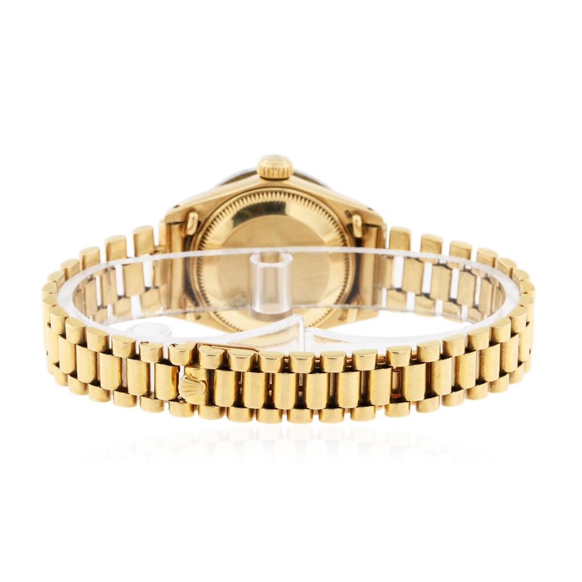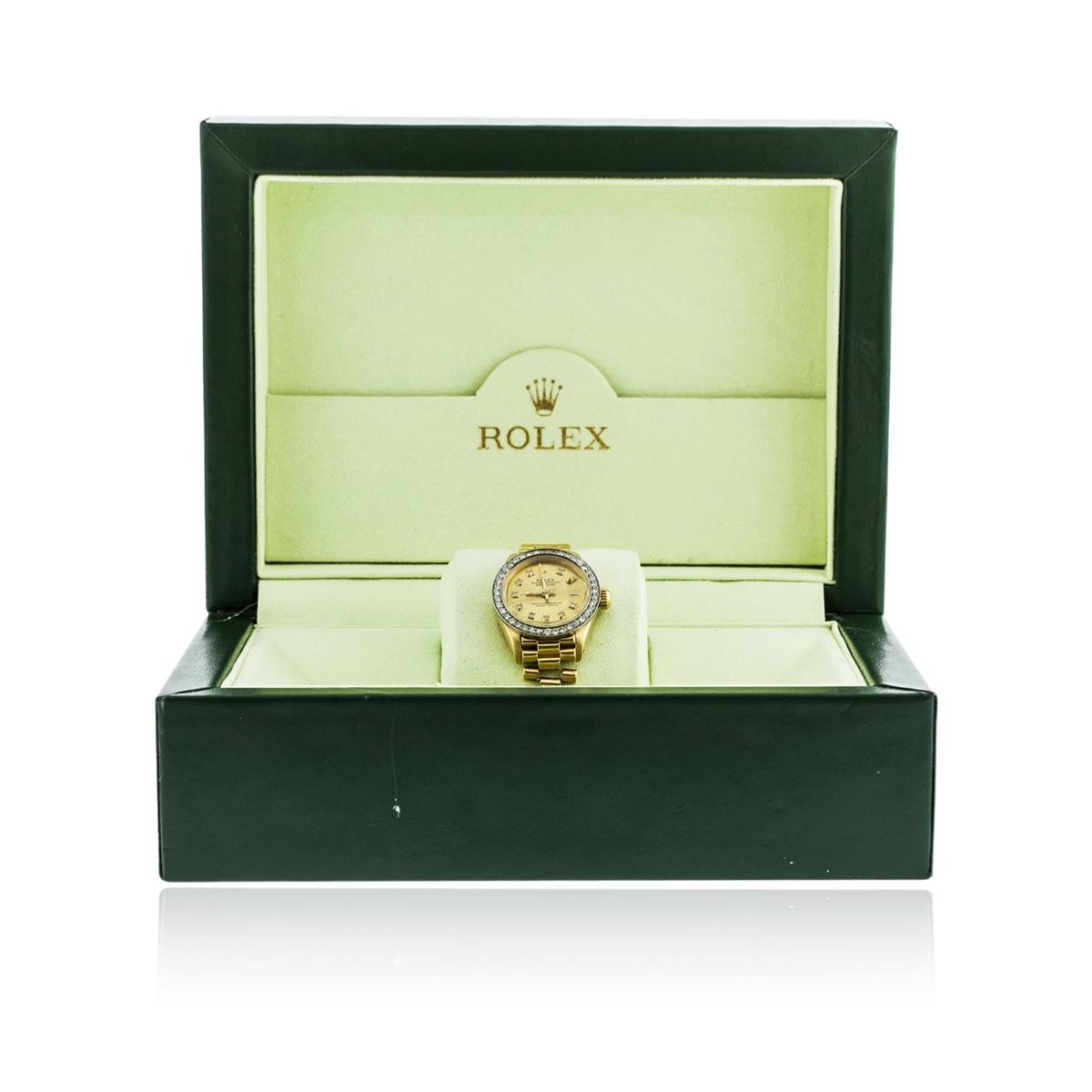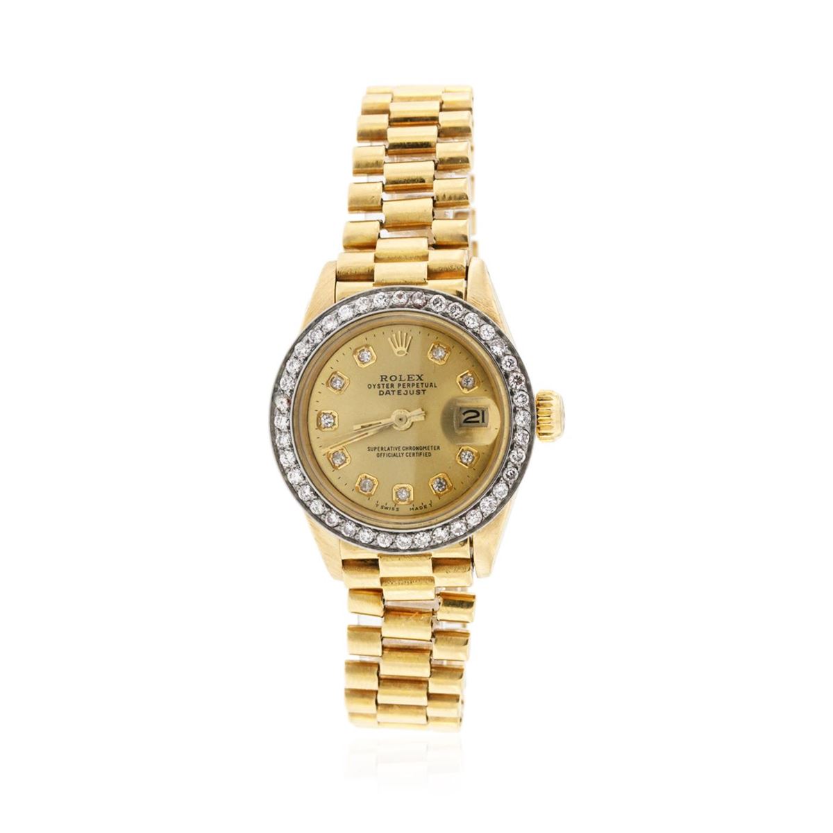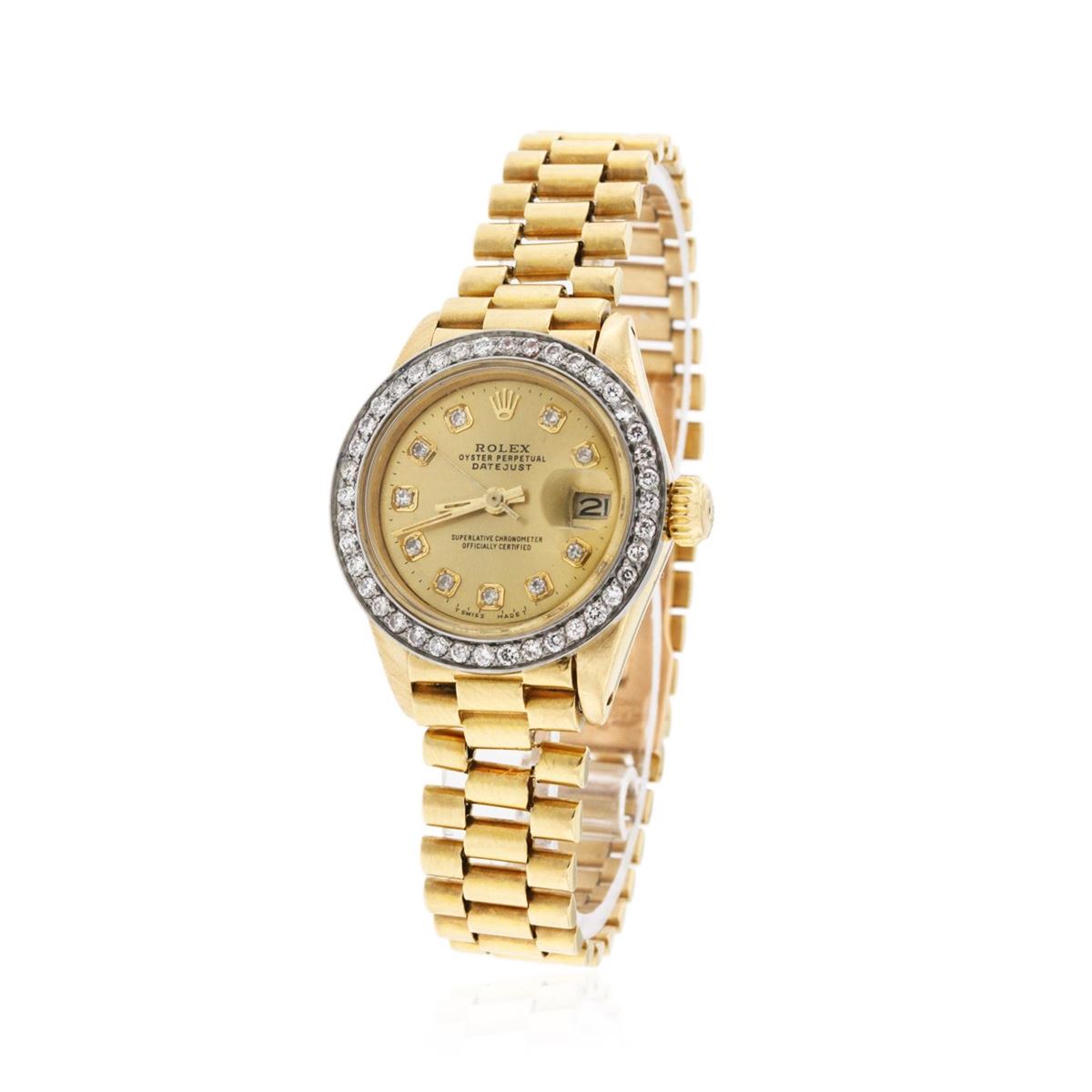 One ladies, hand crafted & machine milled Rolex Lady President the DateJust model wristwatch electronically tested 18KT yellow gold, Circa: 1979, Case: 26mm oyster, Crown: twinlock with logo, Custom Bezel: diamond set, Crystal: acrylic cyclops lens. Movement: superlative chronometer, Dial: Champagne color, with baton hands, & diamond markers, Date Display: 3 o'clock position, non-quick set, Bracelet: 18KT yellow gold Lady President, Condition: G-4 Average. Bright polish finish. Six and one quarter inch length. Concealed deployment clasp, with logo. Containing: Forty prong set round brilliant cut diamonds, approximate total weight = 0.80ct. Set & graded in the bezel. Clarity VS-2 to S I-2. Color: G - I. Total Weight of Diamonds 0.80ct. Total Weight of Watch 63.10 grams. AIG Appraised at $18,550.00.