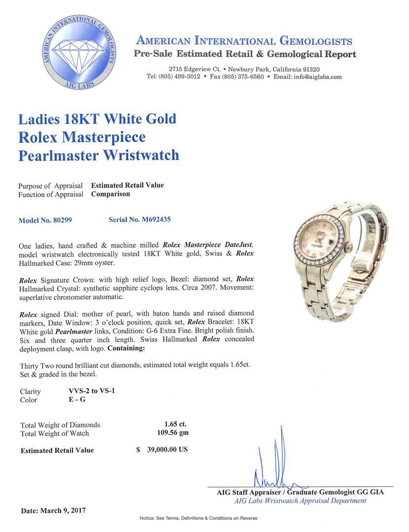 One ladies, hand crafted & machine milled Rolex Masterpiece DateJust, model wristwatch electronically tested 18KT White gold, Swiss & Rolex Hallmarked Case: 29mm oyster. Rolex Signature Crown: with high relief logo, Bezel: diamond set, Rolex Hallmarked Crystal: synthetic sapphire cyclops lens. Circa 2007. Movement: superlative chronometer automatic. Rolex signed Dial: mother of pearl, with baton hands and raised diamond markers, Date Window: 3 o'clock position, quick set, Rolex Bracelet: 18KT White gold Pearlmaster links, Condition: G-6 Extra Fine. Bright polish finish. Six and three quarter inch length. Swiss Hallmarked Rolex concealed deployment clasp, with logo. Containing: Thirty Two round brilliant cut diamonds, estimated total weight equals 1.65ct. Set & graded in the bezel. Clarity VVS-2 to VS-1 Color E - G. Total Weight of Diamonds 1.65ct. Total Weight of Watch 109.56gm. AIG Appraised at $39,000.00.