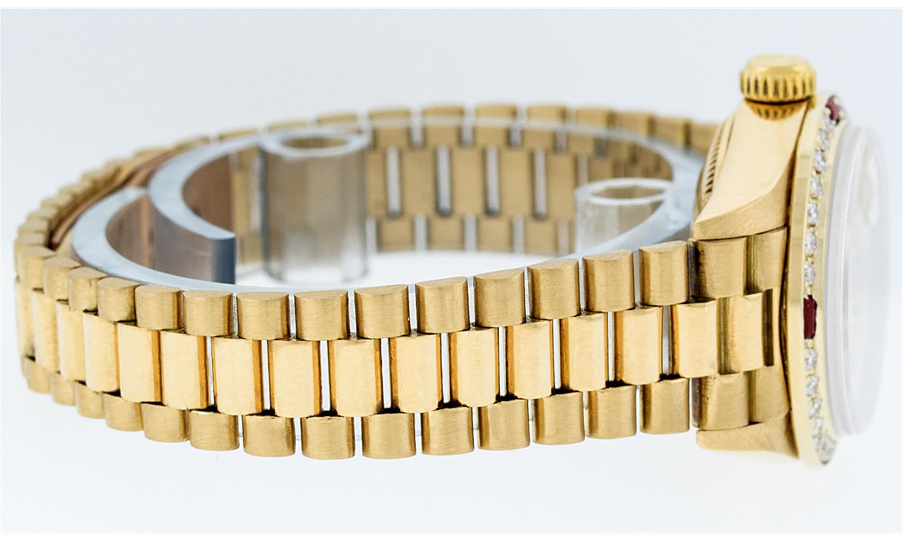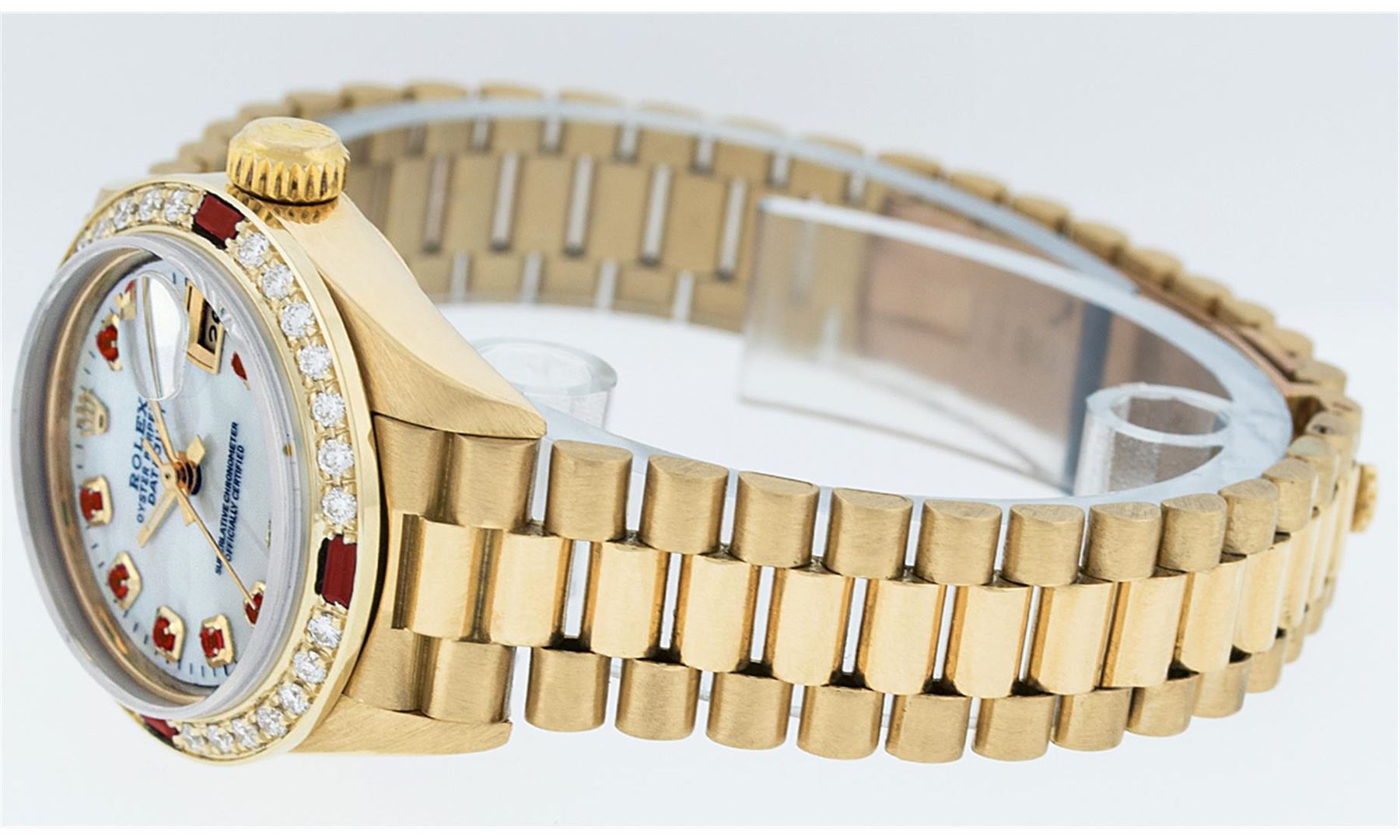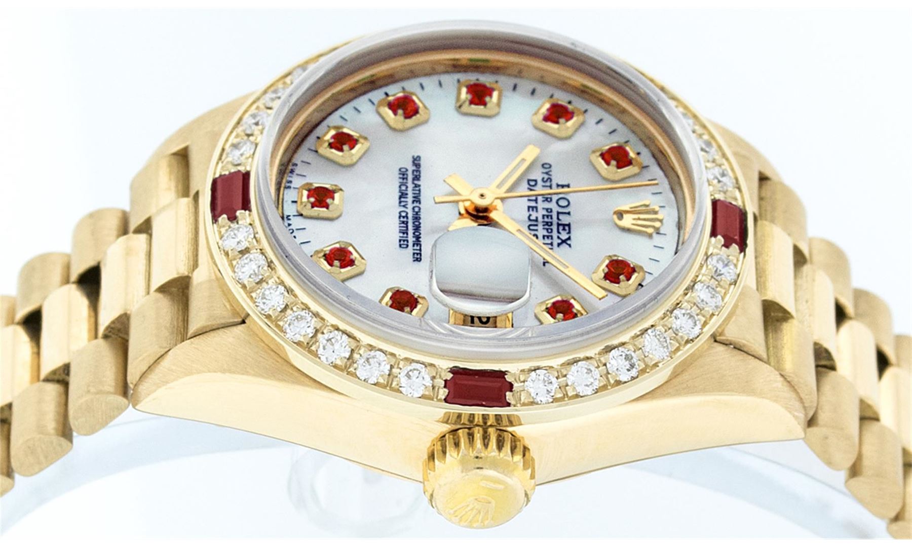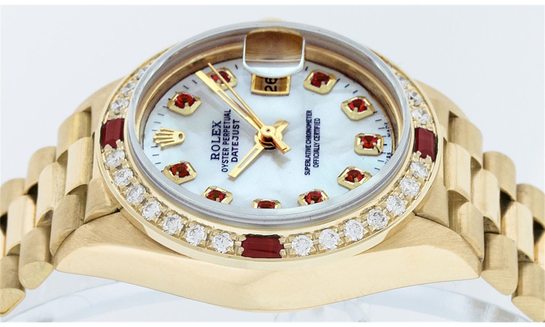 One Ladies 18K Yellow Gold Rolex President Polished, Serviced & Electronically Tested, Yellow Gold Case: 26mm, 18K Yellow Gold Crown, Custom Bezel: 18K Yellow Gold Beadset Diamond Bezel, Diamond Count: 32 Diamonds. Total Weight .70 Carat, Clarity: SI-VS, Color: G to H. Custom Crystal: Synthetic Sapphire Cyclops Lens. Movement: Automatic Winding Movement Caliber 2135. Custom Dial: Mother Of Pearl With Ruby Hour Markers, Stone Count: 10 Rubies In Dial. Date Window: 3 O'Clock Position, Model: Datejust President 69178, Quickset, Condition: G-6 Extra Fine. Bracelet: 18K Yellow Gold President With Hidden Clasp, Bright & Satin Polish. 6.0 Inch Length, Standard President Clasp (Hidden Clasp), With Rolex Logo. Watch Has Been Serviced and Polished It Is Free Of All Scratches and Dents.