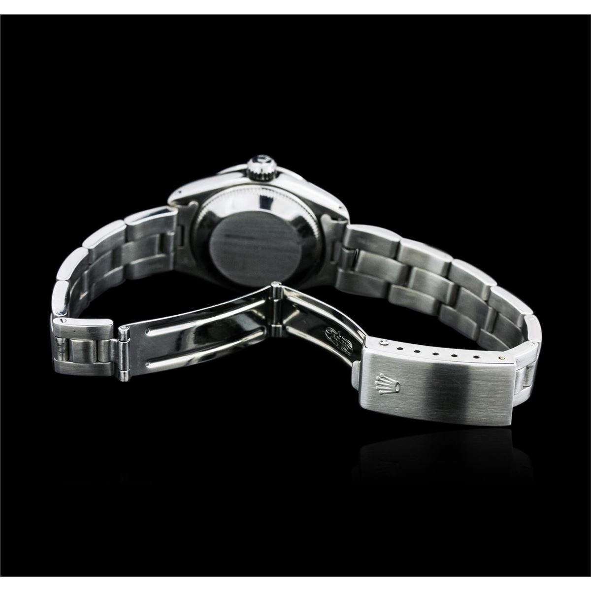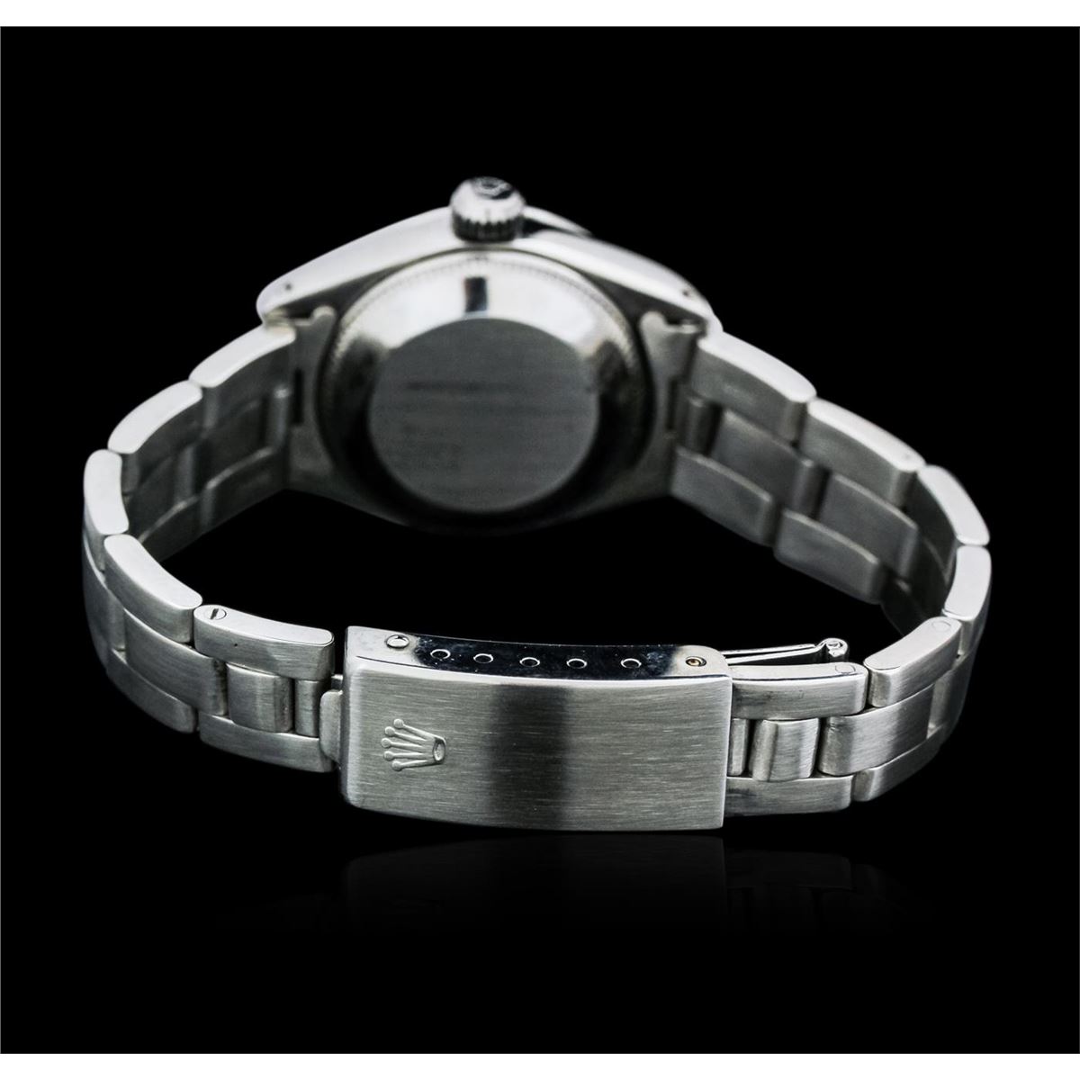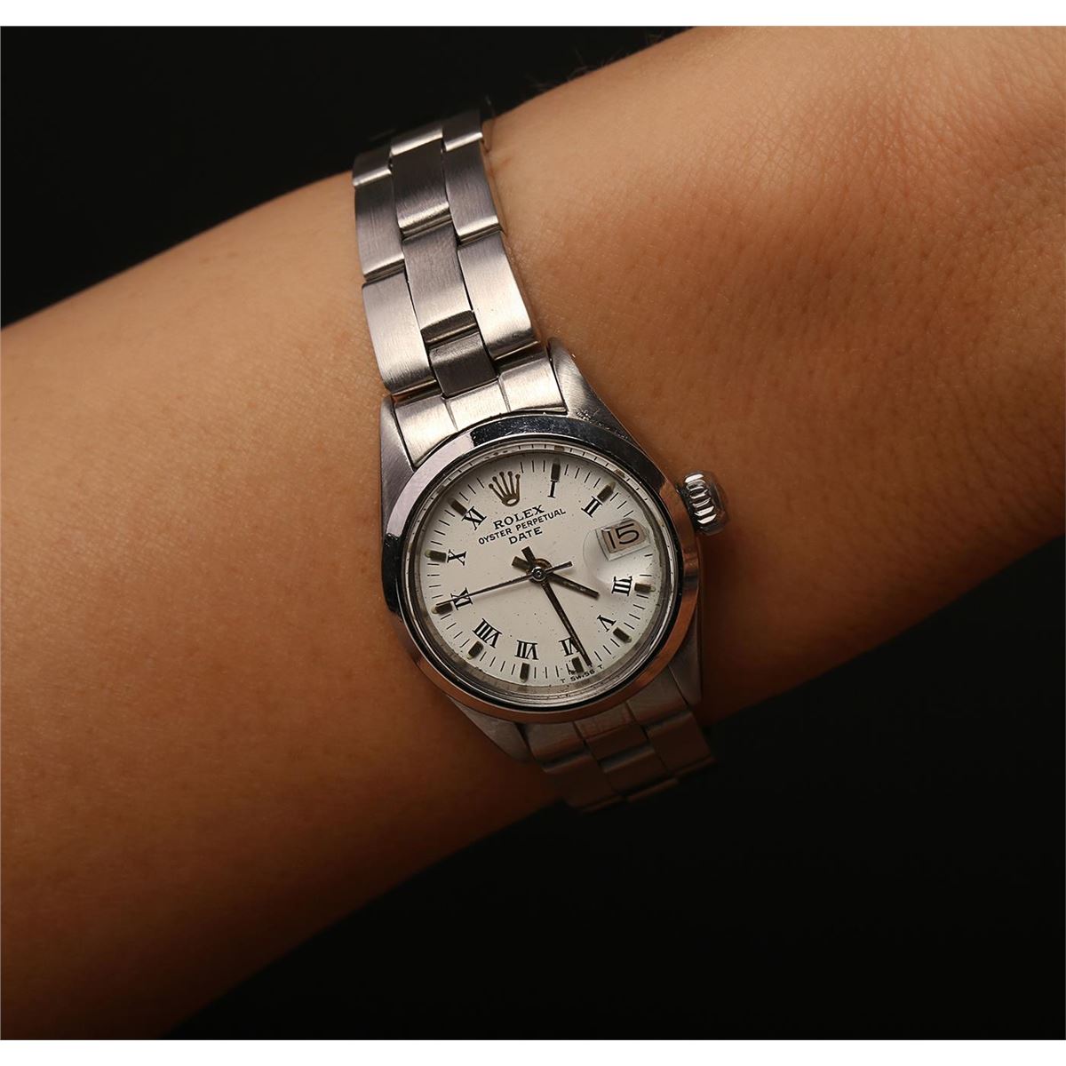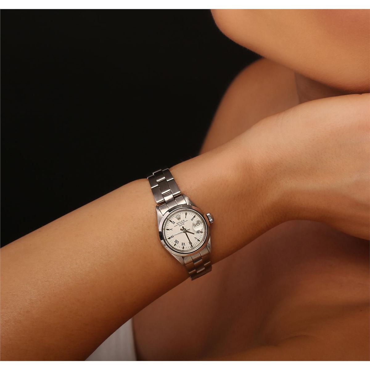 One ladies, hand crafted & machine milled Rolex Date Model Stainless Steel wristwatch electronically tested, Case: 26mm oyster, Crown: twinlock with logo, Bezel: polished, Crystal: acrylic cyclops lens. Movement: mechanical, stem wind, Dial: White color, with baton hands, Roman numerals and indices, Date Window: 3 o'clock position non-quick set, Circa: 1970, Condition: G-4 Average. Bracelet: stainless steel oyster. Brushed polish finish. Six and one half inch length, adjustable. Standard clasp, with logo. Total Weight of Watch 48.40gm. AIG Appraised at $3,380.00.