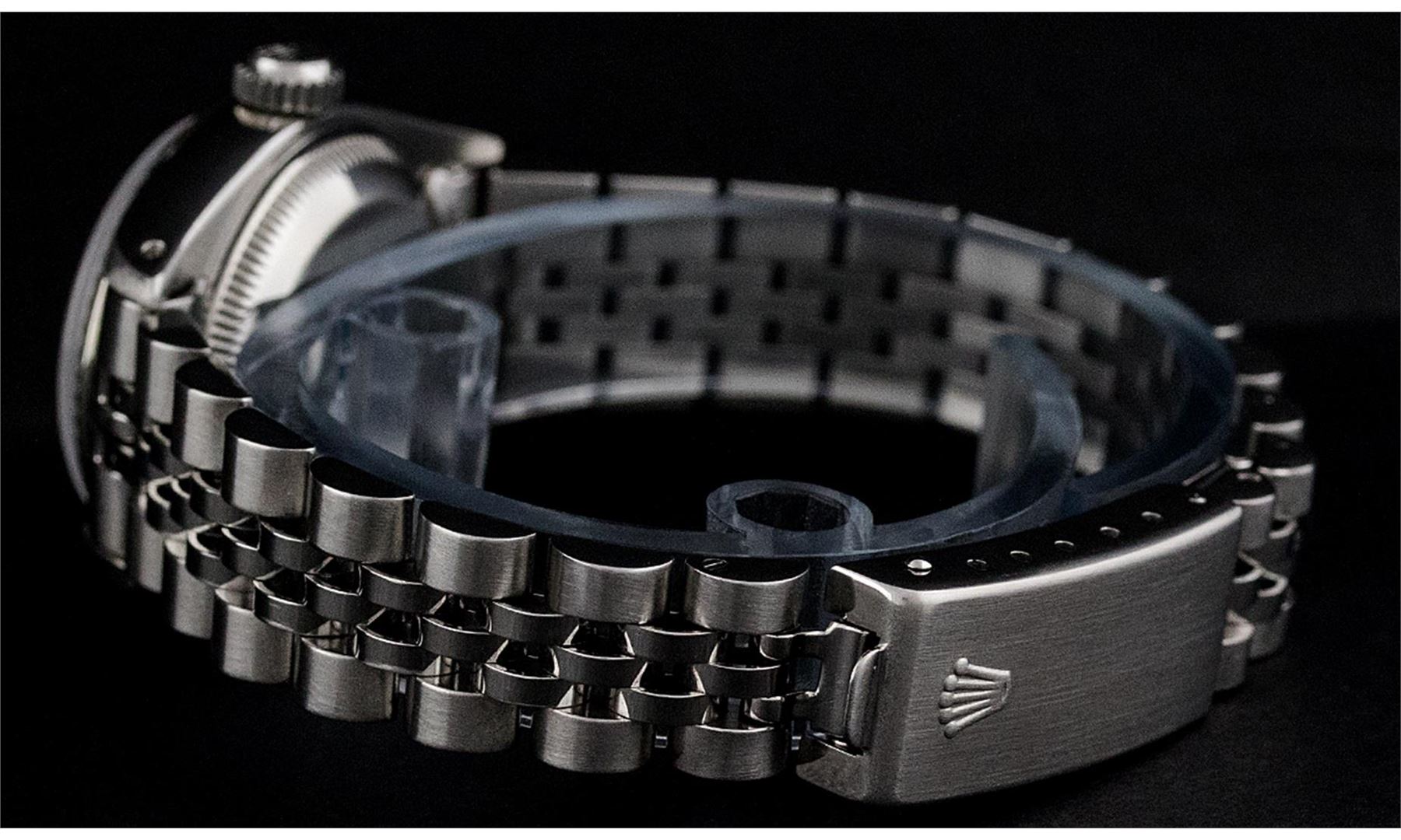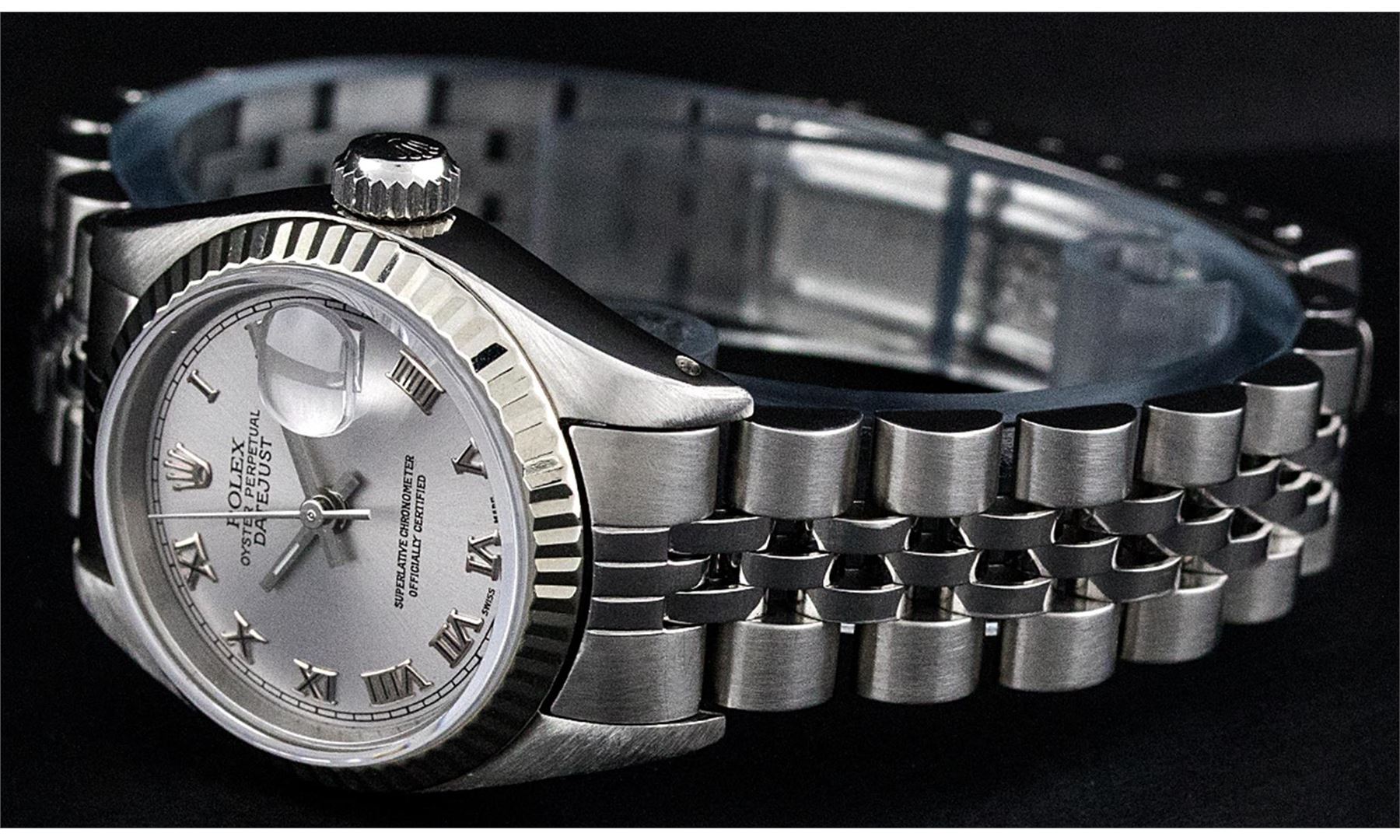 One Ladies Rolex Datejust Polished Bright with Satin Finish, Serviced & Electronically Tested, Stainless Steel Case:26mm, Stainless Steel Crown, Bezel: 18K White Gold Fluted. Custom Crystal: Sapphire Cyclops Lens. Movement: Automatic Winding Movement Caliber 2135. Custom Dial:Slate Grey With Roman Hour Markers. Date Window: 3 O'Clock Position Date Display, Quickset, Model: 69174 Quickset Datejust. Condition: G-6 Extra Fine. Bracelet: Stainless Steel Jubilee Band. Bright Polish & Satin Finish. 6.0 Inch Length, Adjustable. Standard Clasp, With Rolex Logo.