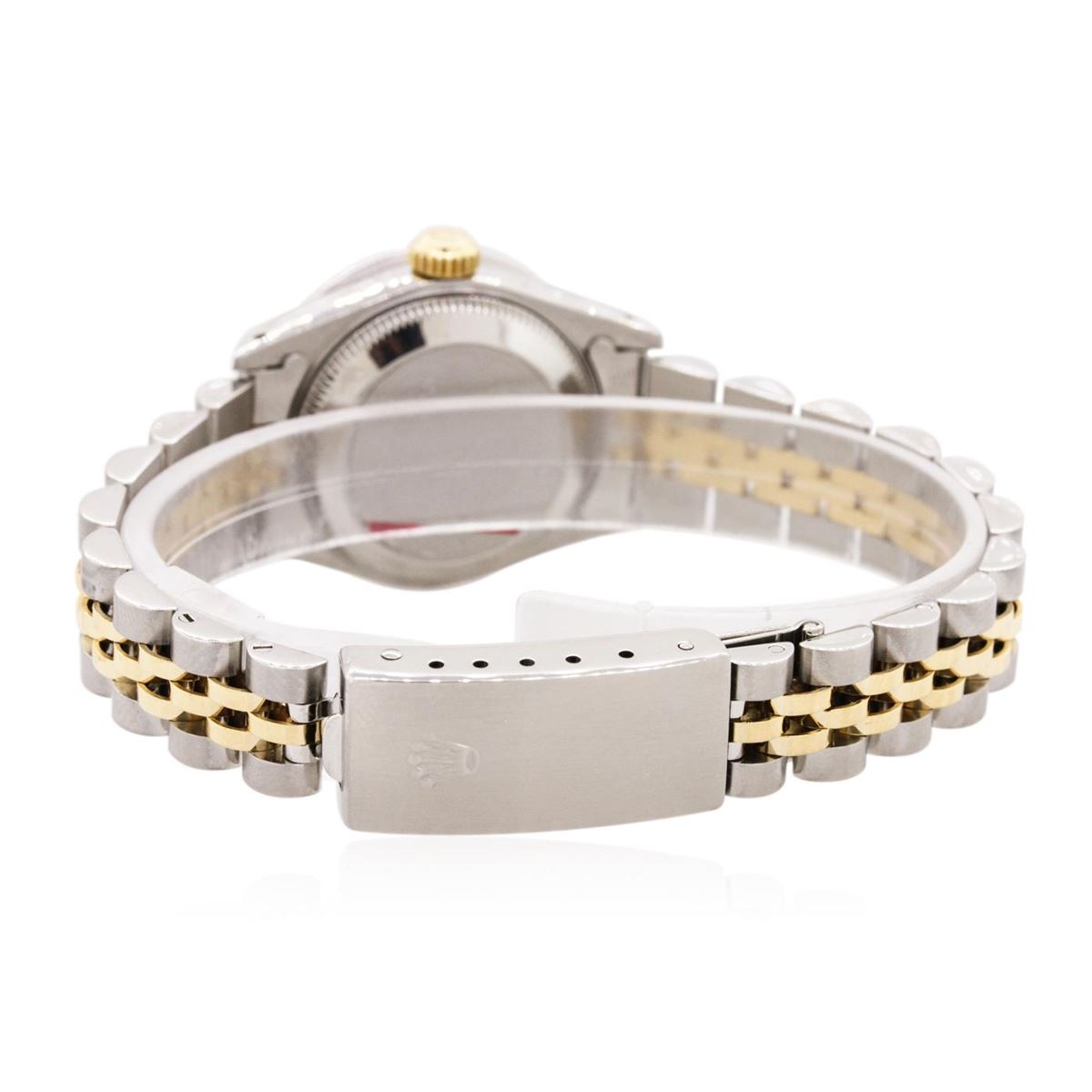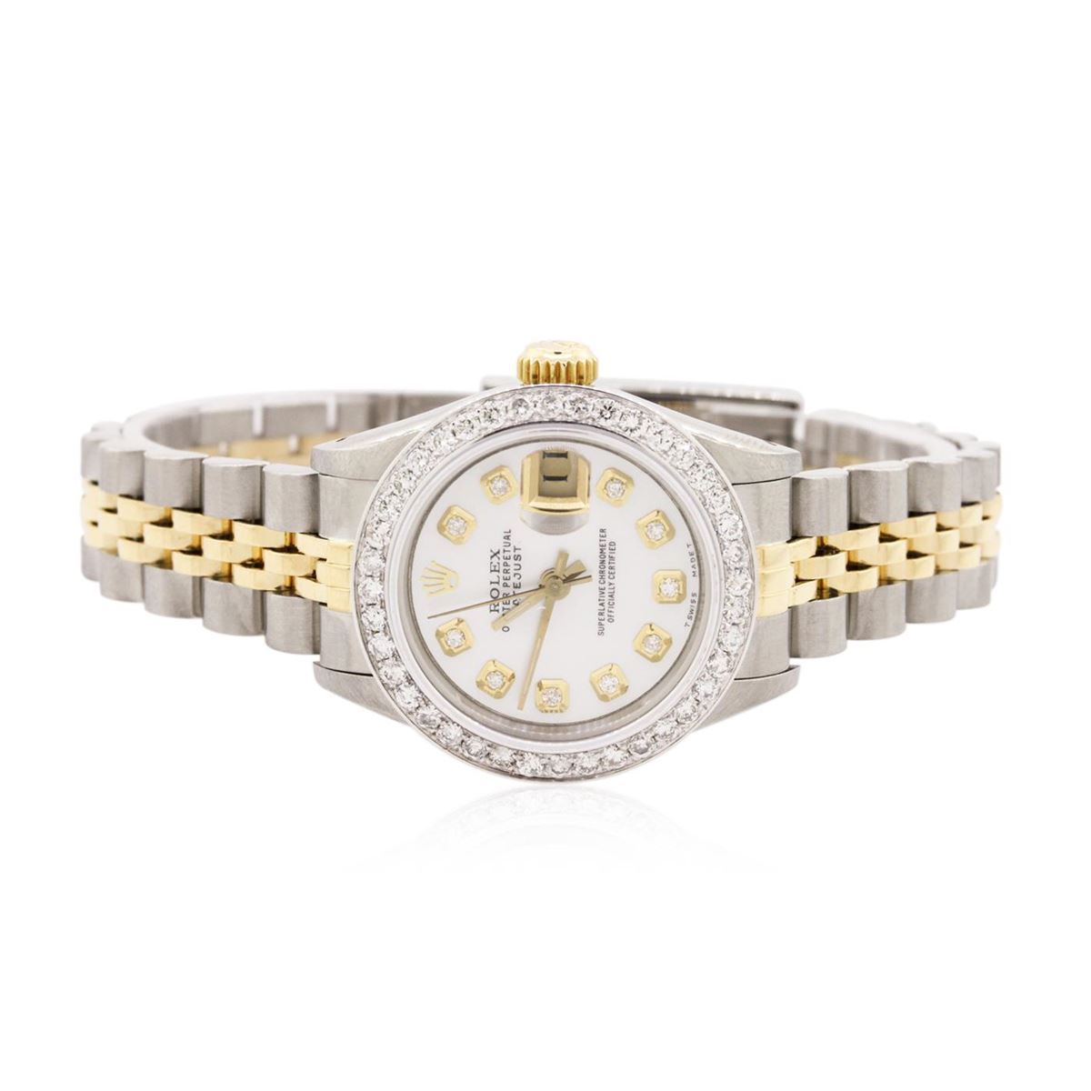 One ladies, hand crafted & machine milled Rolex DateJust Model wristwatch electronically tested, stainless steel Case: 26mm oyster, 18KT yellow gold Crown: twinlock with logo, Custom Bezel: diamond set, Custom Crystal: synthetic sapphire cyclops lens. Movement: superlative chronometer, Custom Dial: mother of pearl, with baton hands & diamond markers, Calendar: 3 o'clock position date display, quick set, Circa: 1987, Condition: G-5 Fine, Bracelet: stainless steel and 18KT yellow gold jubilee. Six inch length, adjustable. Standard clasp, with logo. Containing: Forty round brilliant diamonds, approximate total weight of 40 stones equals 1.15ct. Set & graded in the bezel. Clarity: SI-1 to SI-2. Color: G - I. Total Weight of Diamonds 1.15ct. Total Weight of Watch 53.58 grams. AIG Appraised at $9,050.00.
