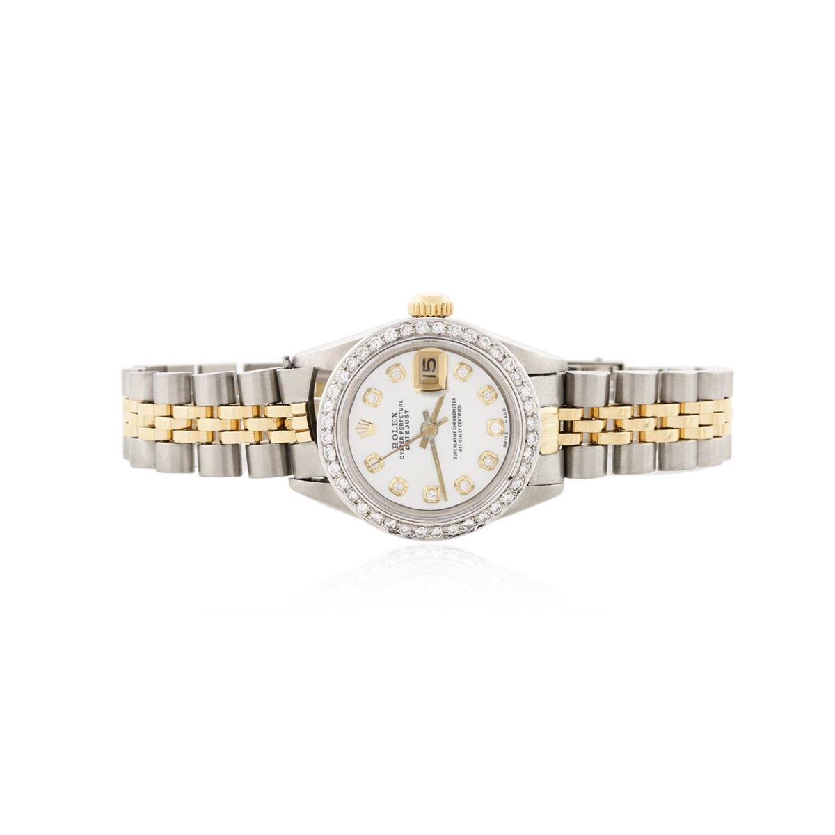 One ladies, hand crafted & machine milled Rolex DateJust Model wristwatch electronically tested, Stainless Steel Case: 26mm oyster, Crown: 14KT yellow gold twinlock with logo, Custom Bezel: diamond set, Custom Crystal: synthetic sapphire cyclops lens. Movement: superlative chronometer. Custom Dial: light mother of pearl, with baton hands, and diamond markers, Date Window: 3 o'clock position date display, quick set, Circa: 1983, Condition: G-4 Average. Bracelet: stainless steel and 14KT yellow gold jubilee. Bright polish & brushed finish. Six and three quarter inch length, adjustable. Standard clasp, with logo. Containing: Forty round brilliant cut diamonds, 1.50mm in diameter average, approximate. Total Weight of 40 stones = 0.50ct. Set and graded in the bezel. Clarity: SI-1 to I-1. Color: F - H. Total Weight of Diamonds 0.50ct. Total Weight of Watch 54.73 grams. AIG Appraised at $8,050.00.