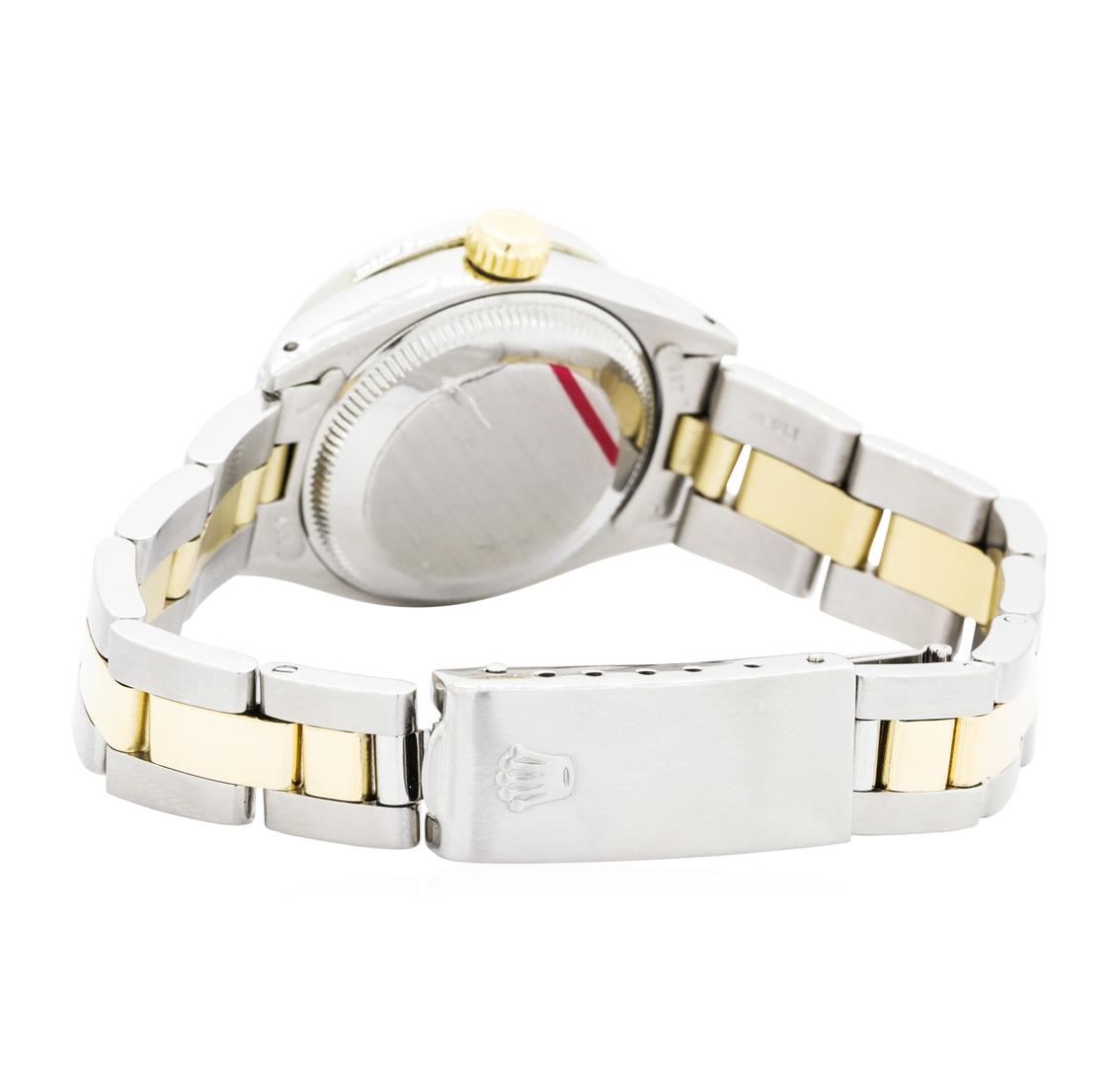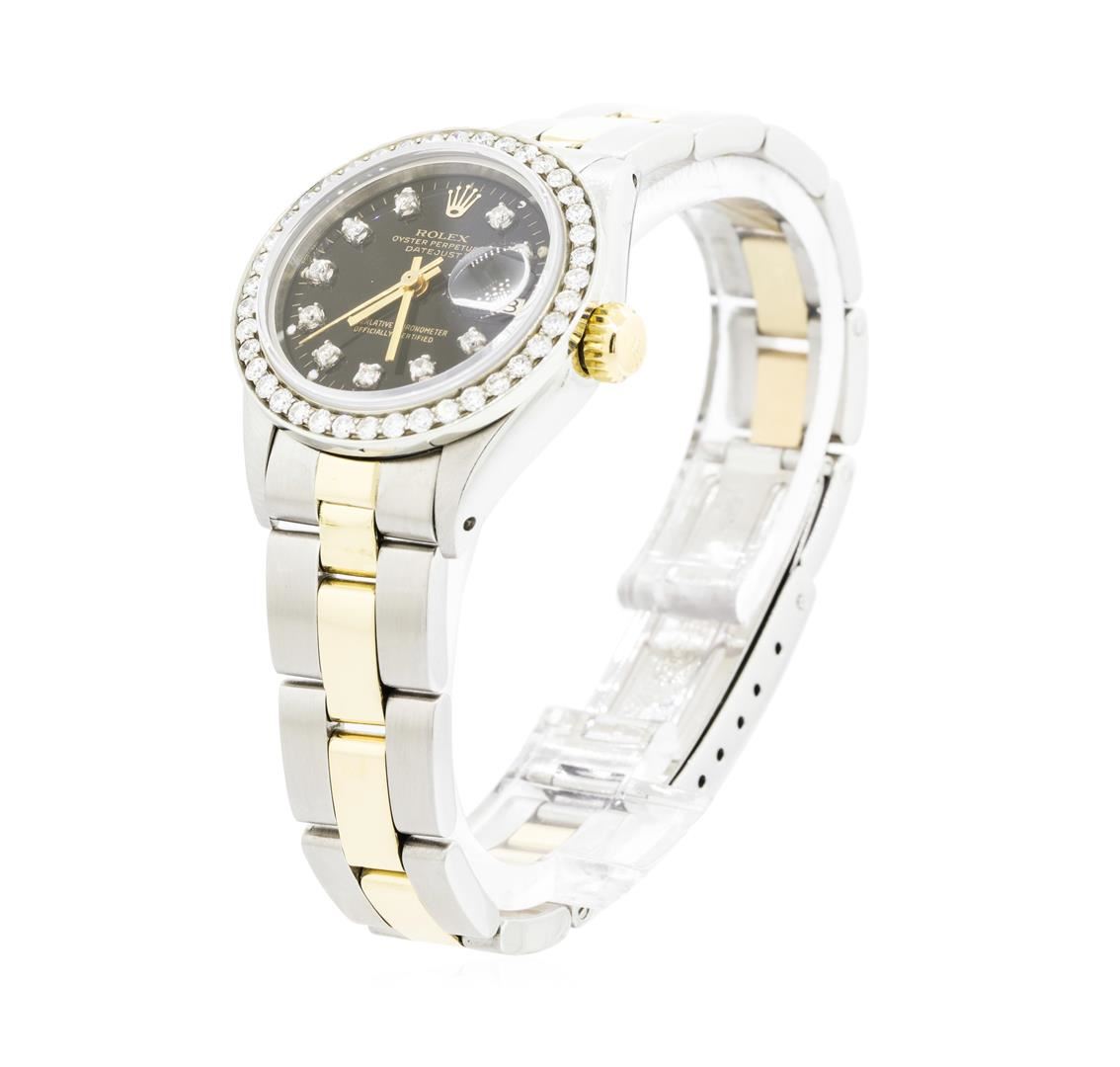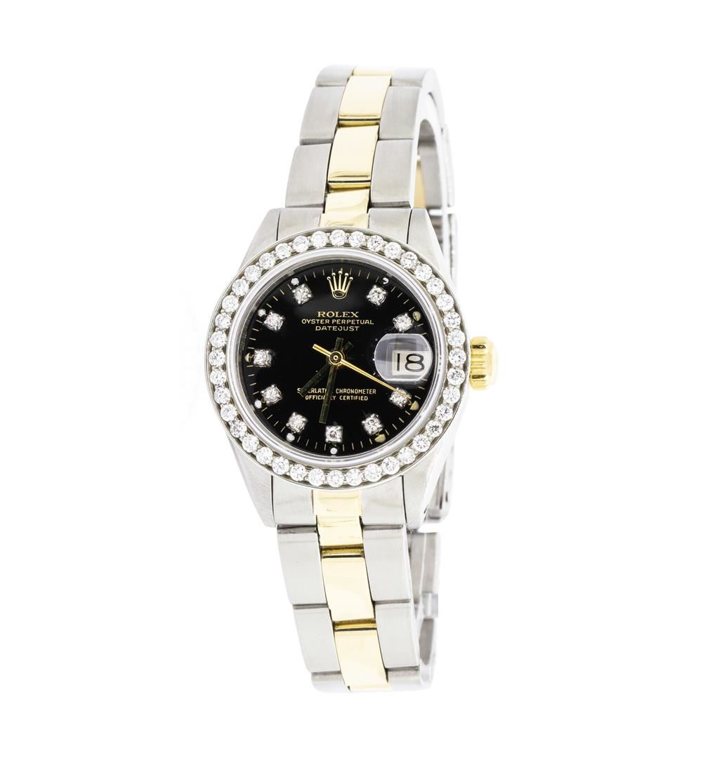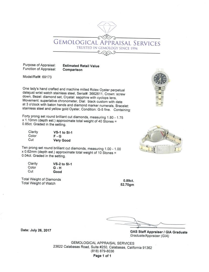 One Ladies, hand crafted and machine milled Rolex Oyster perpetual datejust wrist watch stainless steel, Serial#: 3662611, Crown: screw down, Bezel: diamond set, Crystal: sapphire with cyclops lens, Movement: superlative chronometer, Dial: black custom with date at 3 o'clock with baton hands and diamond marker numerals, Bracelet: stainless steel and yellow gold Oyster, Condition: G-5 fine. Containing: Forty prong set round brilliant cut diamonds, measuring 1.80 - 1.75 x 1.10mm (depth est.) approximate total weight of 40 Stones = 0.85ct. Graded in the setting. Color F - G Clarity VS-1 to SI-1 Cut Very Good Ten prong set round brilliant cut diamonds, measuring 1.00 - 1.00 x 0.62mm (depth est.) approximate total weight of 10 Stones = 0.04ct. Graded in the setting. Color G - H Clarity VS-2 to SI-1 Cut Good. Total Weight of Diamonds 0.89ct. Total Weight of Watch 52.70gm. GAS Appraised.