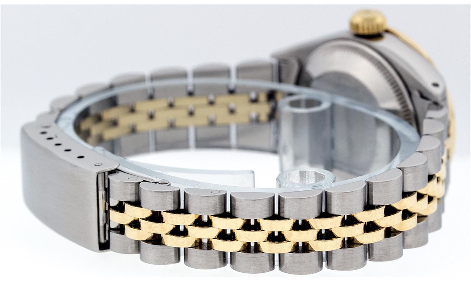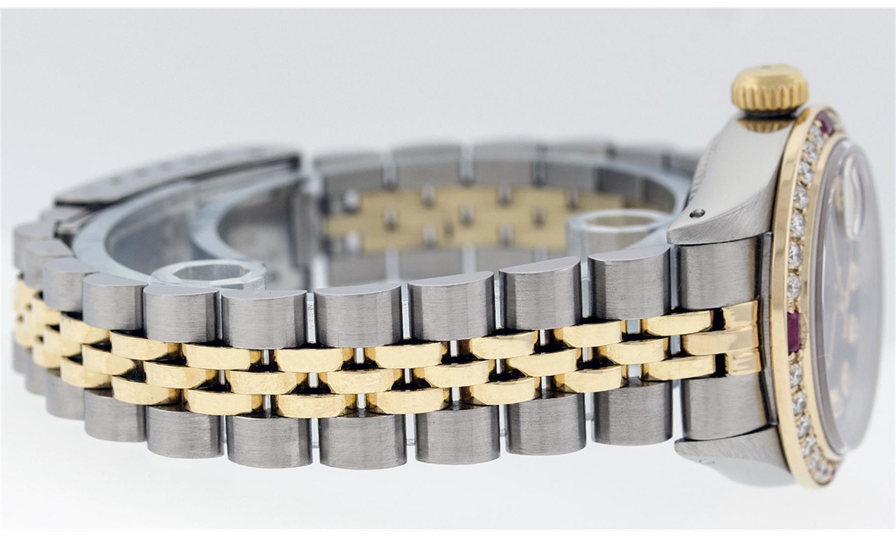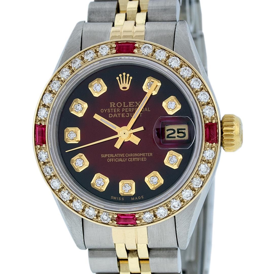 One Ladies Two Tone Rolex Datejust Polished, Serviced & Electronically Tested, 14K Yellow Gold & Stainless Steel Case:26mm, 14K Yellow Gold Crown, Custom Bezel: 18K Yellow Gold Ruby Beadset Diamond Bezel, Diamond Count: 28 Diamonds + 4 Rubies Total Weight .70 Carat, Clarity: Si-VS, Color: G to H. Custom Crystal: Synthetic Sapphire Cyclops Lens. Movement: Automatic Winding Movement Caliber 2030. Custom Dial: Dark Red Vignette With Diamond Hour Markers. 10 Diamonds In Dial, Clarity:Si-VS, Color: G to H. Date Window: 3 O'Clock Position Date Display, Non Quickset, Model: Datejust Condition: G-6 Extra Fine. Bracelet:Two Tone 14K Yellow Gold & Stainless Steel Jubilee. Bright Polish. 6.0 Inch Length, Adjustable. Standard Clasp, With Rolex Logo.