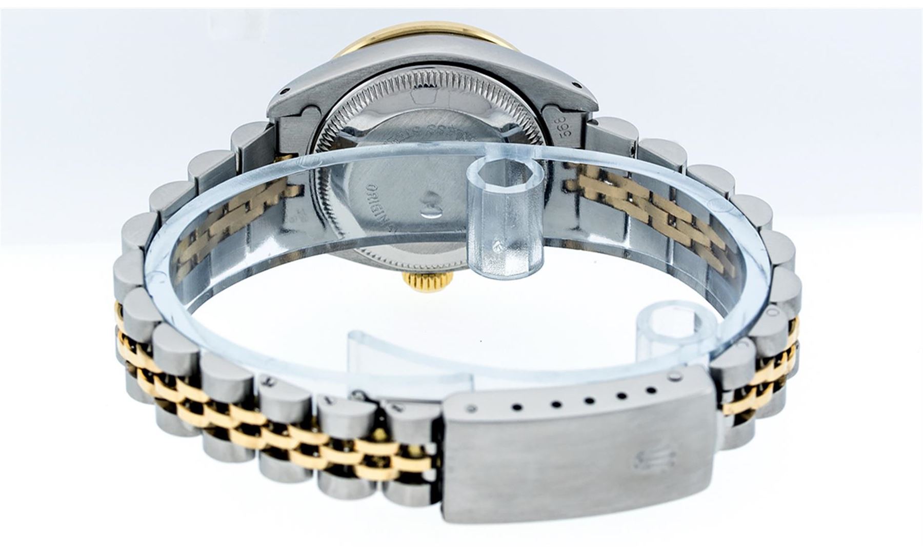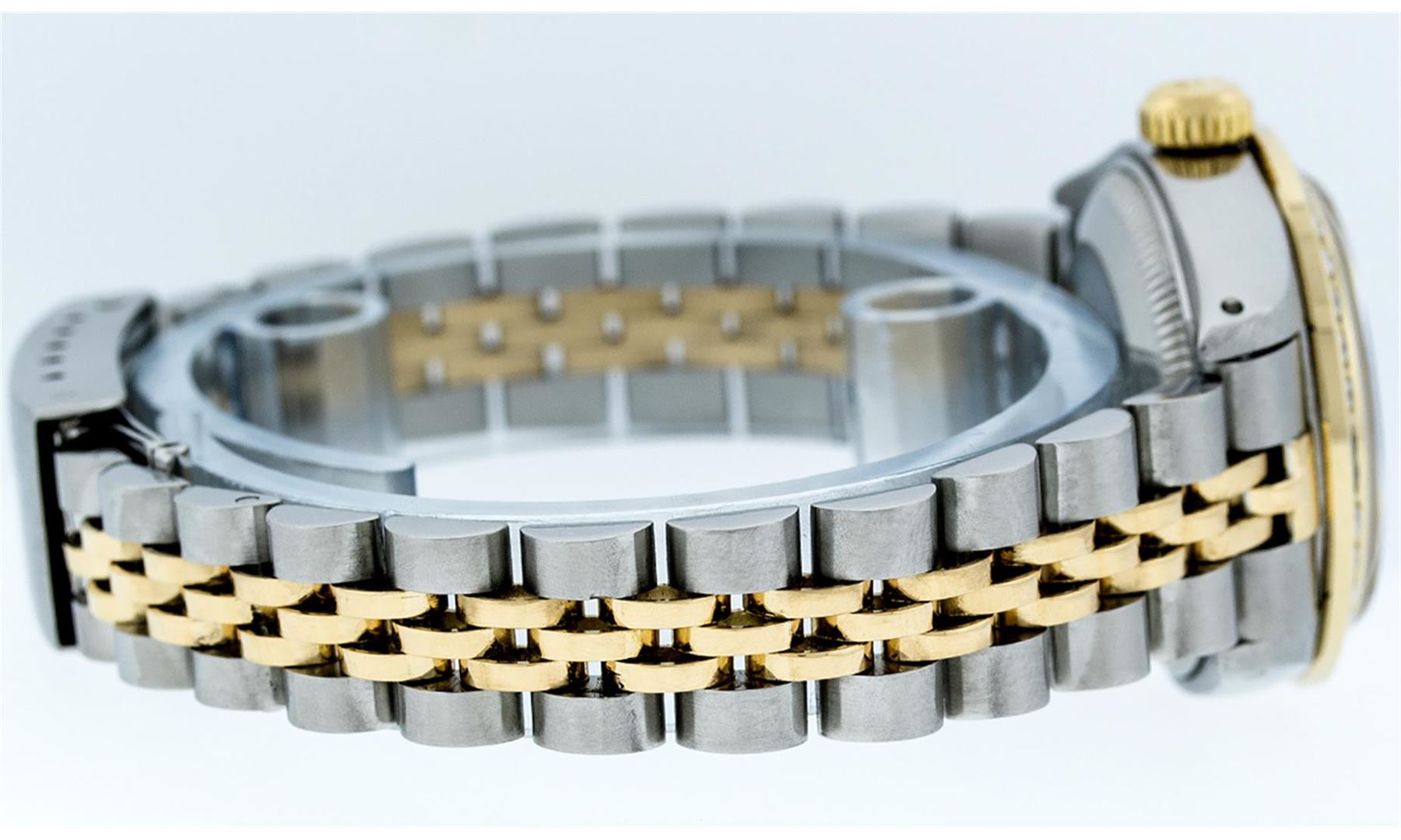 One Ladies Two Tone Rolex Datejust Polished, Serviced & Electronically Tested, 14K Yellow Gold & Stainless Steel Case:26mm, 14K Yellow Gold Crown, Custom Bezel: 18K Yellow Gold Ruby Beadset Diamond Bezel, Diamond Count: 28 Diamonds + 4 Rubies Total Weight .70 Carat, Clarity: Si-VS, Color: G to H. Custom Crystal: Synthetic Sapphire Cyclops Lens. Movement: Automatic Winding Movement Caliber 2030. Custom Dial: Dark Red Vignette With Diamond Hour Markers. 10 Diamonds In Dial, Clarity: Si-VS, Color: G to H. Date Window: 3 O'Clock Position Date Display, Non Quickset, Model: Datejust Condition: G-6 Extra Fine. Bracelet: Two Tone 14K Yellow Gold & Stainless Steel Jubilee. Bright Polish. 6.0 Inch Length, Adjustable. Standard Clasp, With Rolex Logo.
