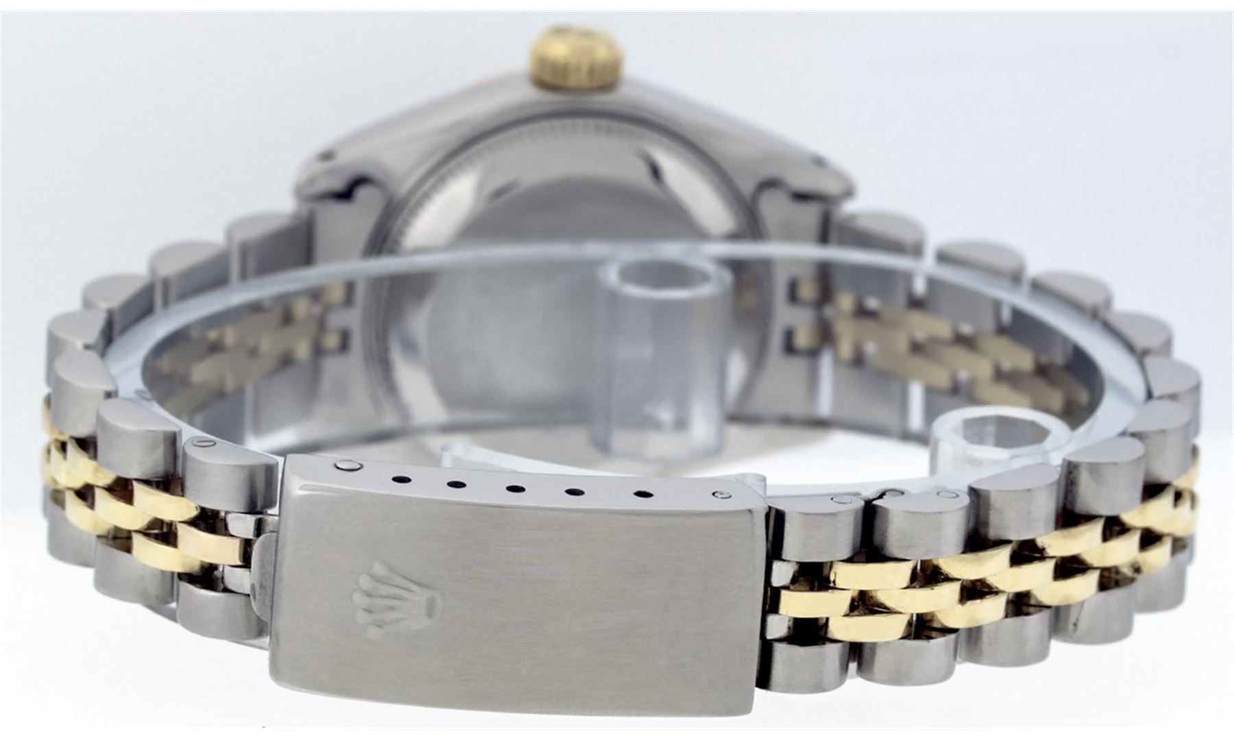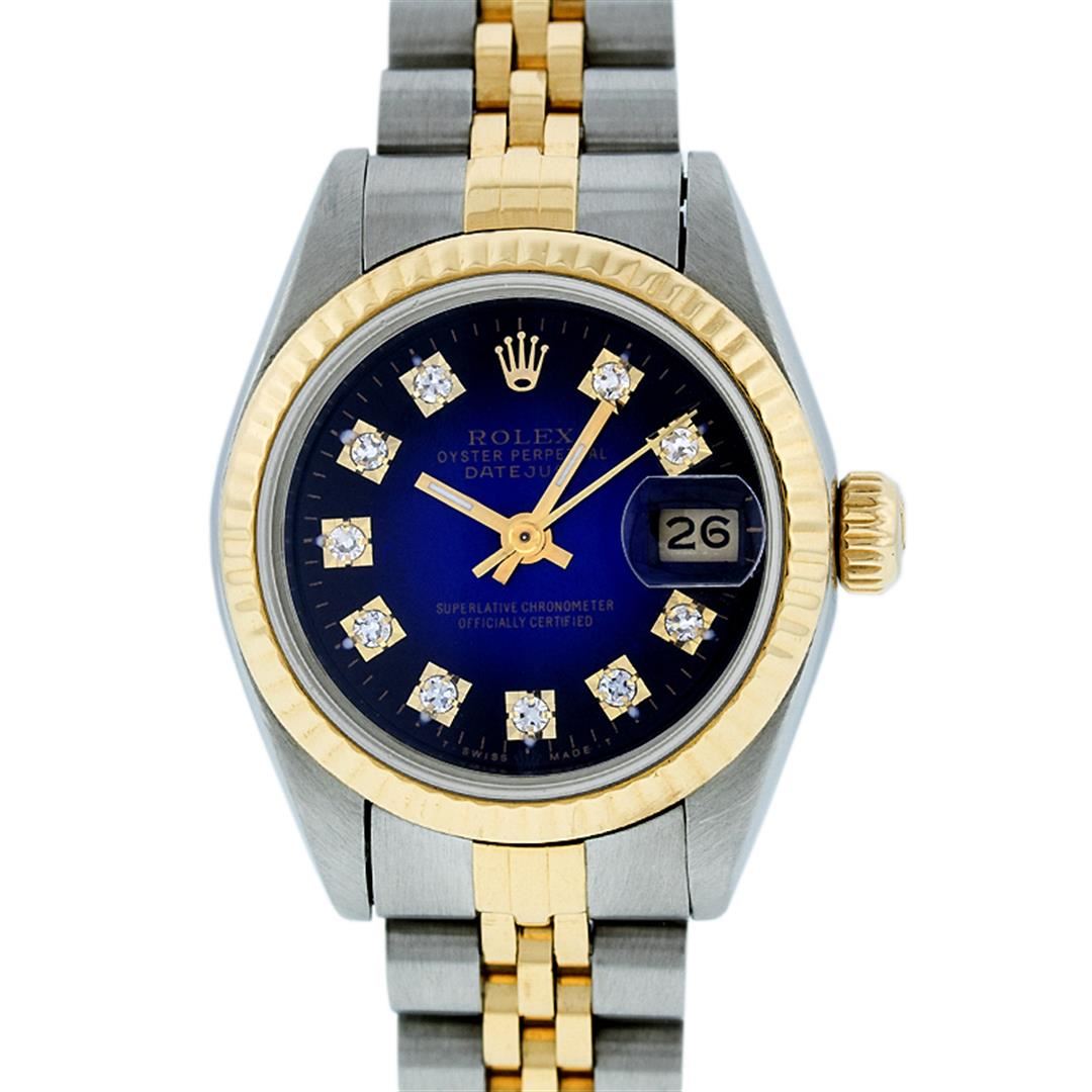One Ladies Two Tone Rolex Datejust Polished, Serviced & Electronically Tested, 14K Yellow Gold & Stainless Steel Case:26mm, 14K Yellow Gold Crown, Bezel: 14K Yellow Gold Fluted Bezel. Custom Crystal: Acrylic Cyclops Lens. Movement: Automatic Winding Movement Caliber 2030. Custom Dial: Blue Vignette With VS Diamond Hour Markers, Diamond Count: 10 Diamonds In Dial, Color: G to H, Clarity: VS. Date Window: 3 O'Clock Position Date Display, Model: Datejust, Condition: G-6 Extra Fine. Bracelet: Two Tone 14K Yellow Gold & Stainless Steel Jubilee. Bright Polish. 5.5 Inch Length, Adjustable. Standard Clasp, With Rolex Logo.