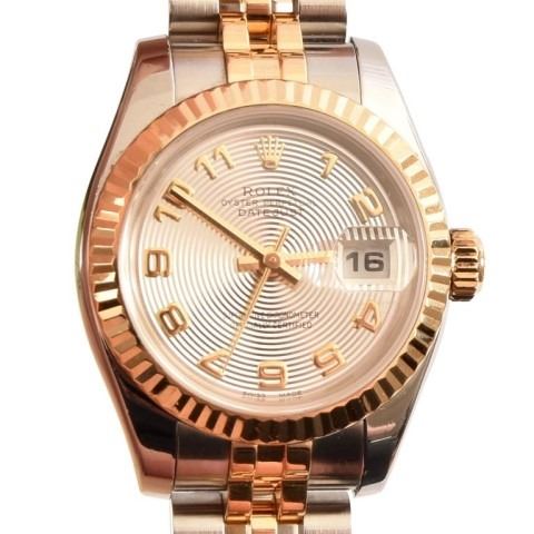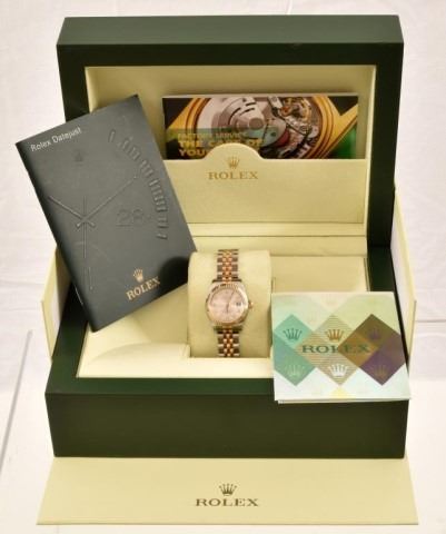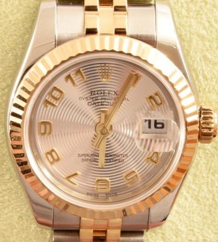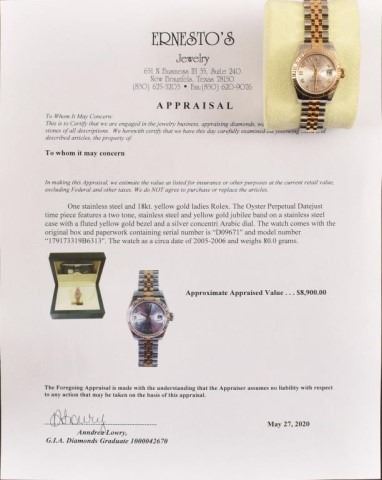 *With Appraisal. Approximate Appraisal Value: $8,900. One stainless steel and 18kt yellow gold ladies Rolex. The oyster Perpetual Datejust time piece features a two tone, stainless steel and yellow gold jubilee band on a stainless steel case with a fluted yellow gold bezel and a silver concentri Arabic dial. The watch comes with the original box and paperwork containing serial number "D09671" and model number "179173319B6313". The watch as a circa date off 2005-2006 and weighs 80.0 grams.