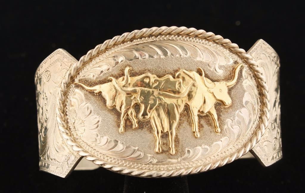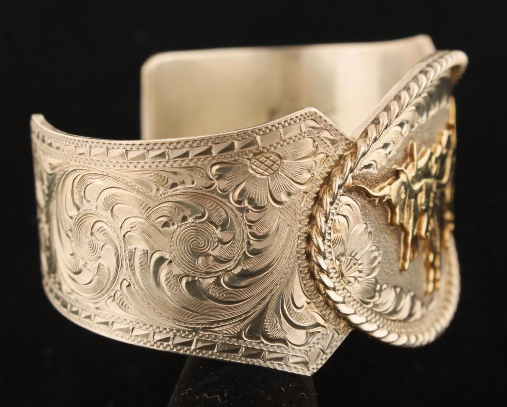 Accented with 14K yellow gold longhorn design surrounded by engraved floral sterling. Stamped 'XX for Vic Vasquez'.