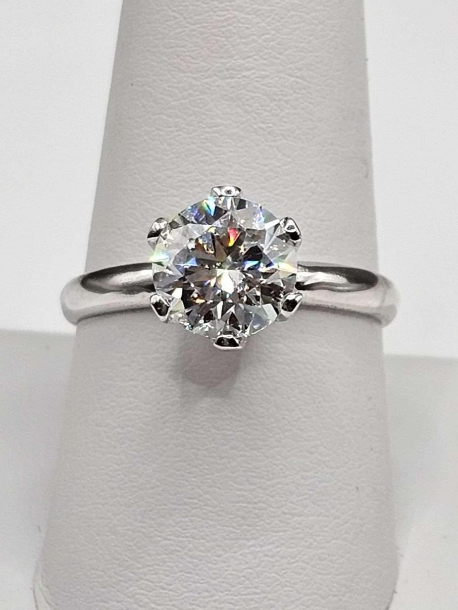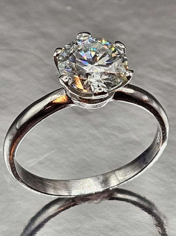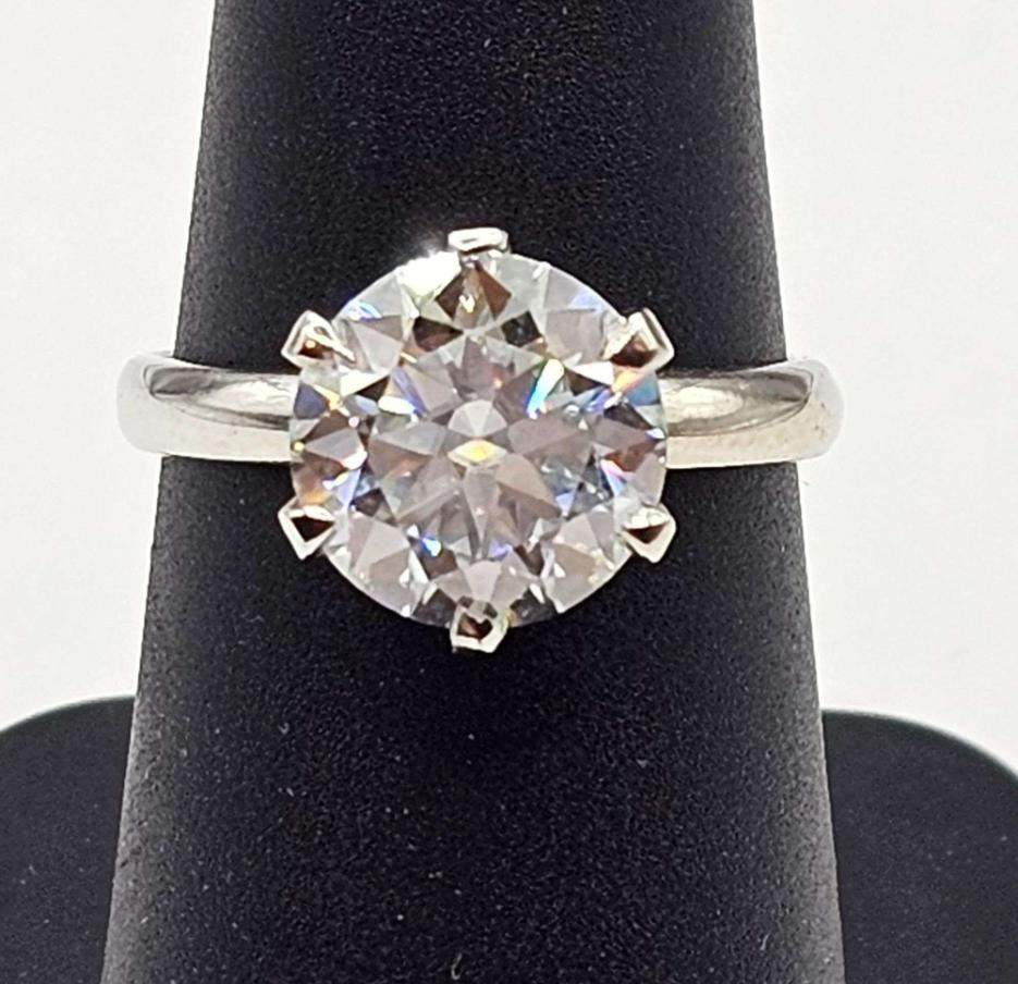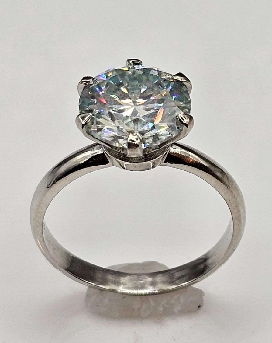 This Huge 3 Ct White E-F VVs1 Simulated Lab Diamond Solitaire is a Brilliant Round Cut Measuring 9 mm. , It is eye clean and bursting out with a full spectrum of colors. It Is Mounted In Tri-Layered 14 Kt White Gold over Solid .925 Sterling Silver with 14 Kt White Gold Overlay, which gives this ring its high polish and shine. With a 9.25 to 9.5 rating on the mohs hardness scale this simulated diamond will test positive for a diamond with almost any diamond tester.***It is also conflict free and earth friendly***. Ring size 7. The total weight is approx. 2.9 grams. Simply Gorgeous!!!