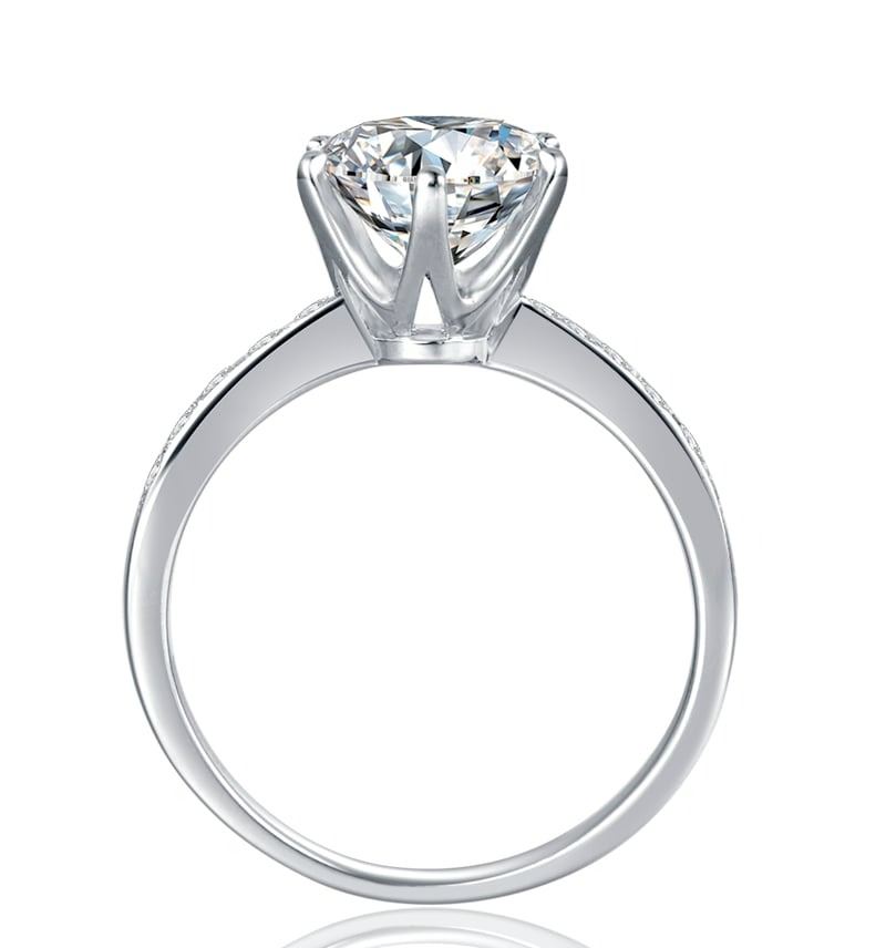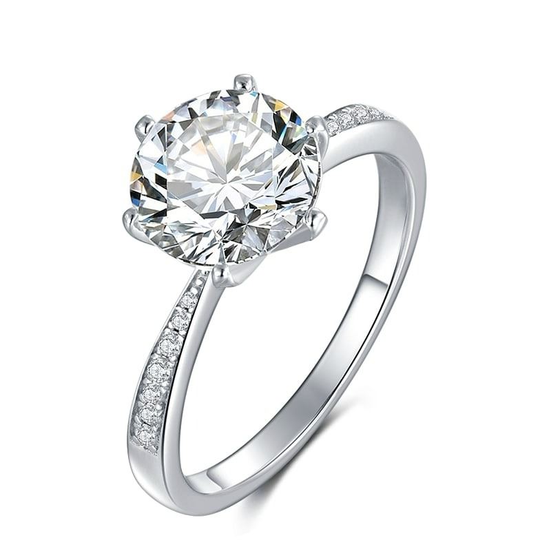 This Large 3 Ct Moissanite Centerstone is a VVS1 Brilliant 9 mm. Round Cut. The Color is White G-H. It is near flawless and bursting out with a full spectrum of colors. This Moissanite Ring is complimented with cz accent stones. Mounted in .925 solid sterling silver with 14 Kt White Gold Overlay, which gives the ring its high polish and shine. It weighs approx. 10 total grams. With a refractive index of 2.65-2.69 exhibits more fire and brilliance than a natural diamond. Total weight of this ring is 2.8 grams. Ring size 7.
