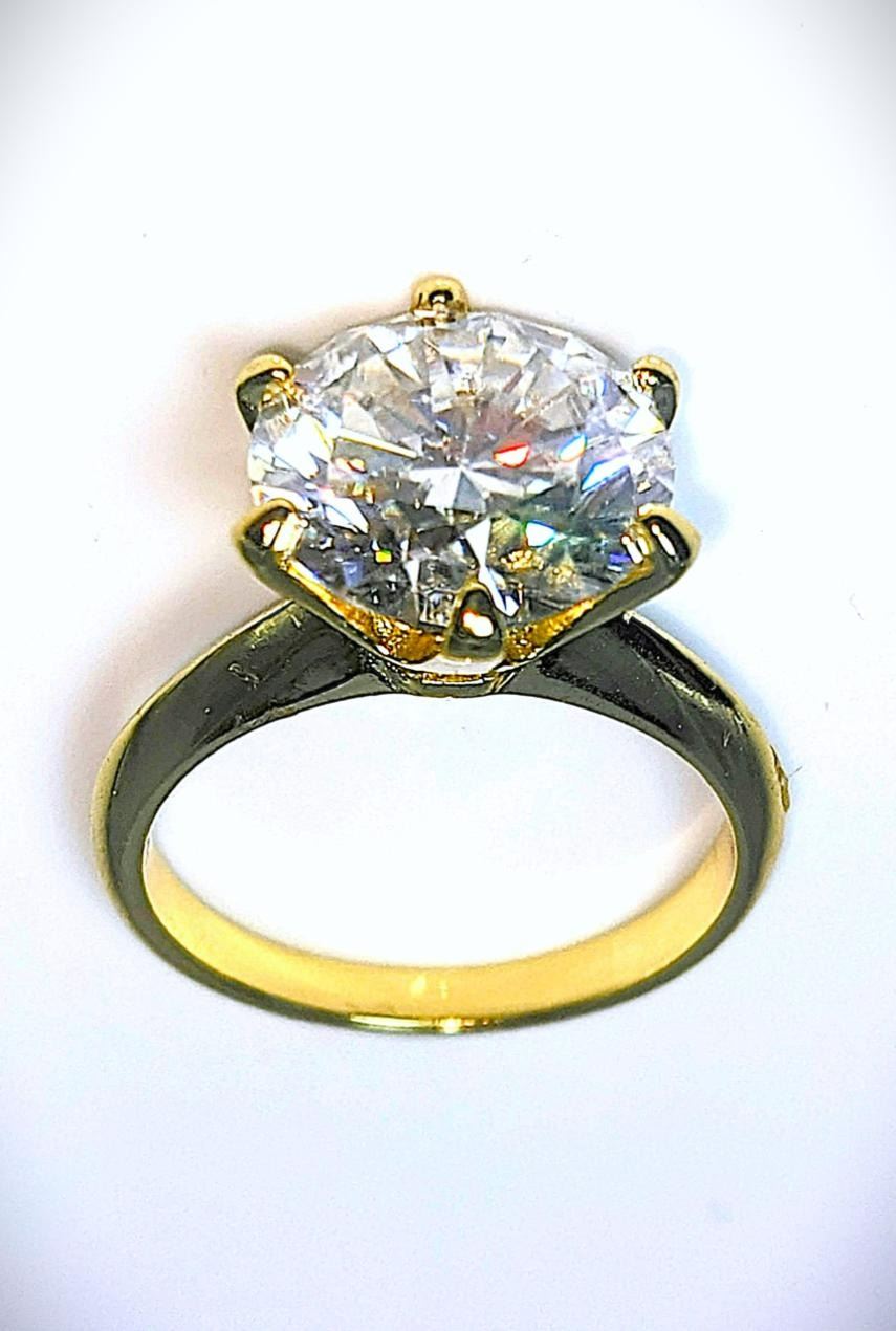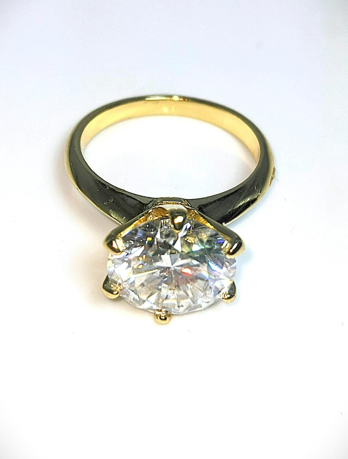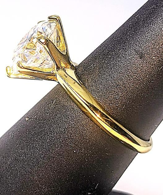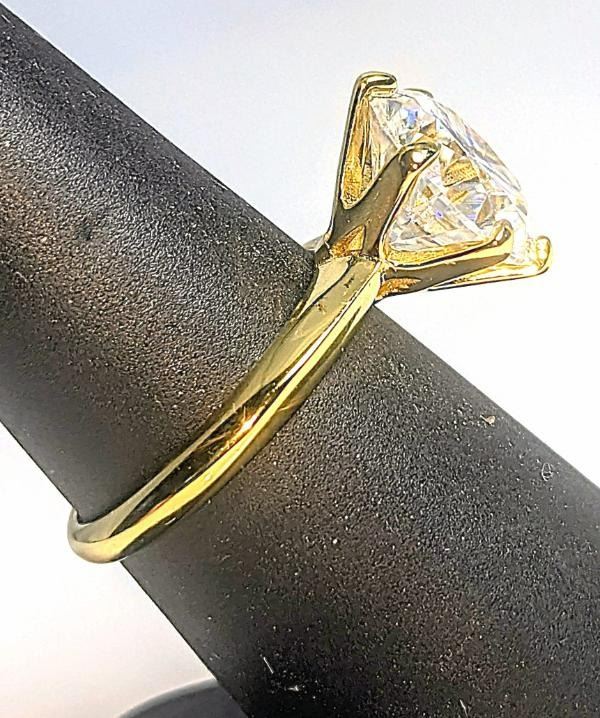 This Huge 5 Ct Lab Simulated Diamond Solitaire is a Brilliant Round Cut Measuring 11 mm. The Color is Bright Ice White. It is eye clean and bursting out with a full spectrum of colors. It Is Mounted In 14 Kt Yellow Gold which gives this ring its high polish and shine. With a 9.25 to 9.5 rating on the mohs hardness scale this simulated diamond will test positive for a diamond with almost any diamond tester.***It is also conflict free and earth friendly***. Ring size 8. The total weight is approx. 4.4 grams. Simply Gorgeous!!!