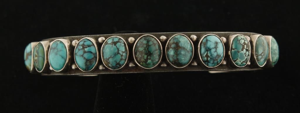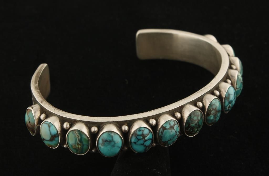 (13) Oval cut turquoise stones in sterling silver. Hallmarked with "DB" over "Sterling" with image of bent arrow. Approx 2-1/2" inside measurement with 1-/2" gap.