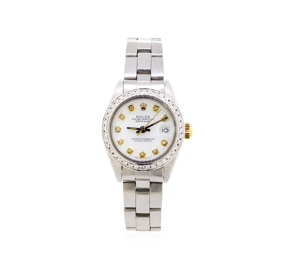 One ladies, hand crafted & machine milled Rolex DateJust model stainless steel wristwatch electronically tested, Case: 26mm oyster, 14KT Yellow gold Crown: twinlock with logo, non-factory Custom Bezel: diamond set, Crystal: acrylic cyclops lens, Circa: 1982. Movement: superlative chronometer, Rolex signed Customized Dial: Porcelain White color, with baton hands & diamond markers, Date Window: 3 o'clock position, non-quick set, Condition: G-5 Fine. Rolex Bracelet: stainless steel tapering oyster links. Six and one half inch length, adjustable. Bright polish & satin finish. Standard clasp, with logo. Containing: Forty round brilliant cut diamonds, measuring an average of 1.50mm in diameter, approximate total weight of 40 Stones = 0.52ct. Set & graded in the custom bezel. Clarity: SI-1 to I-1. Color: G - I. Total Weight of Diamonds 0.52ct. Total Weight of Watch 50.13gm. AIG Appraised at $6,050.00.