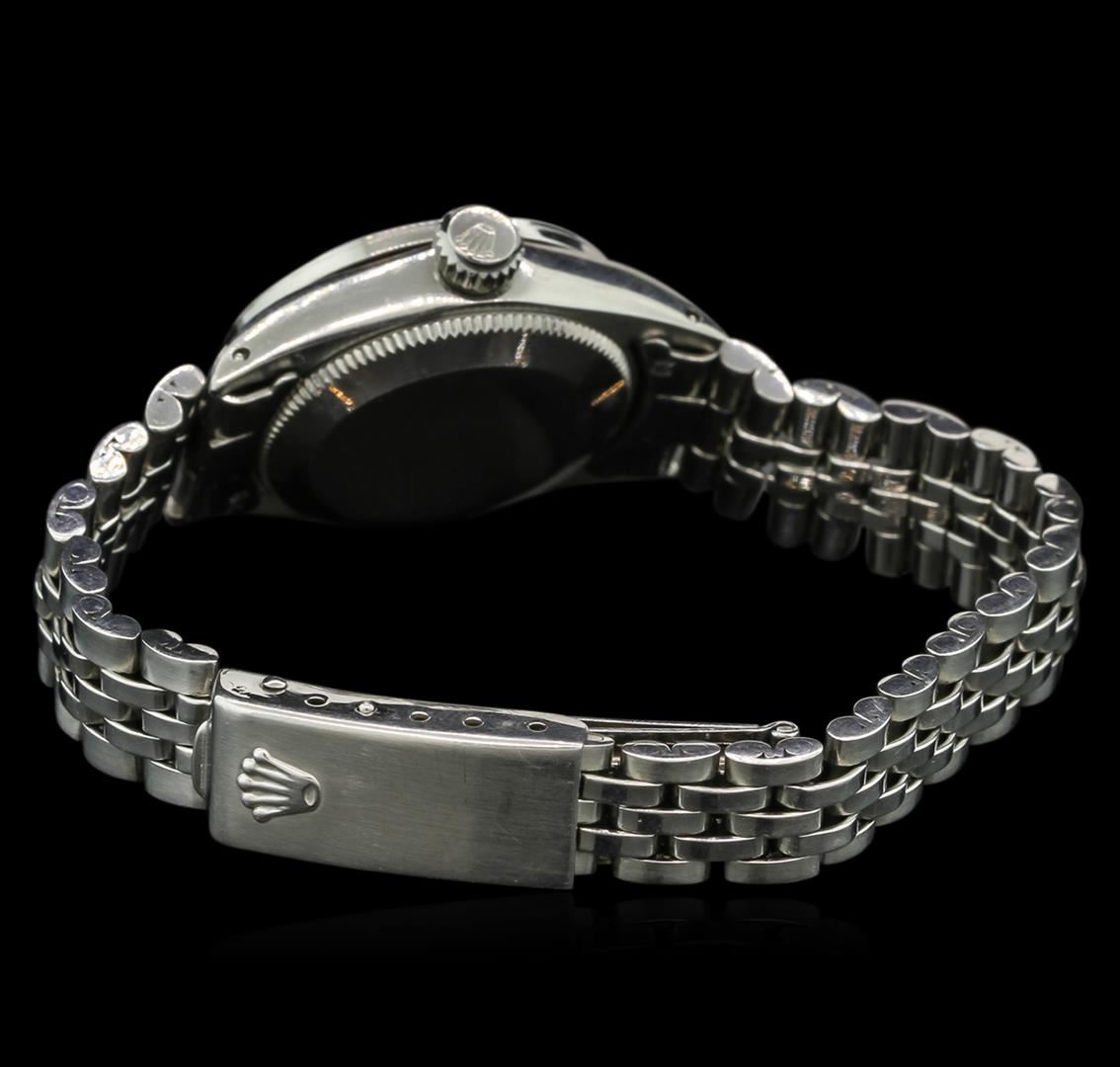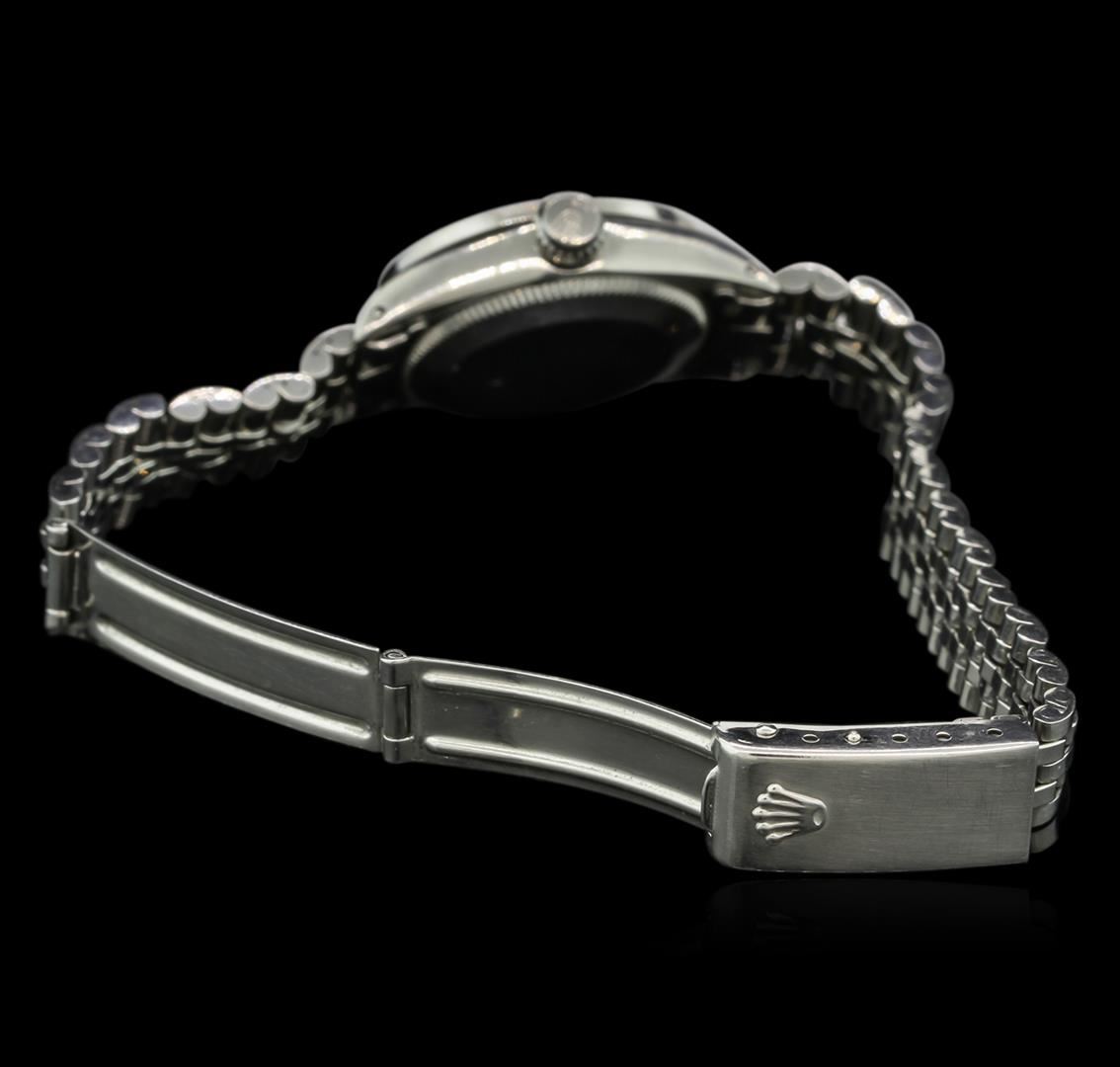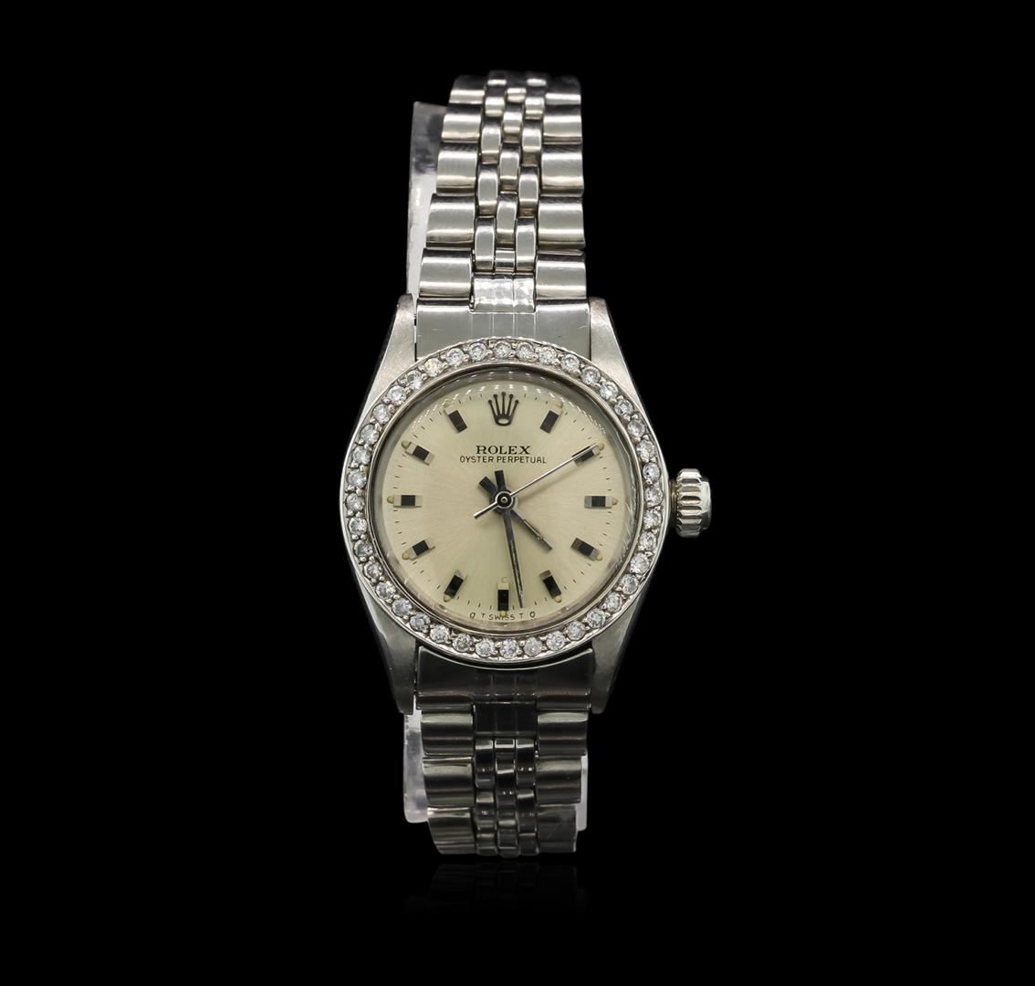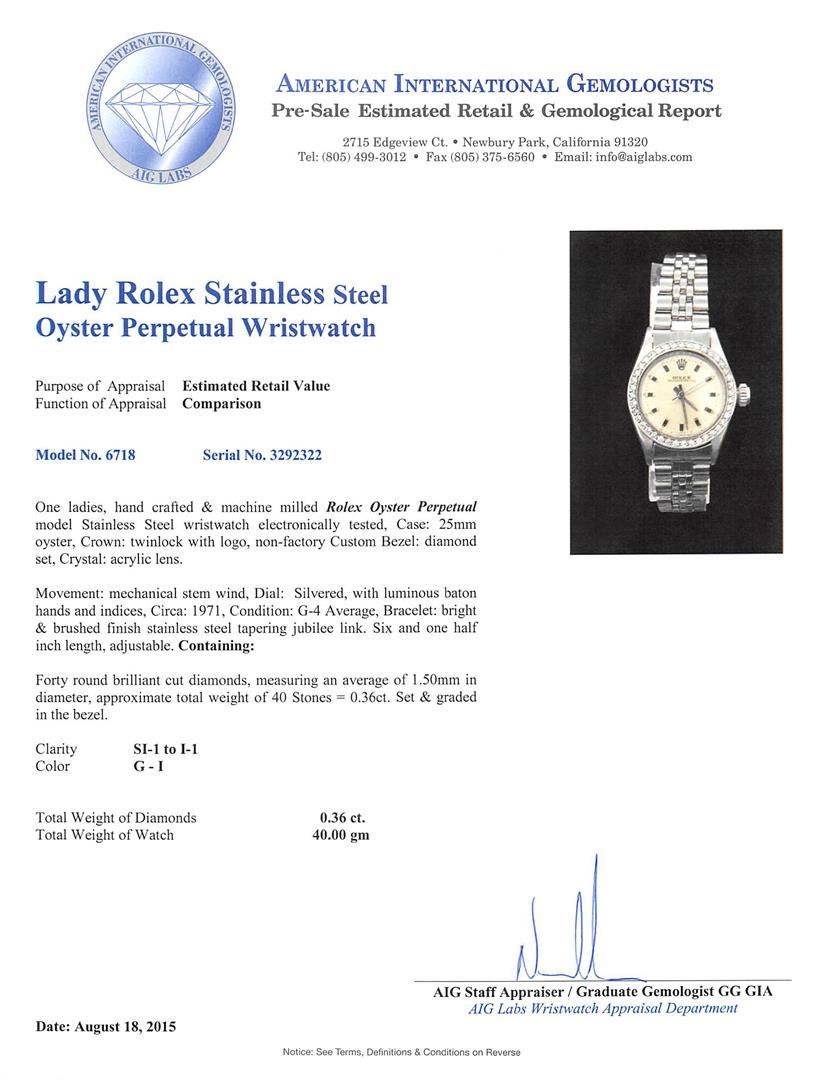 One ladies, hand crafted & machine milled Rolex Oyster Perpetual model Stainless Steel wristwatch electronically tested, Case: 25mm oyster, Crown: twinlock with logo, non-factory Custom Bezel: diamond set, Crystal: acrylic lens. Movement: mechanical stem wind, Dial: Silvered, with luminous baton hands and indices, Circa: 1971, Condition: G-4 Average, Bracelet: bright & brushed finish stainless steel tapering jubilee link. Six and one half inch length, adjustable. Containing: Forty round brilliant cut diamonds, measuring an average of 1.50mm in diameter, approximate. Total Weight of 40 Stones = 0.36ct. Set & graded in the bezel. Clarity: SI-1 to I-1. Color: G - I. Total Weight of Diamonds 0.36ct. Total Weight of Watch 40.00gm. AIG Appraised.