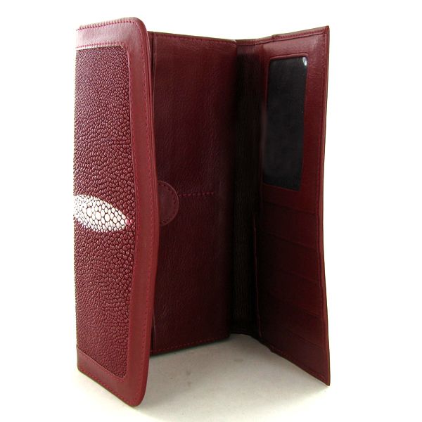 Well made; brand new ladies Stingray Hide burgundy clutch purse/wallet. 7.5" x 4" x 1" when folded. Multiple inside sections; one zippered with multiple dividers and a smaller zippered section inside and one with multiple bill and card dividers