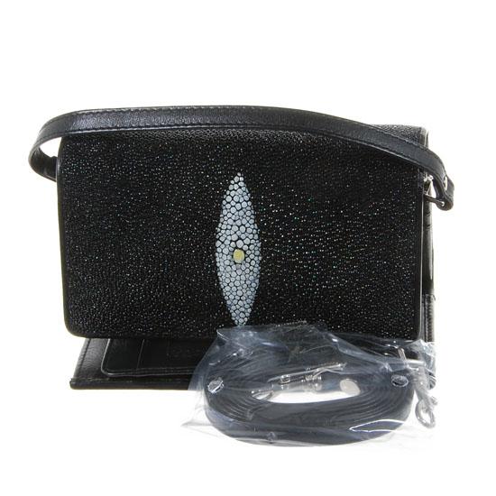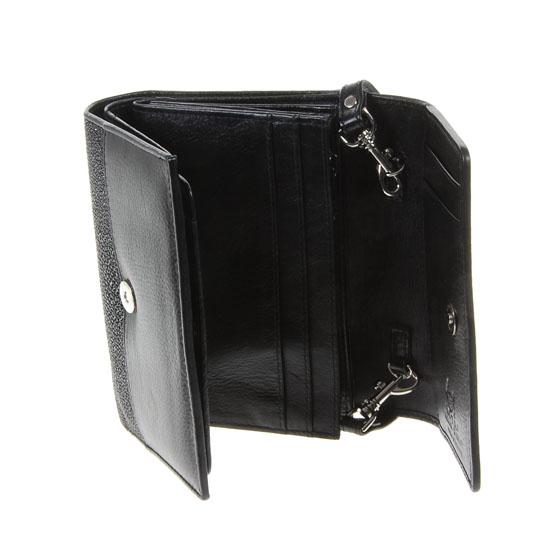 Well made; brand new ladies Stingray Hide black clutch purse/wallet. 6" x 4.5" x 1.75" when folded. Multiple inside sections; one zippered with multiple dividers and a smaller zippered section inside and one with multiple bill and card dividers; with shou
