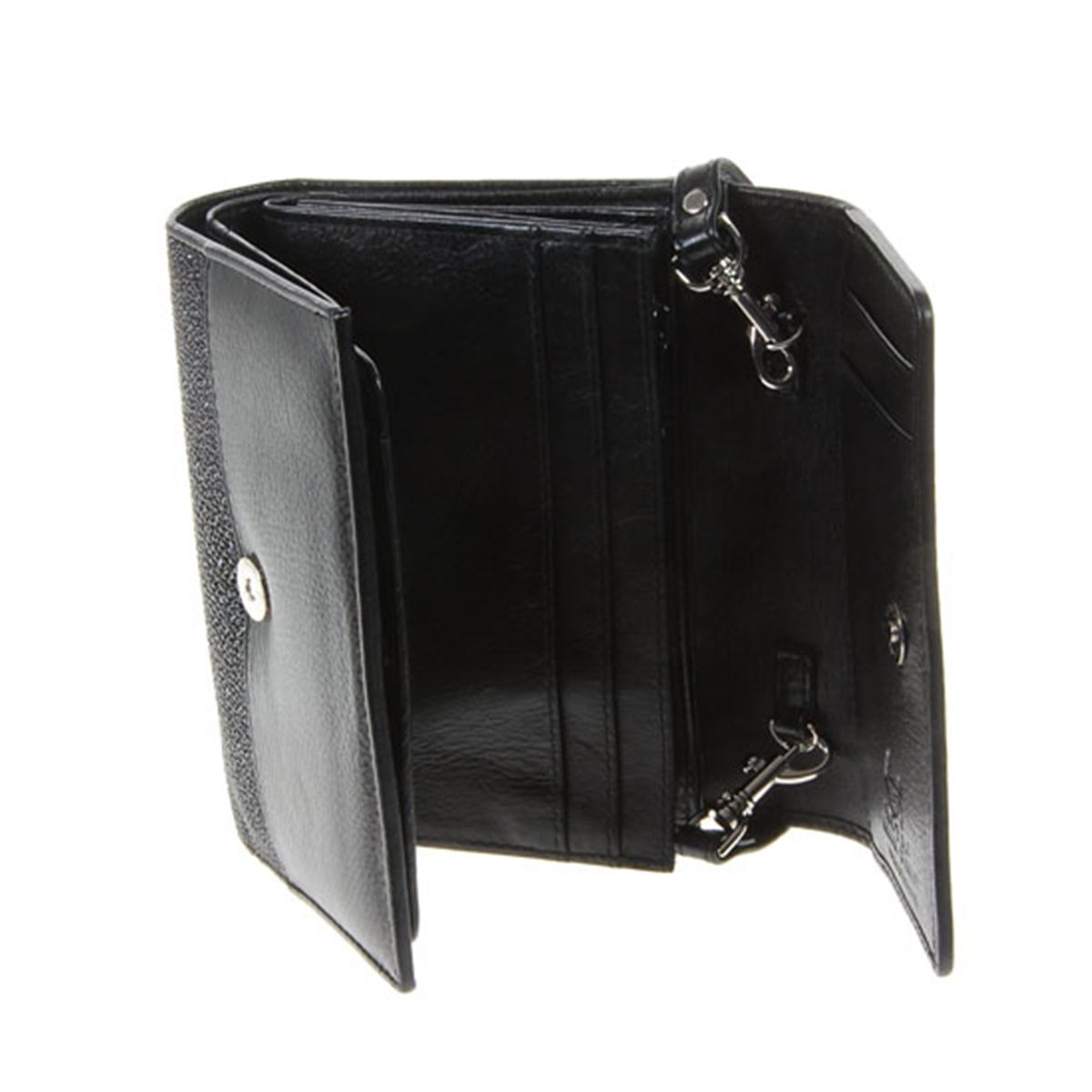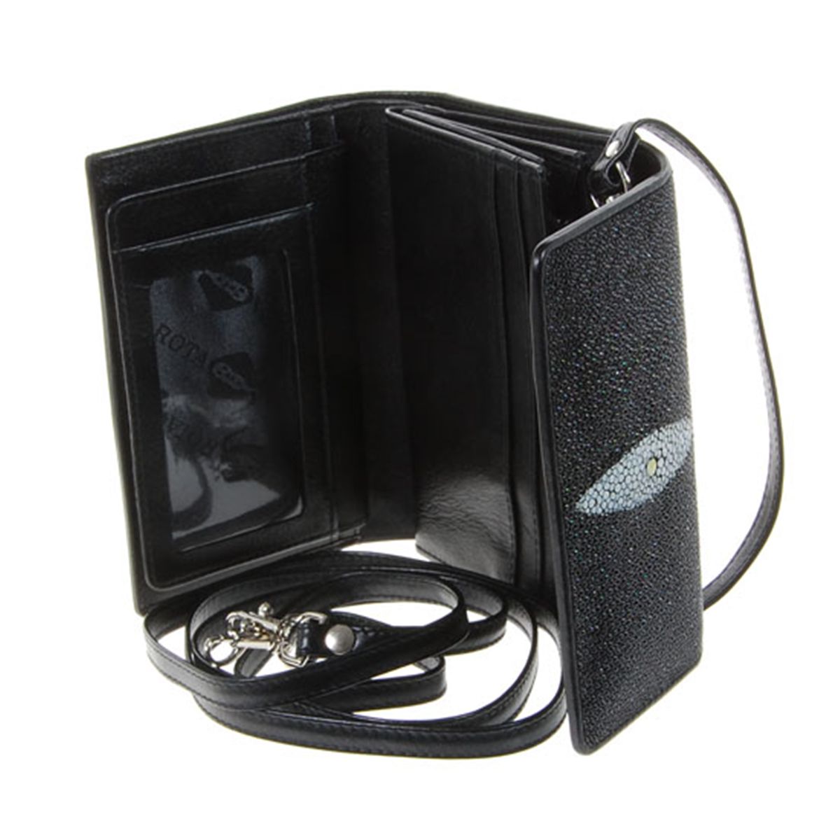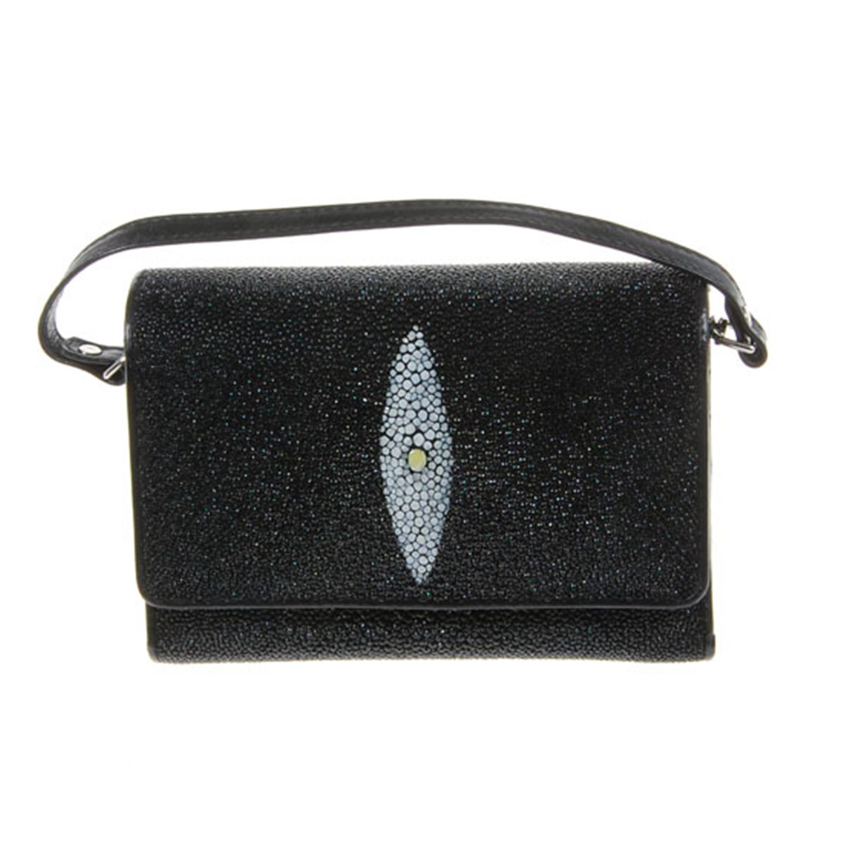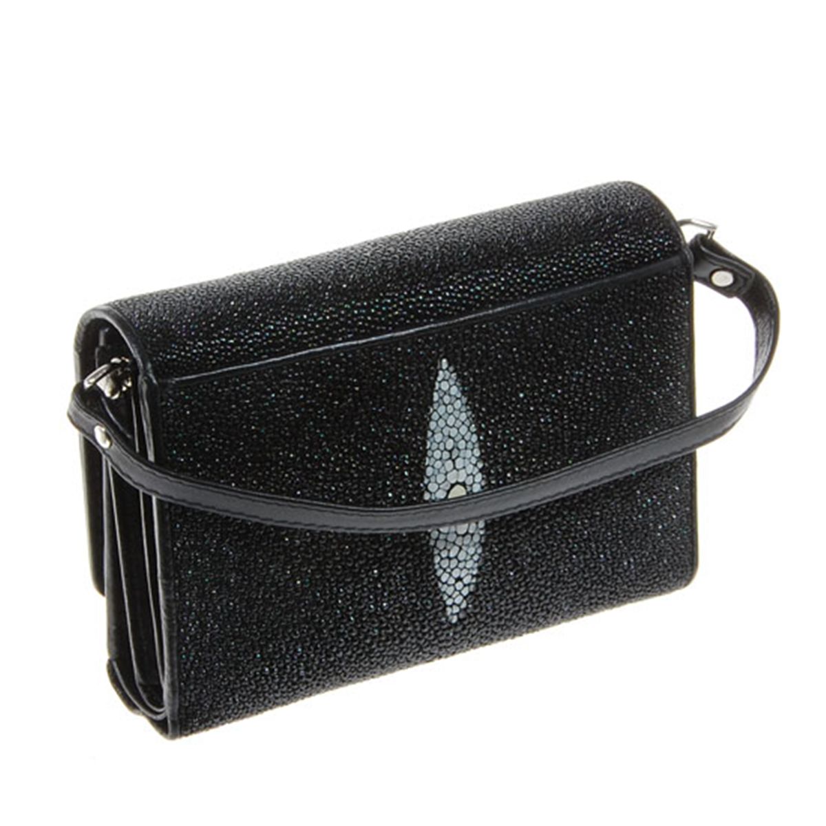 Well made; brand new ladies Stingray Hide black clutch purse/wallet. 6" x 4.5" x 1.75" when folded. Multiple inside sections; one zippered with multiple dividers and a smaller zippered section inside and one with multiple bill and card dividers; with shou