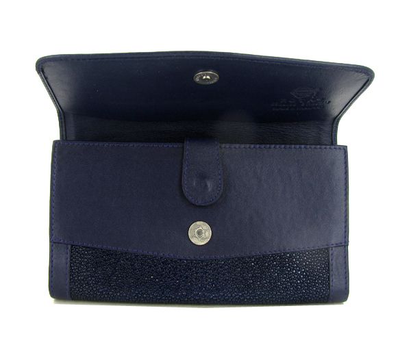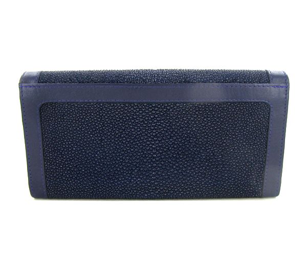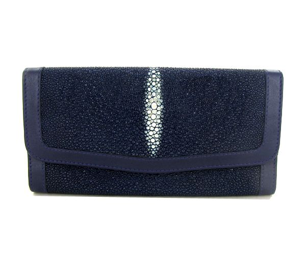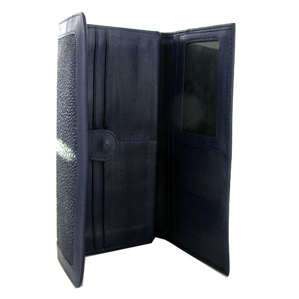 Well made; brand new ladies Stingray Hide navy blue clutch purse/wallet. 7.5" x 4" x 1" when folded. Multiple inside sections; one zippered with multiple dividers and a smaller zippered section inside and one with multiple bill and card dividers