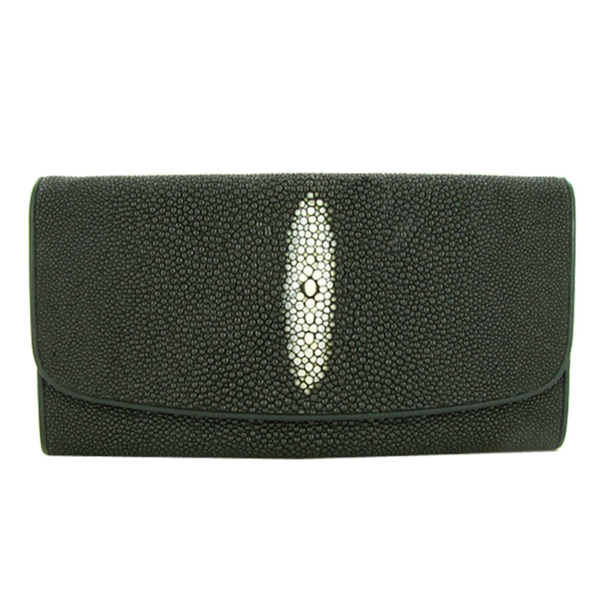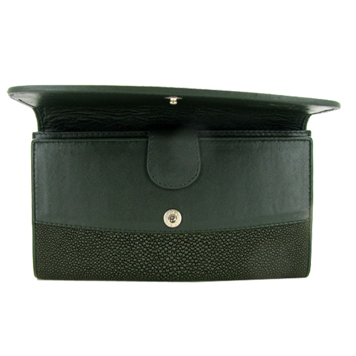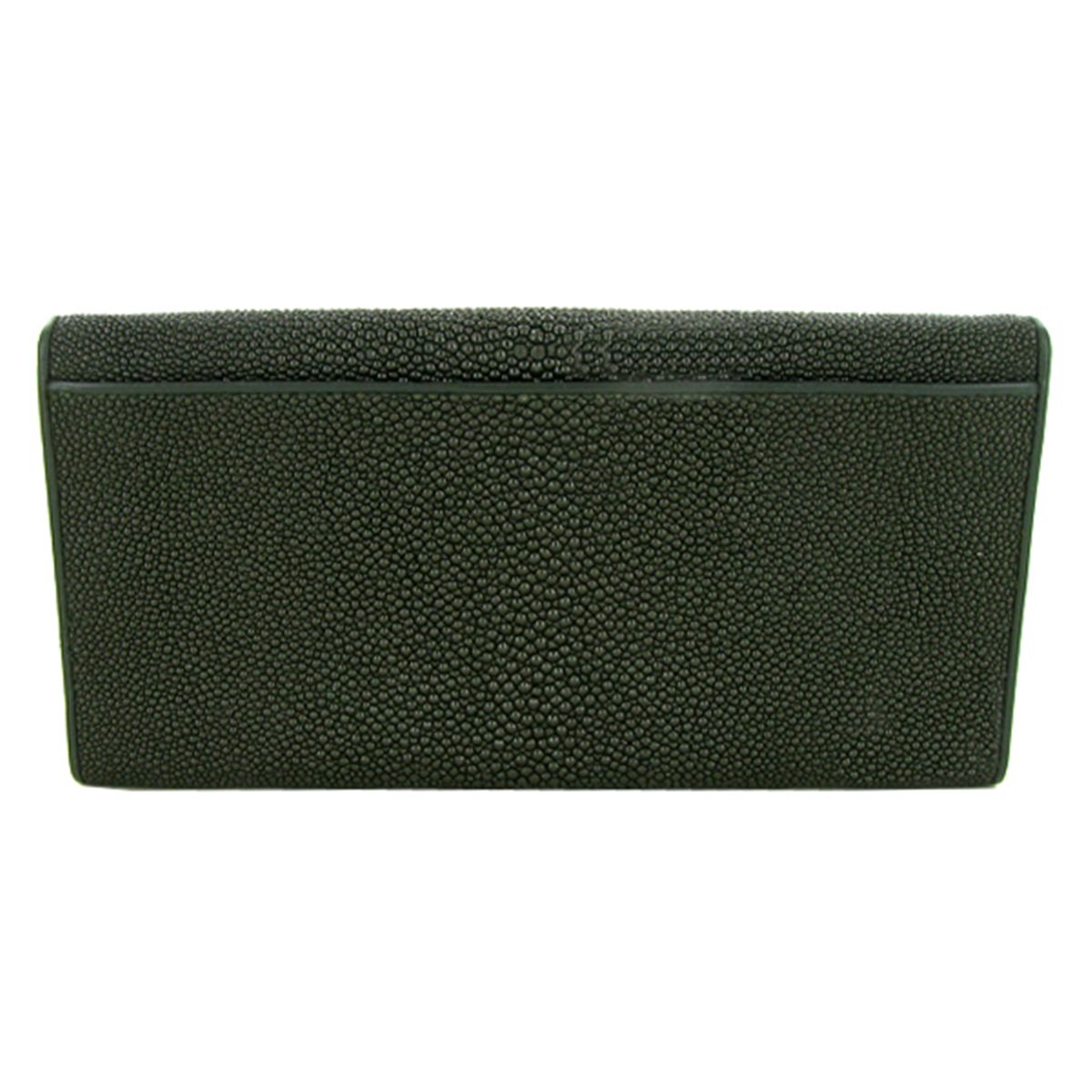 Well made; brand new ladies Stingray Hide dark green clutch purse/wallet. 7.5" x 4" x 1" when folded. Multiple inside sections; one zippered with multiple dividers and a smaller zippered section inside and one with multiple bill and card dividers